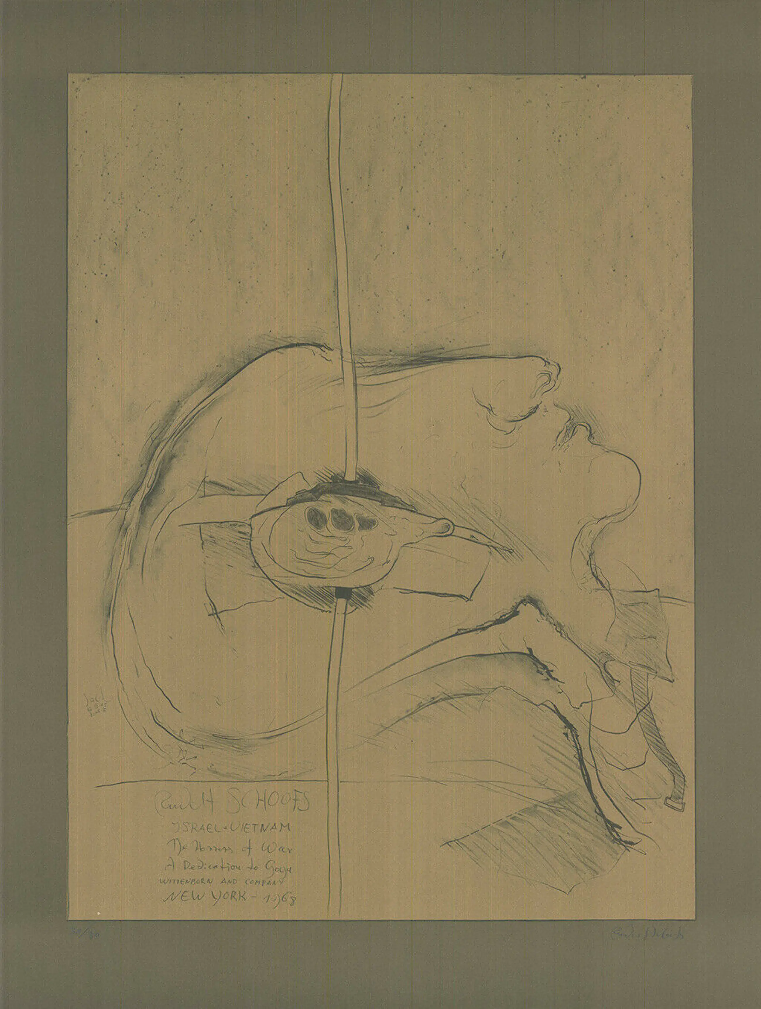 Originele kleurenlithografie van de aluminium plaat, met de hand gesigneerd, genummerd en opnieuw gesigneerd in de druk linksonder. Op BFK Rives gevergeerd papier. 63,5 x 48,0 cm. Oplage 80, exemplaar 28/80. Exemplaren 1 t/m 20 zijn niet te koop. Blad uit een serie van tien litho's met als titelpagina 'Israel and Vietnam - The horrors of war - Hommage à Goya' is gemaakt tussen juni 1967 en maart 1968. Gedrukt door de offsetpers volgens een grafisch-optisch procédé. Uitgever George Wittenborn, New York, 1018 Madison Avenue. Lit.: Gemeentelijke Kunstgalerie Bochum 27.4. tot 30 mei 1968, afb. 21. Nieuwstaat. In zijn grafiek verwerkte Rudolf Schoofs zowel landschappelijke als architectonische specificaties zonder het object zelf te thematiseren, maar zijn persoonlijke gevoelens. Het aangeboden kunstwerk is zorgvuldig gecontroleerd op originaliteit, echtheid, authenticiteit en staat. Inspectie en afhaling ter plaatse op elk moment mogelijk. BIJ AANKOOP VAN MEERDERE ARTIKELEN WORDEN DE VERZENDKOSTEN SLECHTS EENMAAL IN REKENING GEBRACHT, INDIEN DE GEKOCHTE ARTIKELEN IN ÉÉN PAKKET KUNNEN WORDEN VERZONDEN! HET HOOGSTE BEDRAG AAN VERZENDKOSTEN EENMAAL ALS VERZENDKOSTEN!