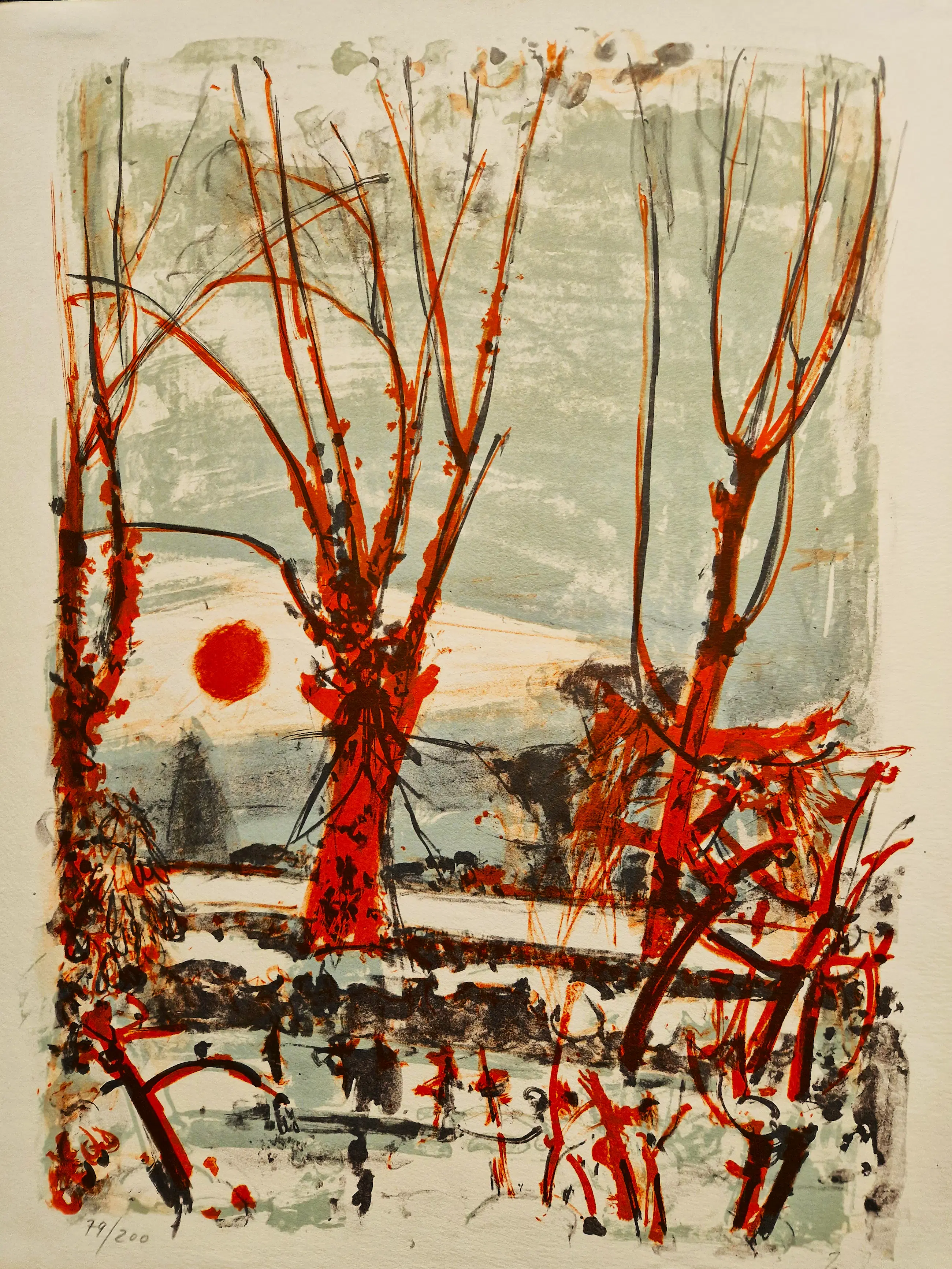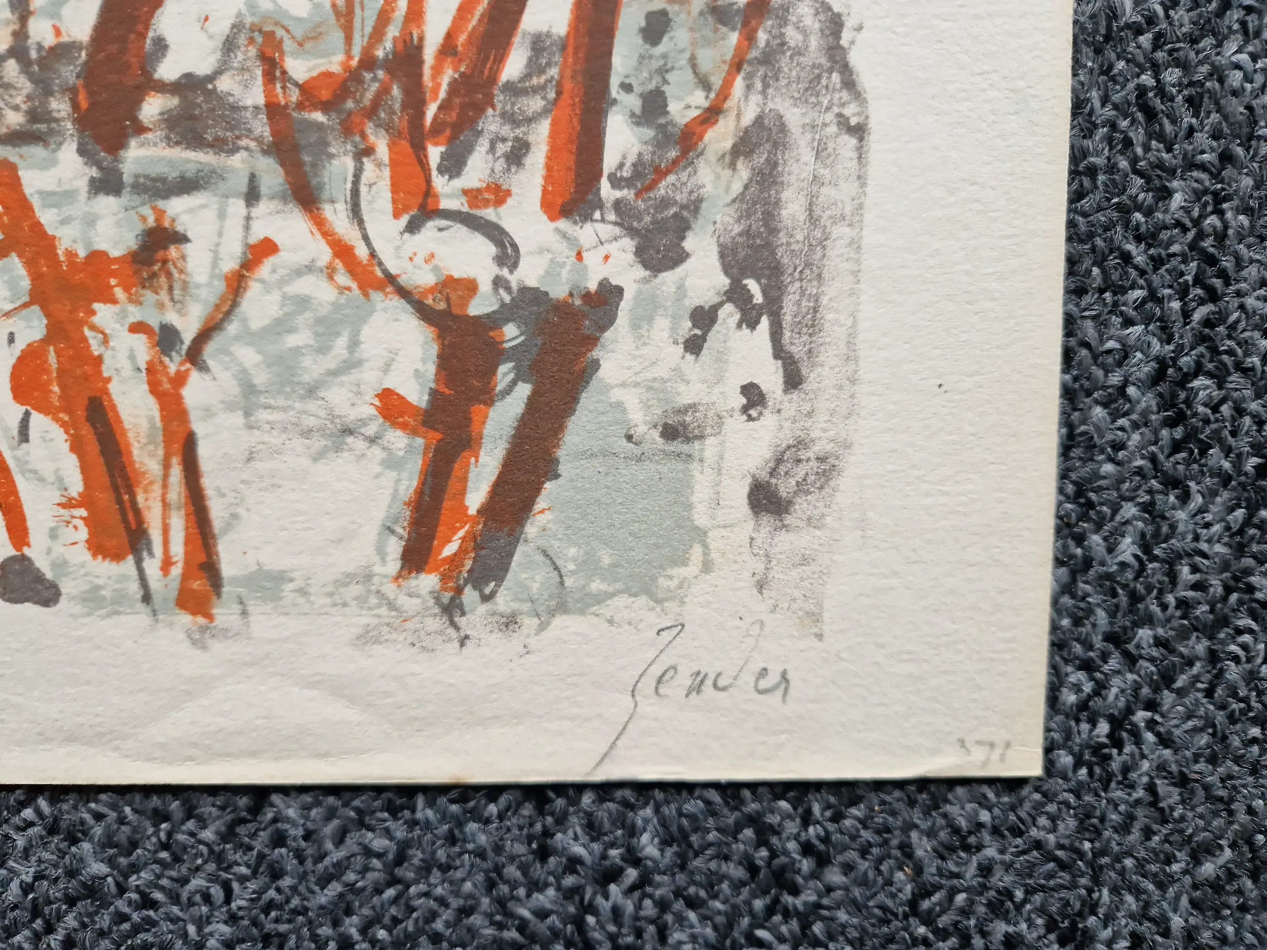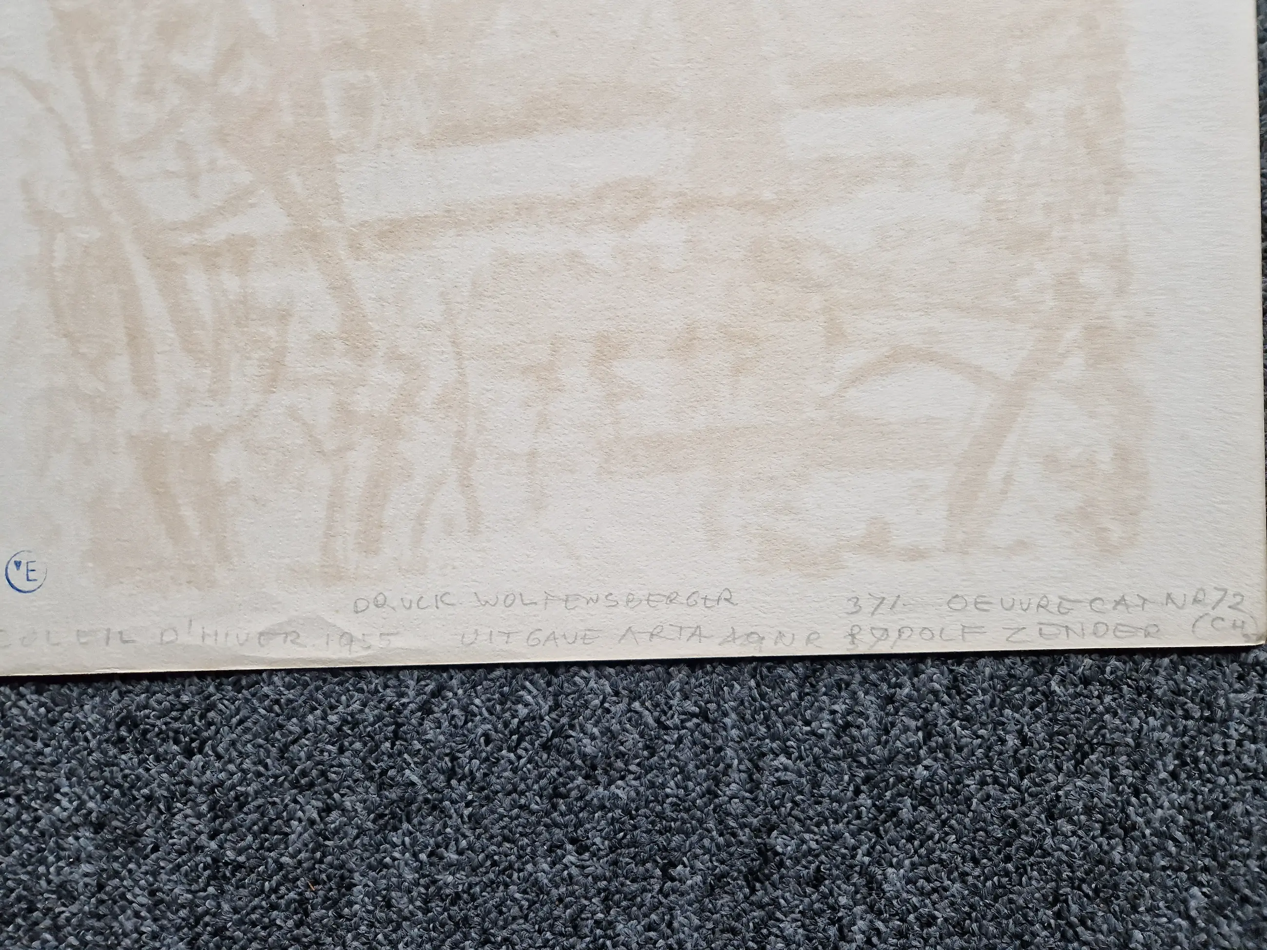 - Een in de jaren 50 (1955) door de Zwitserse realistische kunstschilder en graficus Rudolf ZENDER (1901-1988) gemaakte Lithografie getiteld "soleil d'hiver". Nummer 79 in een oplage van 200 ex. op dik papier. Verkeert in goede staat met erg mooie kleuren. Potlood-gesigneerd, gedateerd en getiteld. Beeldmaat Bladmaat 39x50cm (BxH).
