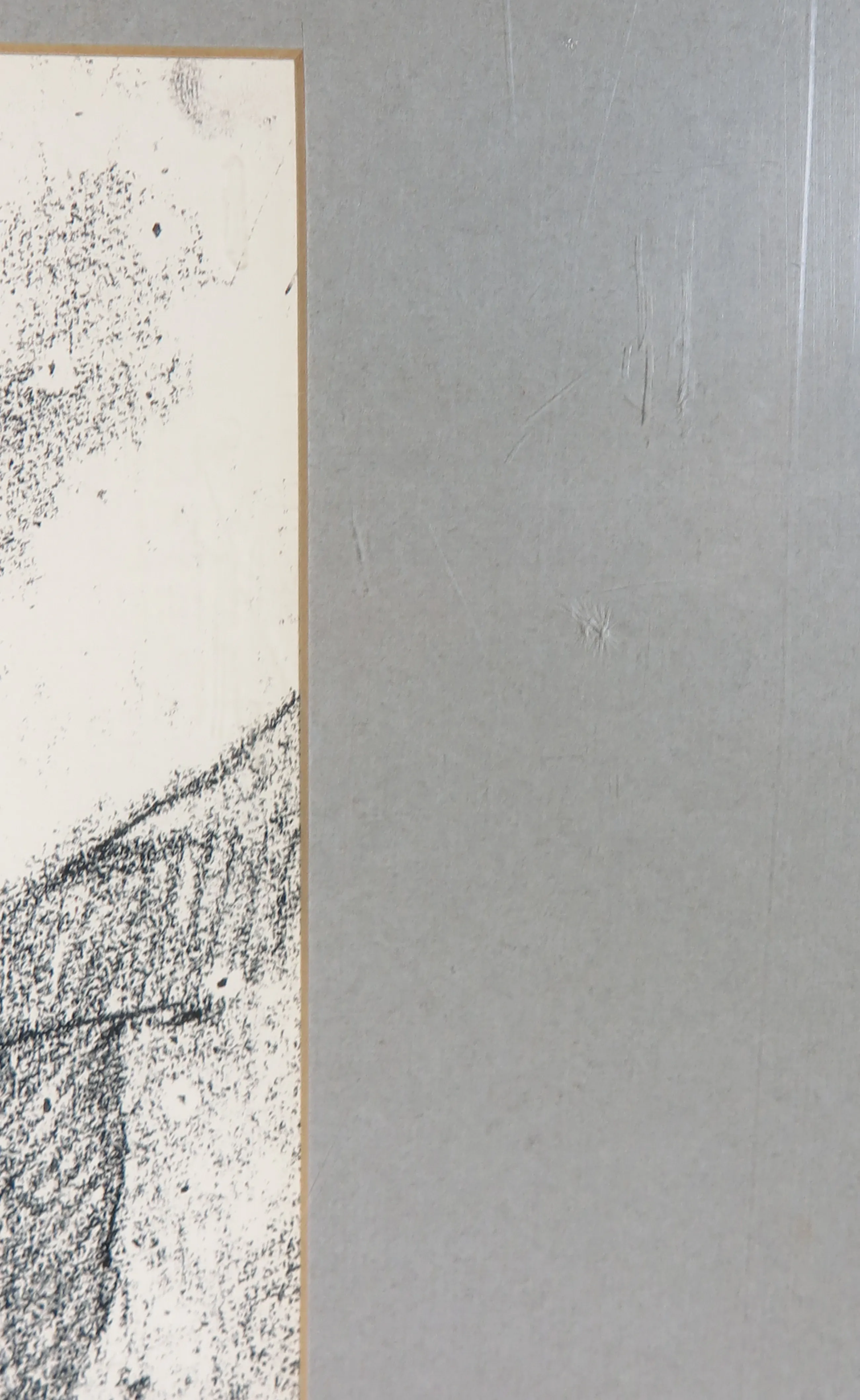 | Het werk is in goede staat, enkel het papier is vergeeld. Op de glasplaat zijn wat beschadigingen, krassen en stickerresten te zien. | |