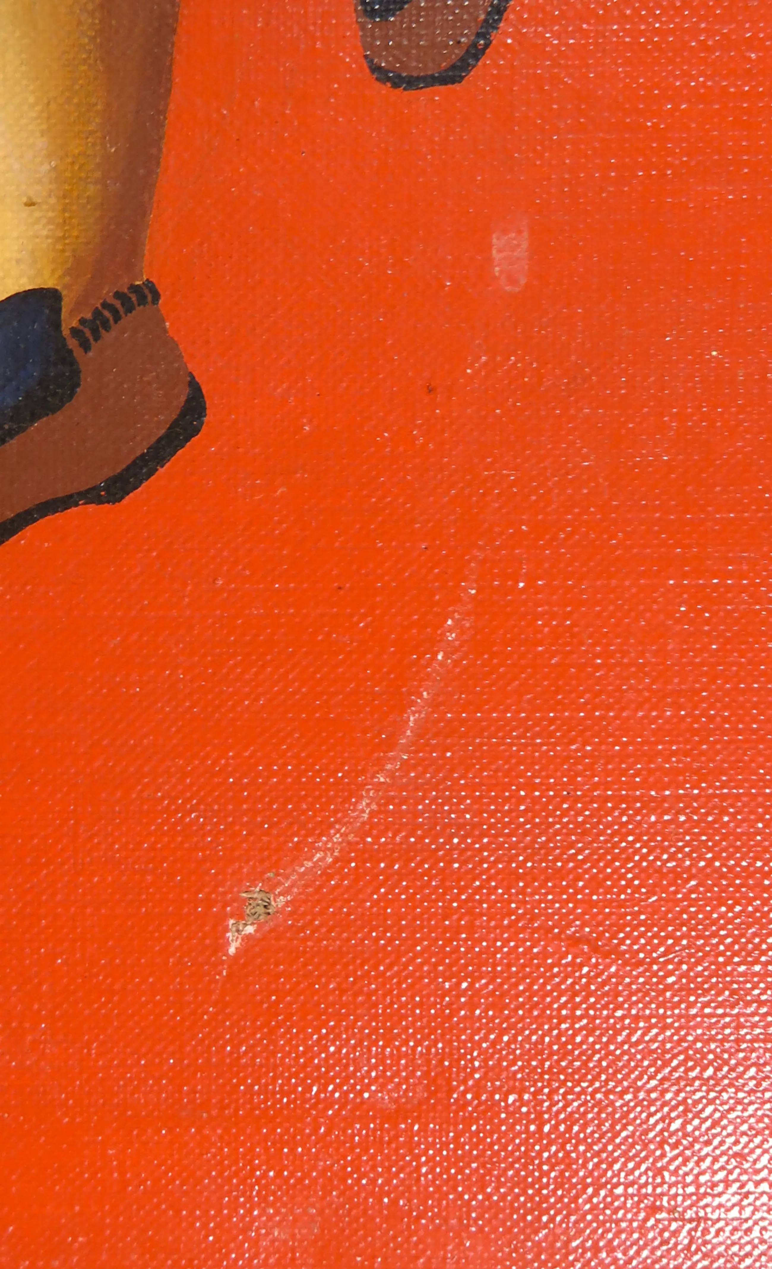| Het werk is in slechte staat en dient daarnaast opnieuw ingelijst te worden: over de gehele voorstelling zijn krassen en gaatjes te zien, zoals te zien op de detailfoto's. Daarnaast is de lijst aan de bovenzijde kapot. | |