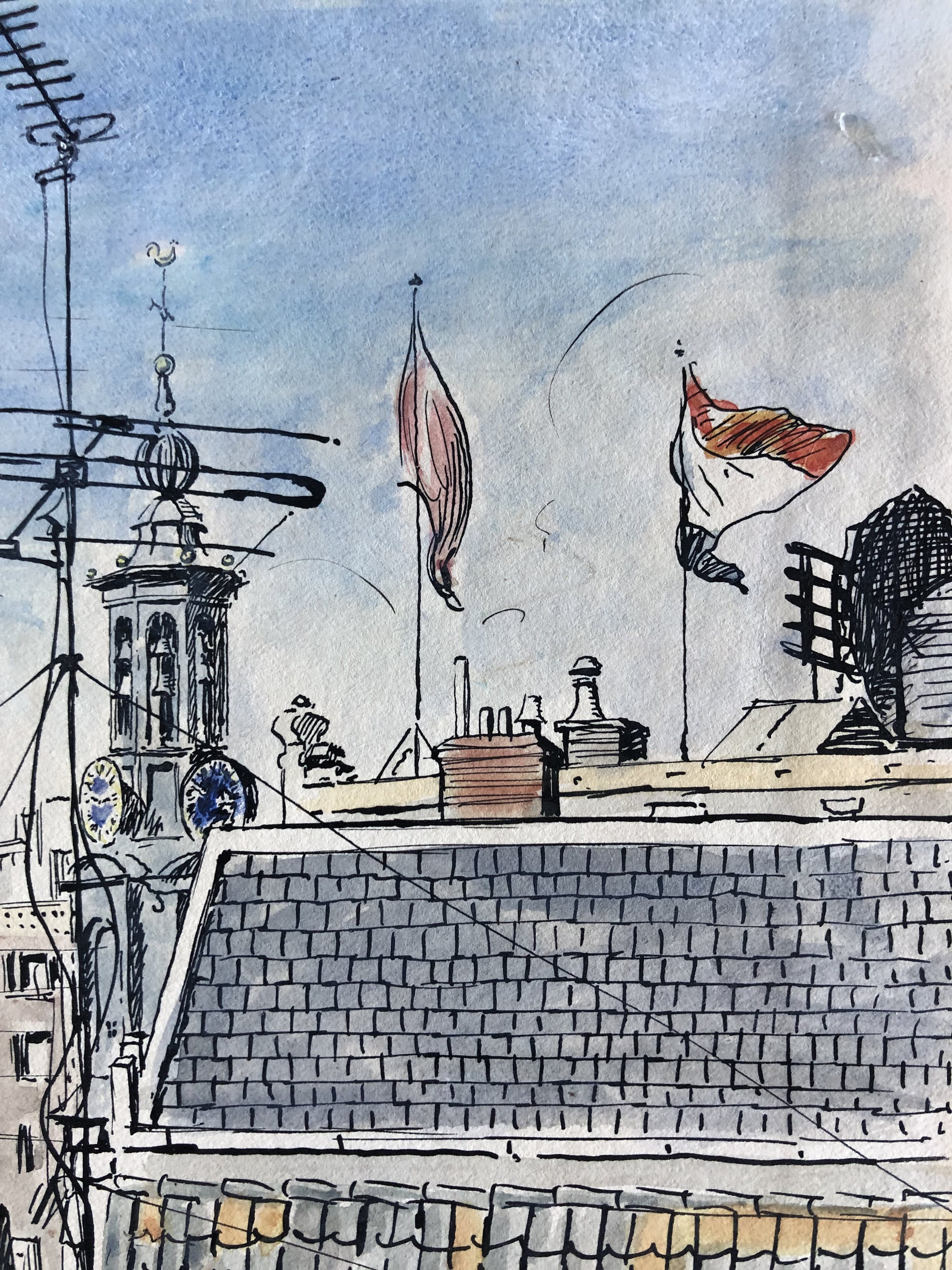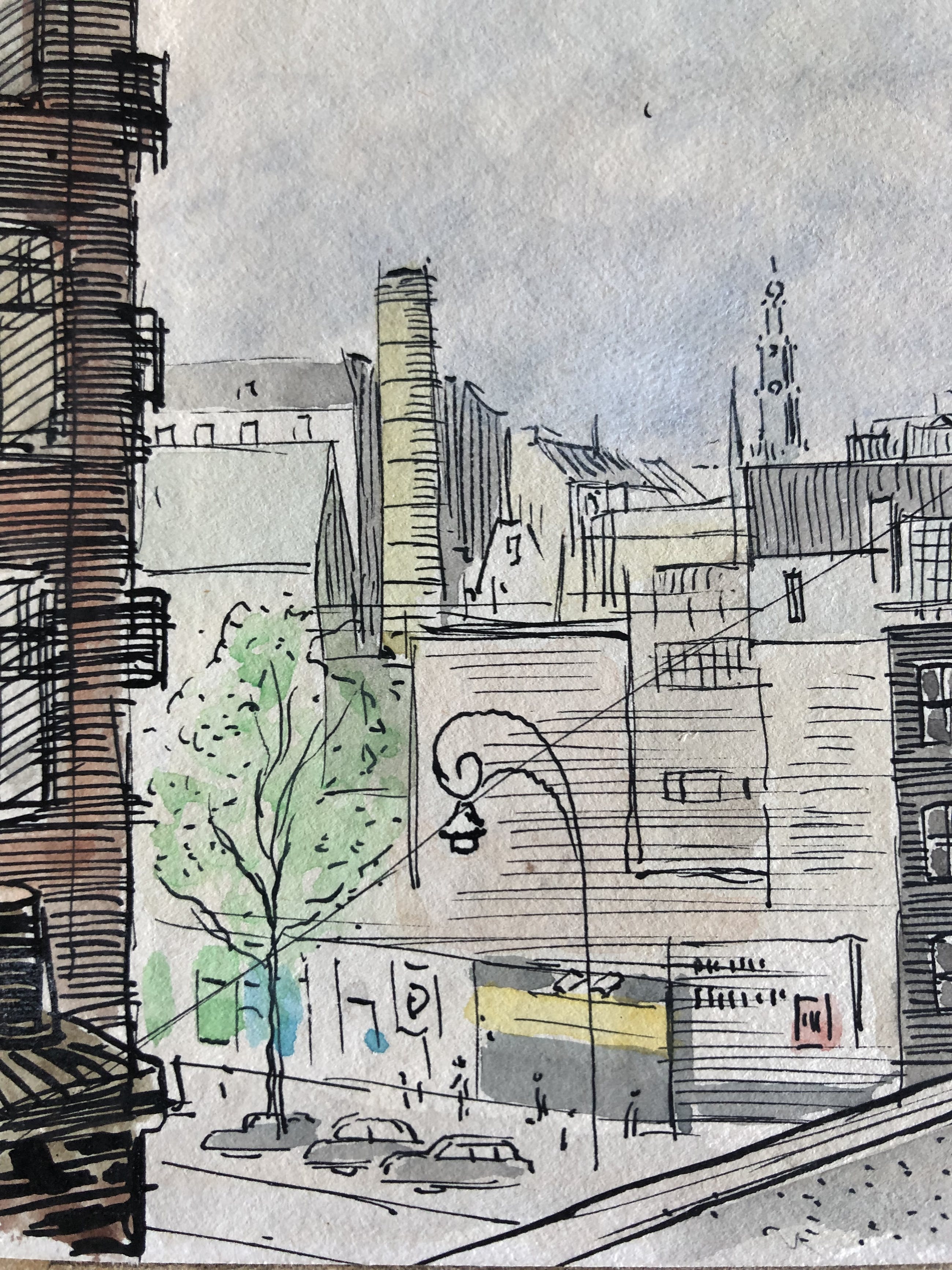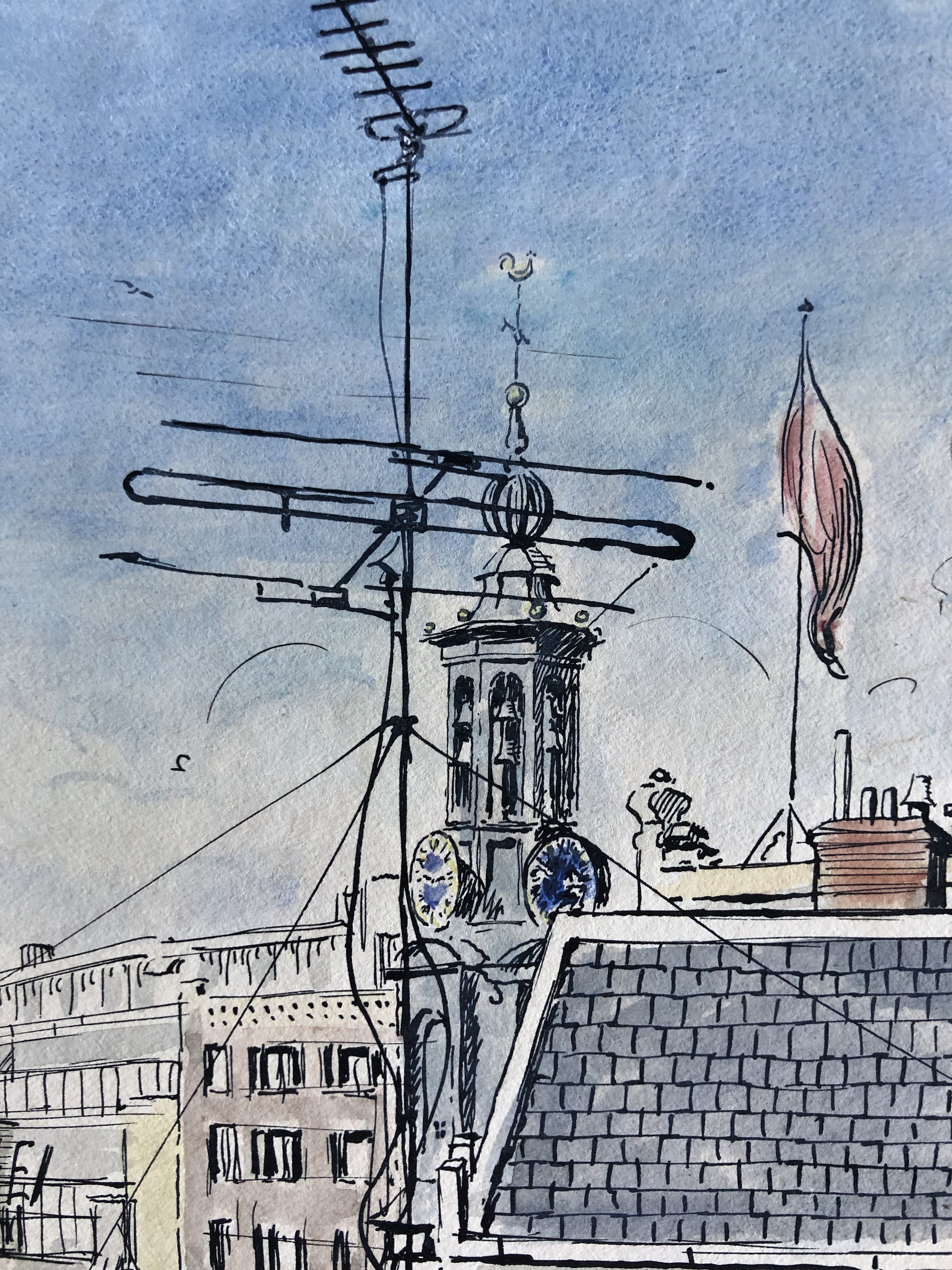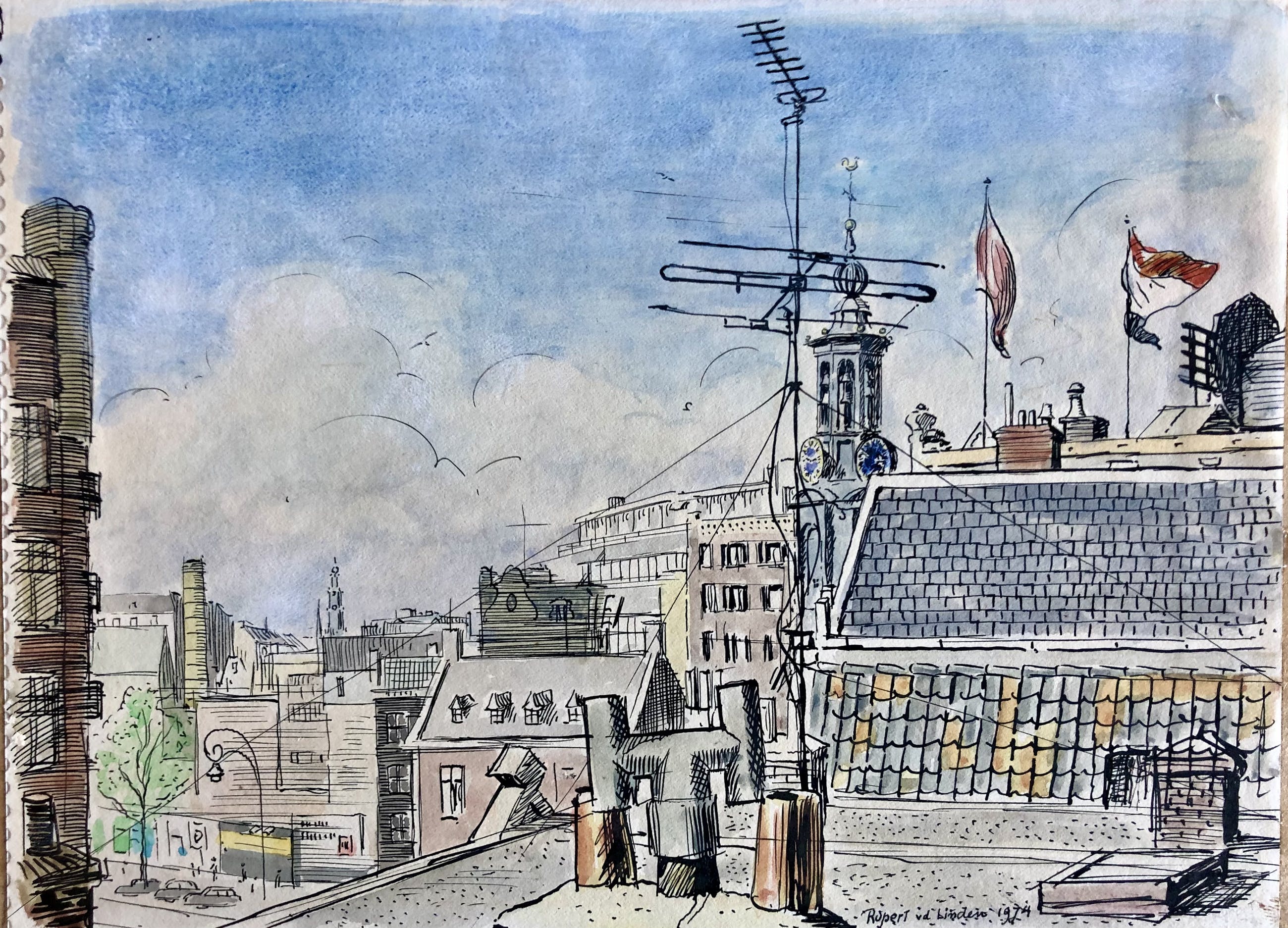 Amsterdams stadsgezicht in inkt (pen) en aquarel van de Amsterdamse animatiefilmer, illustrator, schilder, tekenaar en auteur Rupert vd Linden. De tekening is gesigneerd Rupert van der Linden 1974 maar dat valt weg onder het passe-partout. Het passe-partout is gesigneerd Rupert ́98.. Prachtig helder van kleur, zie foto's.