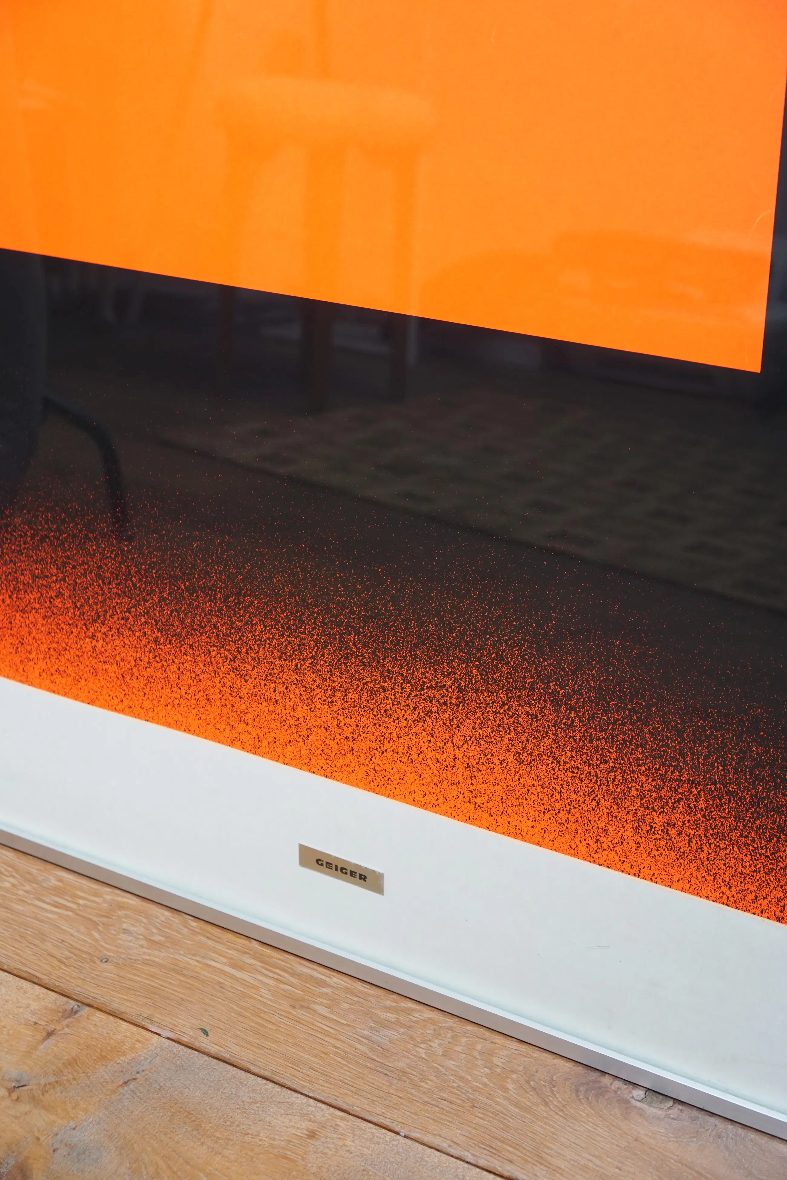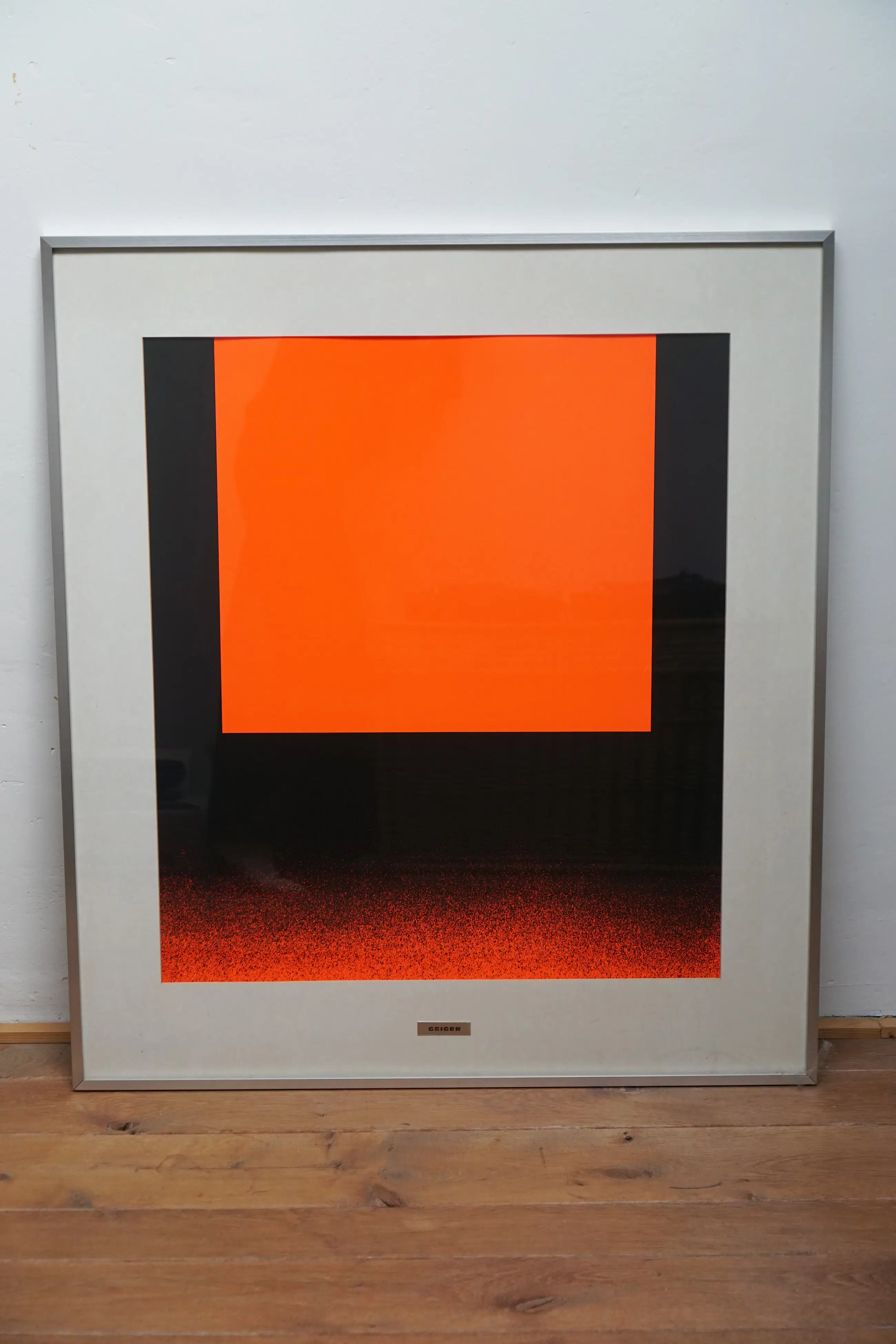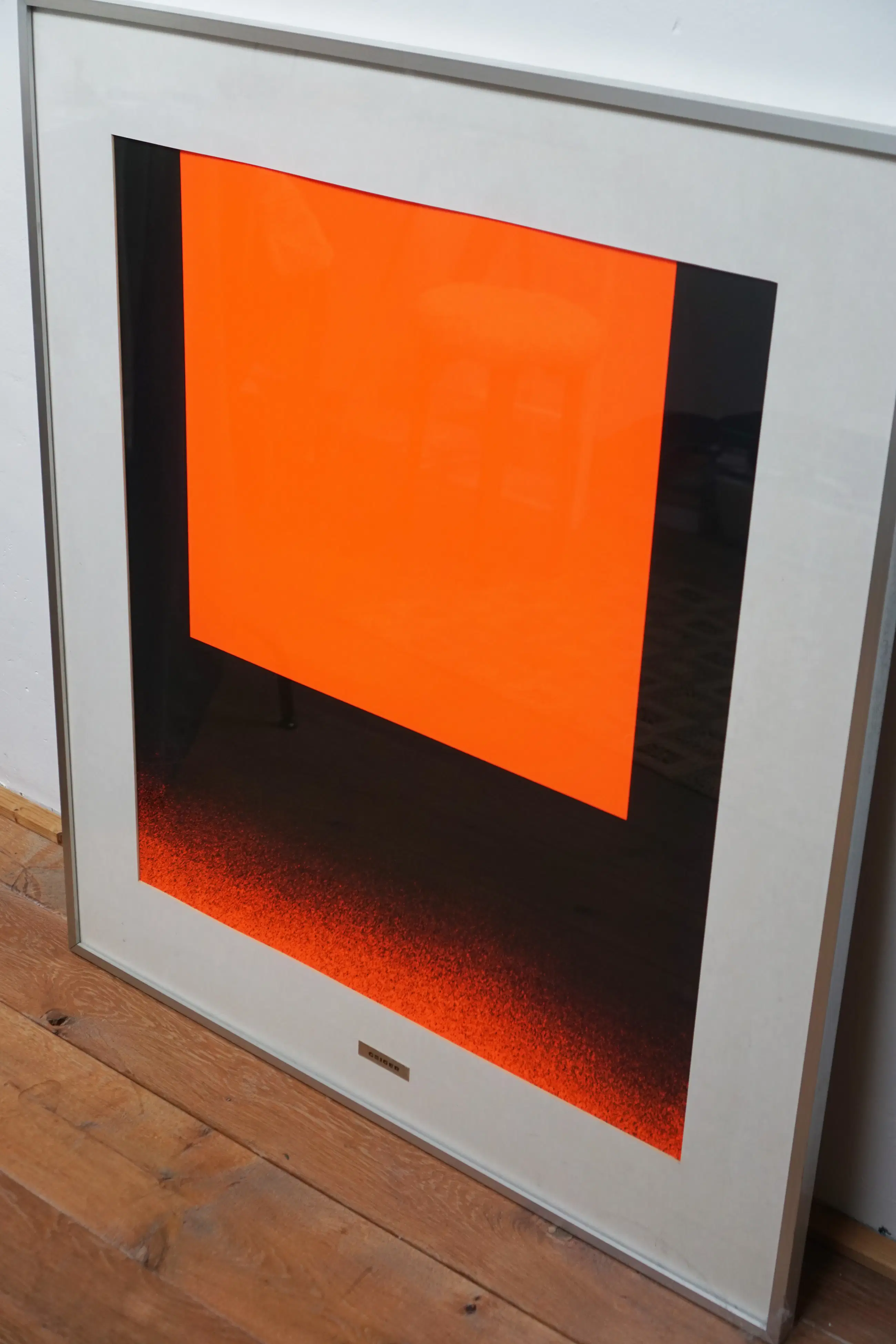 Techniek: zeefdruk in intens fluoriserend rood-oranje op zwart. Ongesigneerd exemplaar, vermoedelijk afkomstig uit open editie gedrukt bij Edition Domberger.
