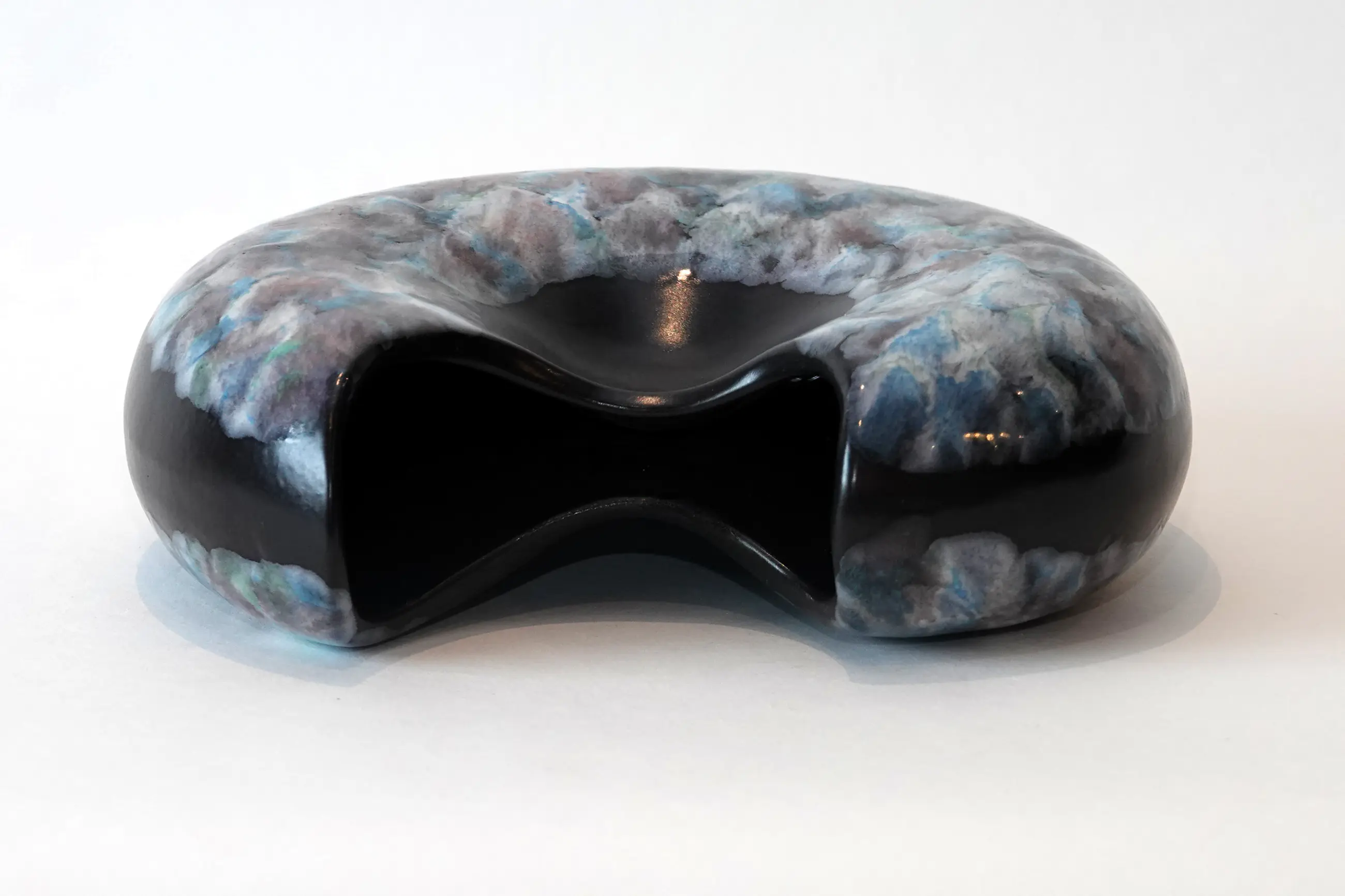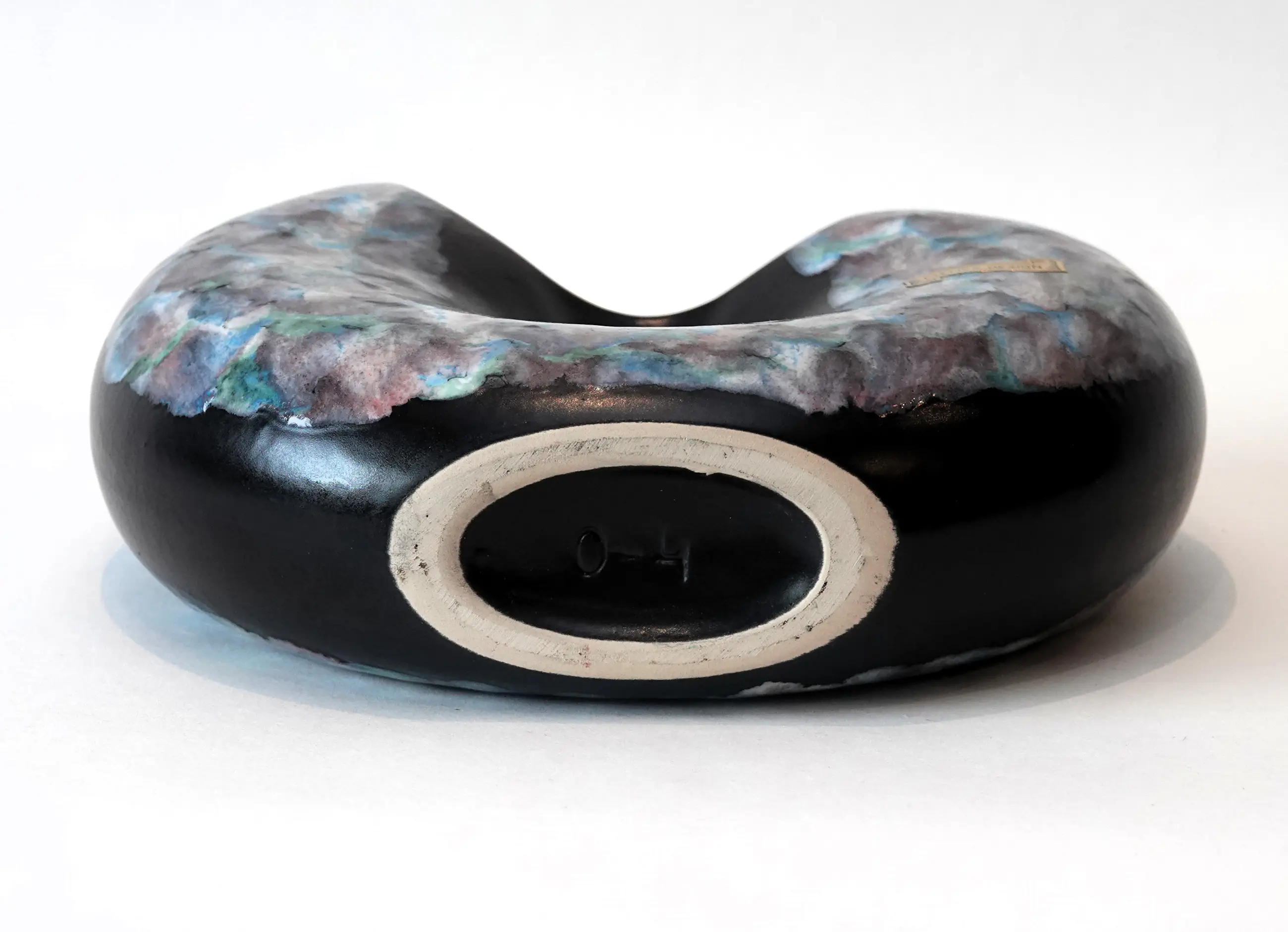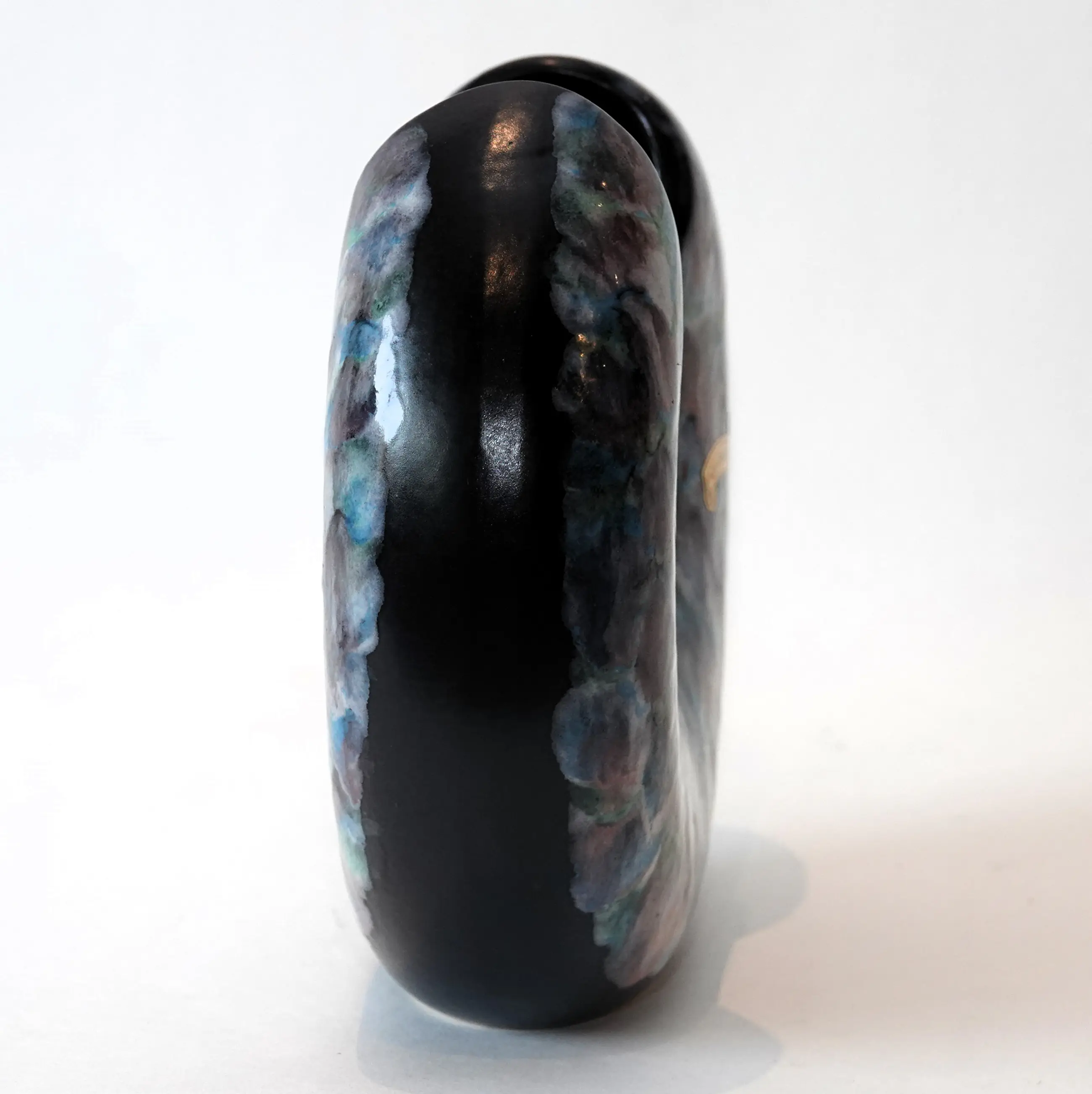 Over de zwarte basis matglansglazuur is een kleurencombinatie van paars, lila, zeegroen, en azuurblauw met een spons aangebracht.