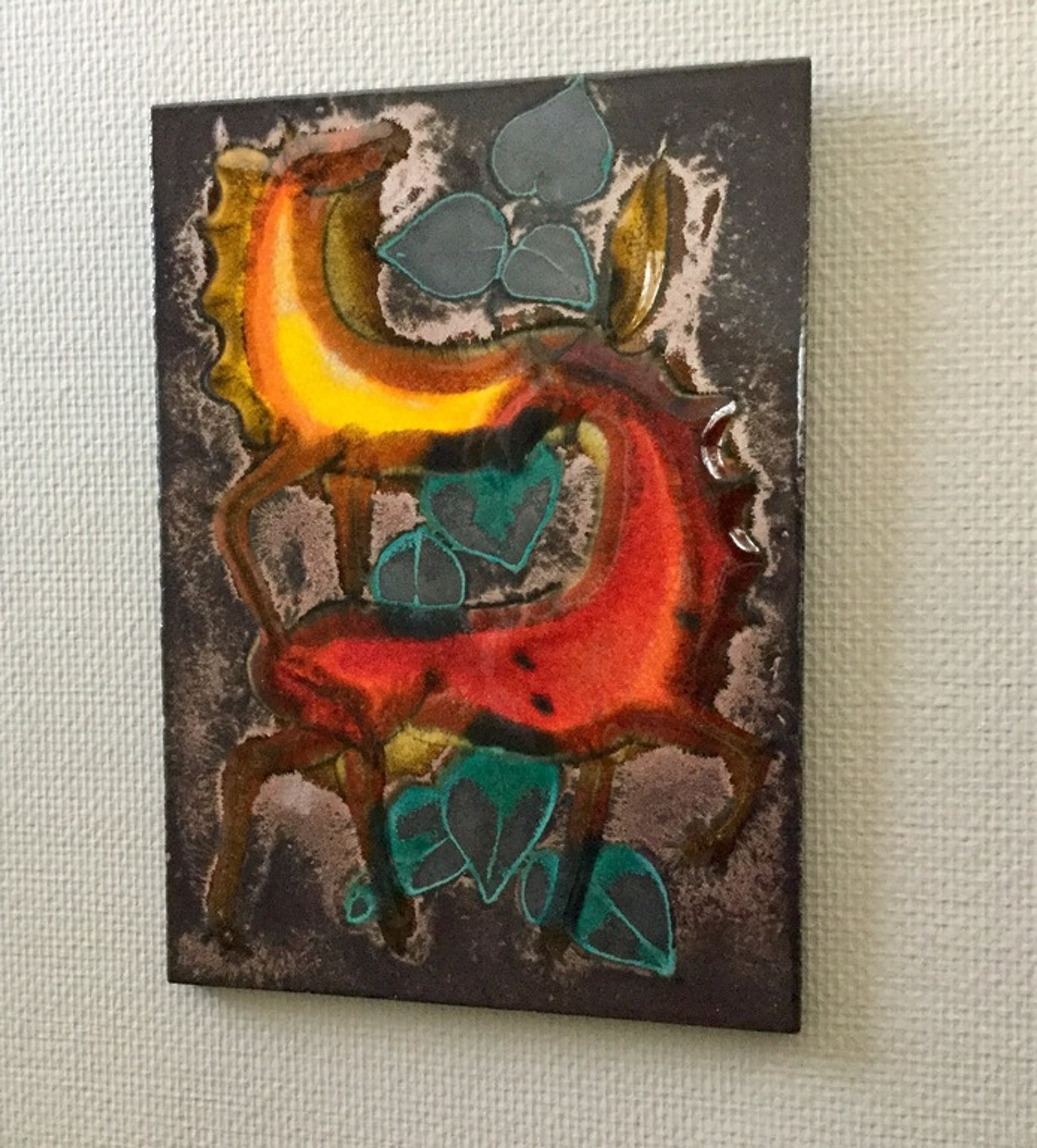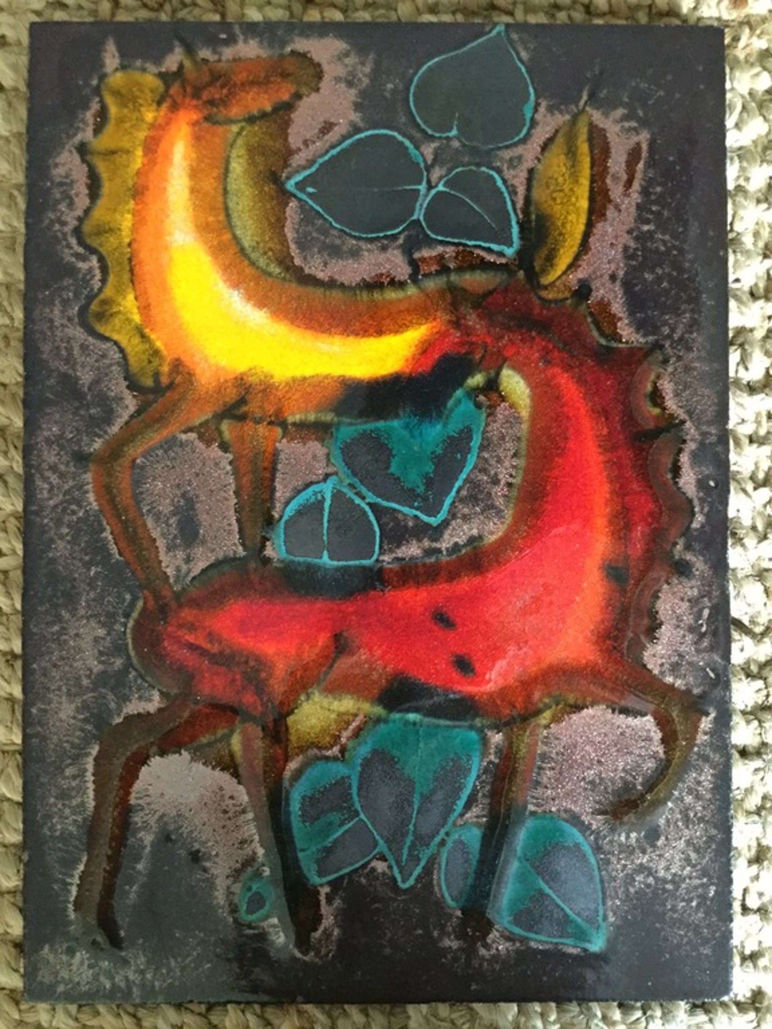Mooie jaren 70 reliëf schildering met een kleurrijke voorstelling van twee paarden, afkomstig uit de West-Duitse Ruscha fabriek
