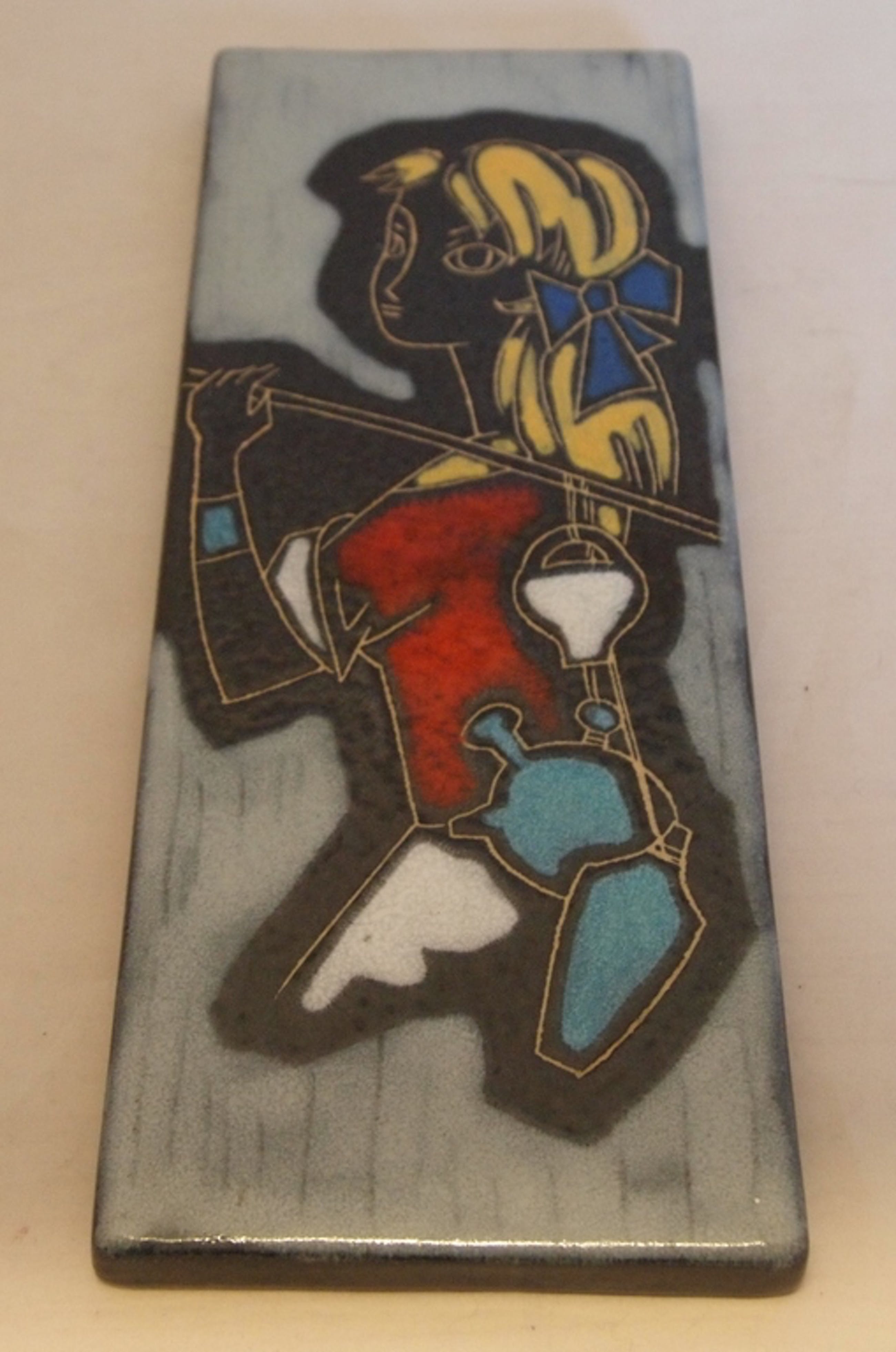 Kunstaardewerken wandtegel van Ruscha uit de jaren '60 voorzien van een hand geemailleerde afbeelding van een jonge dame. In prima onbeschadigde conditie. Aan de achterzijde gemerkt.