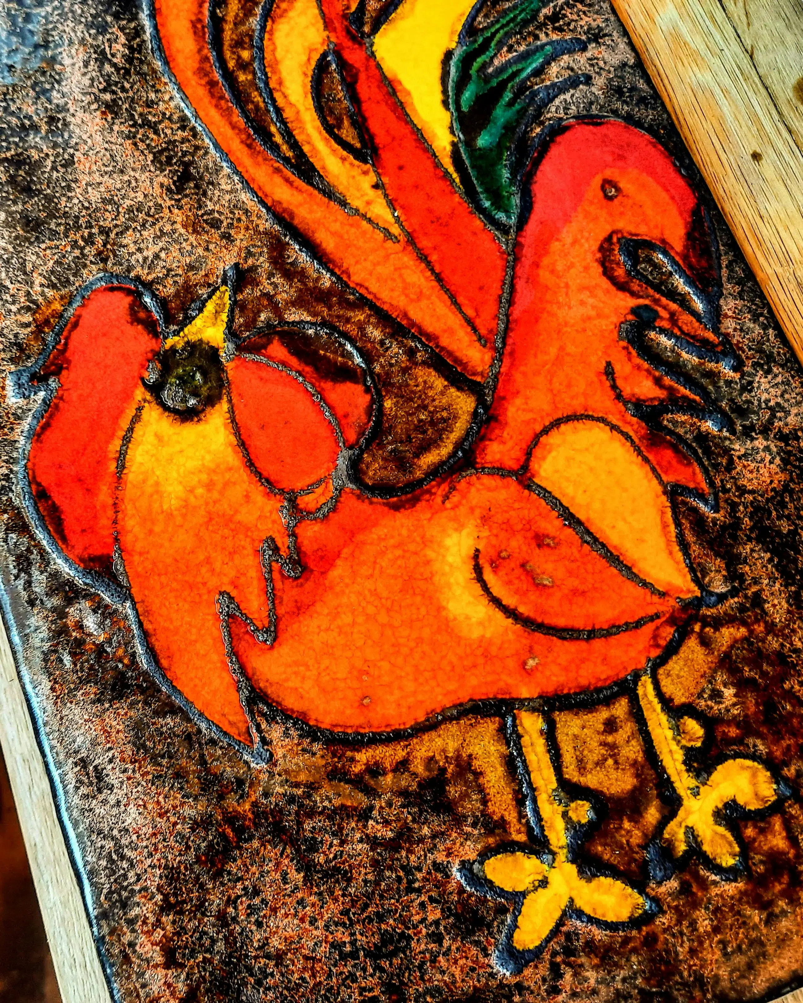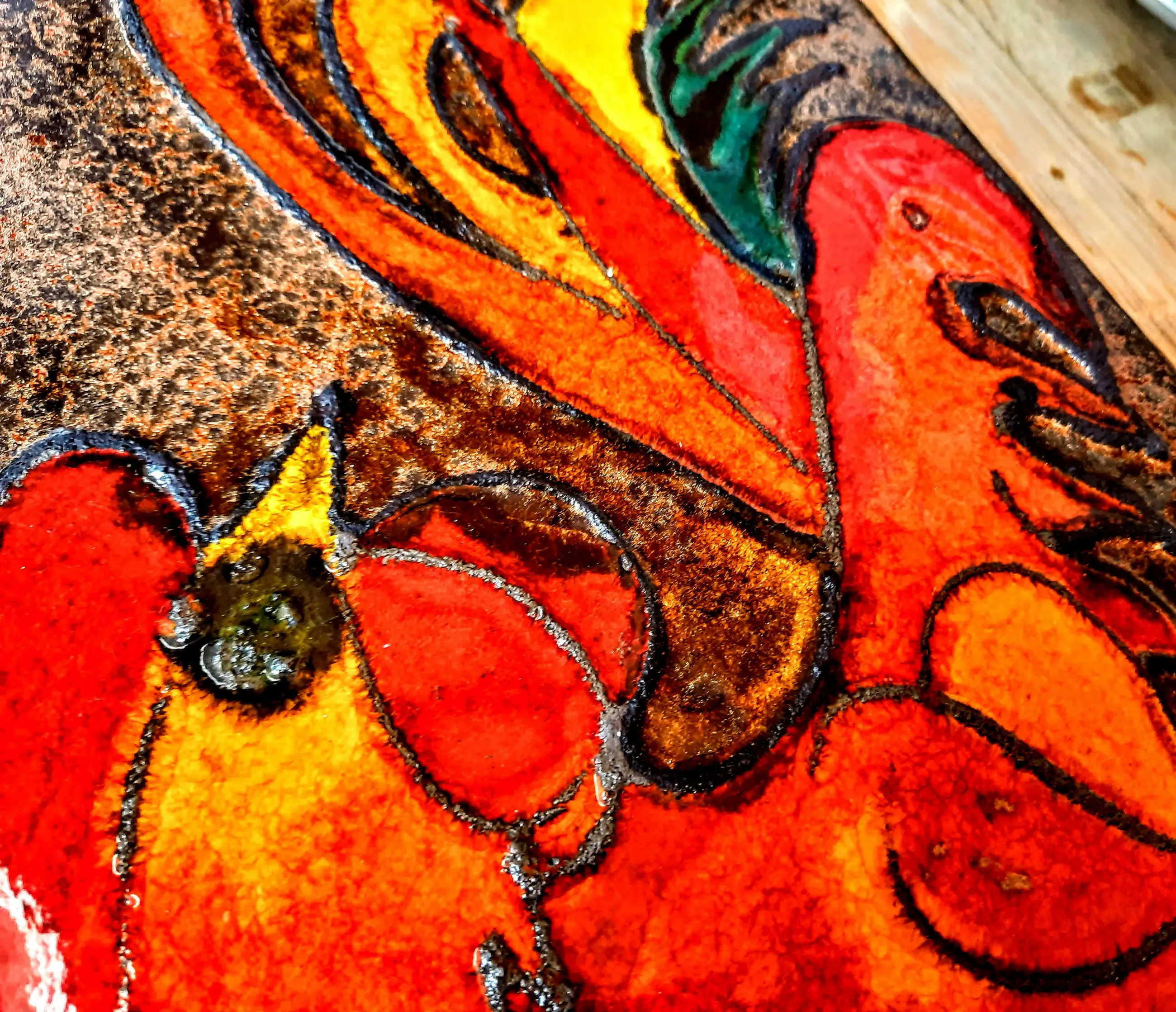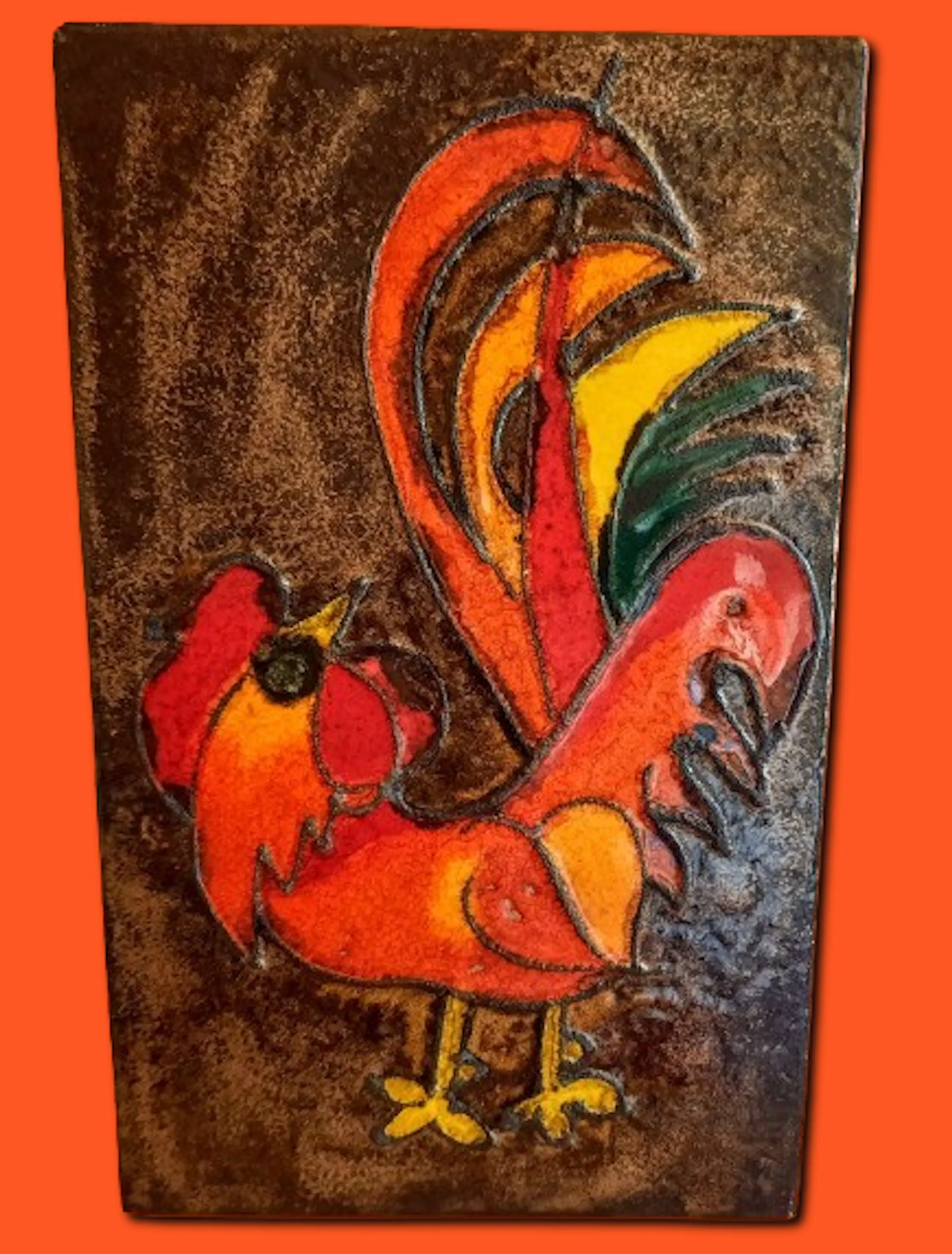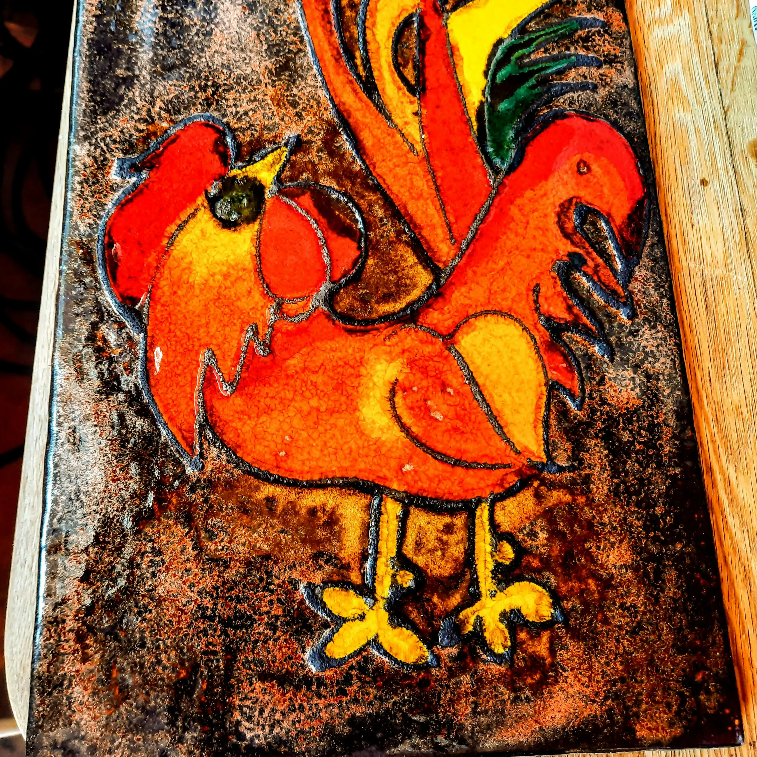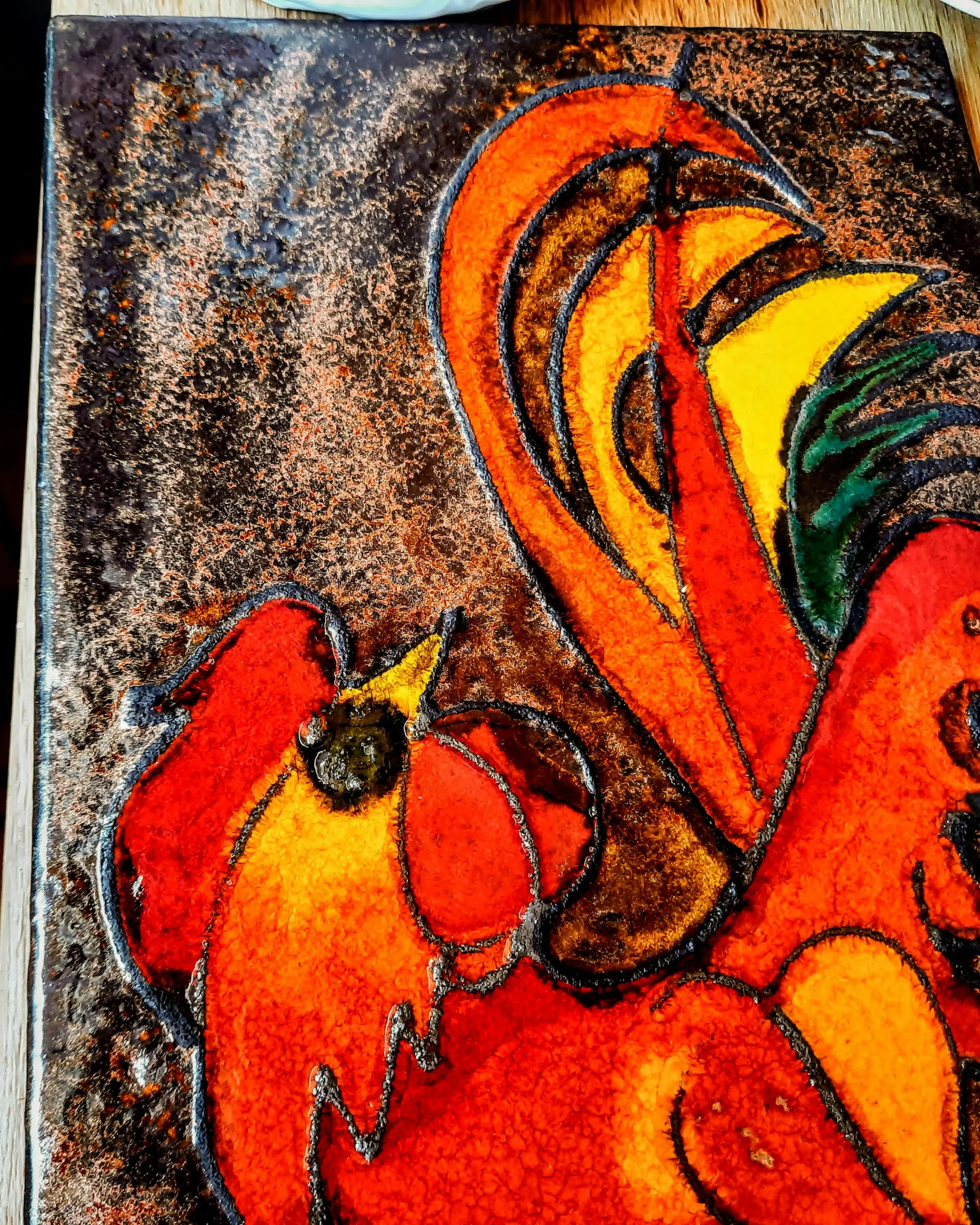 Het keramische bord in popartstijl toont een gestileerde, kleurrijke haan op een donkere achtergrond, met een driedimensionale reliëfstructuur en een uitgebreid, kleurrijk glazuur.