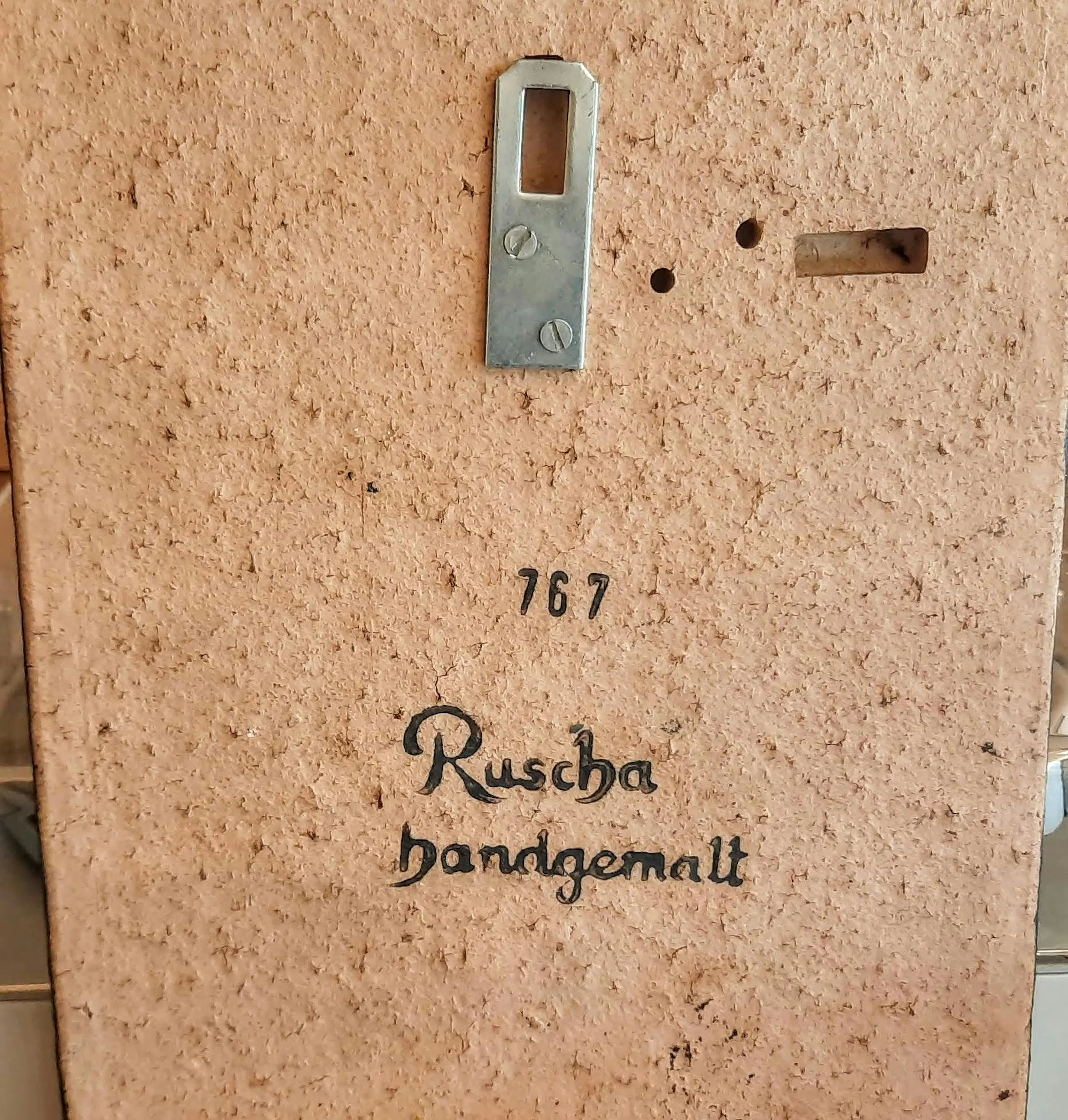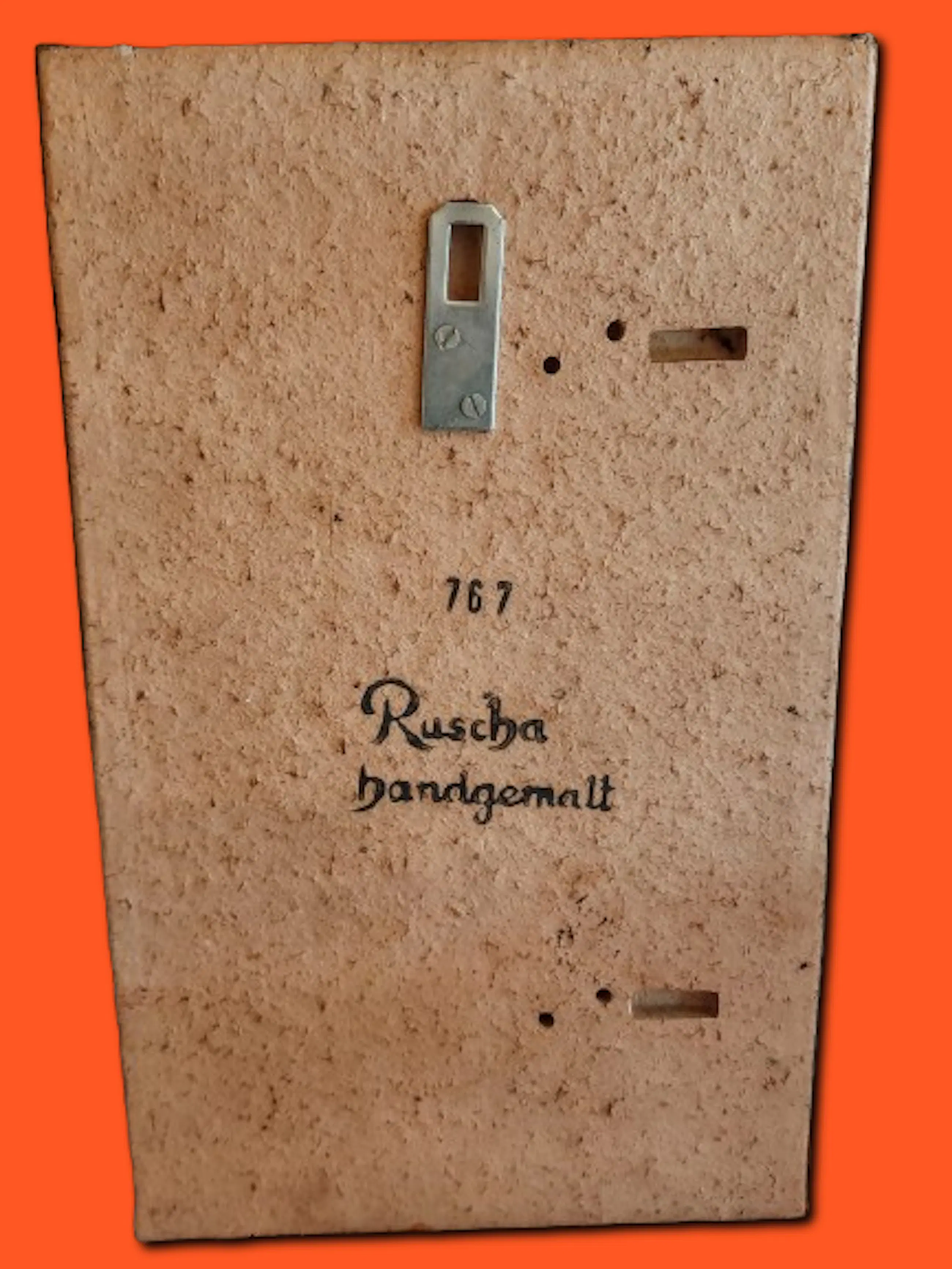 Het keramische bord is aan de achterkant voorzien van het Ruscha Handarbeit-merkstempel en een ophanghaakje.
