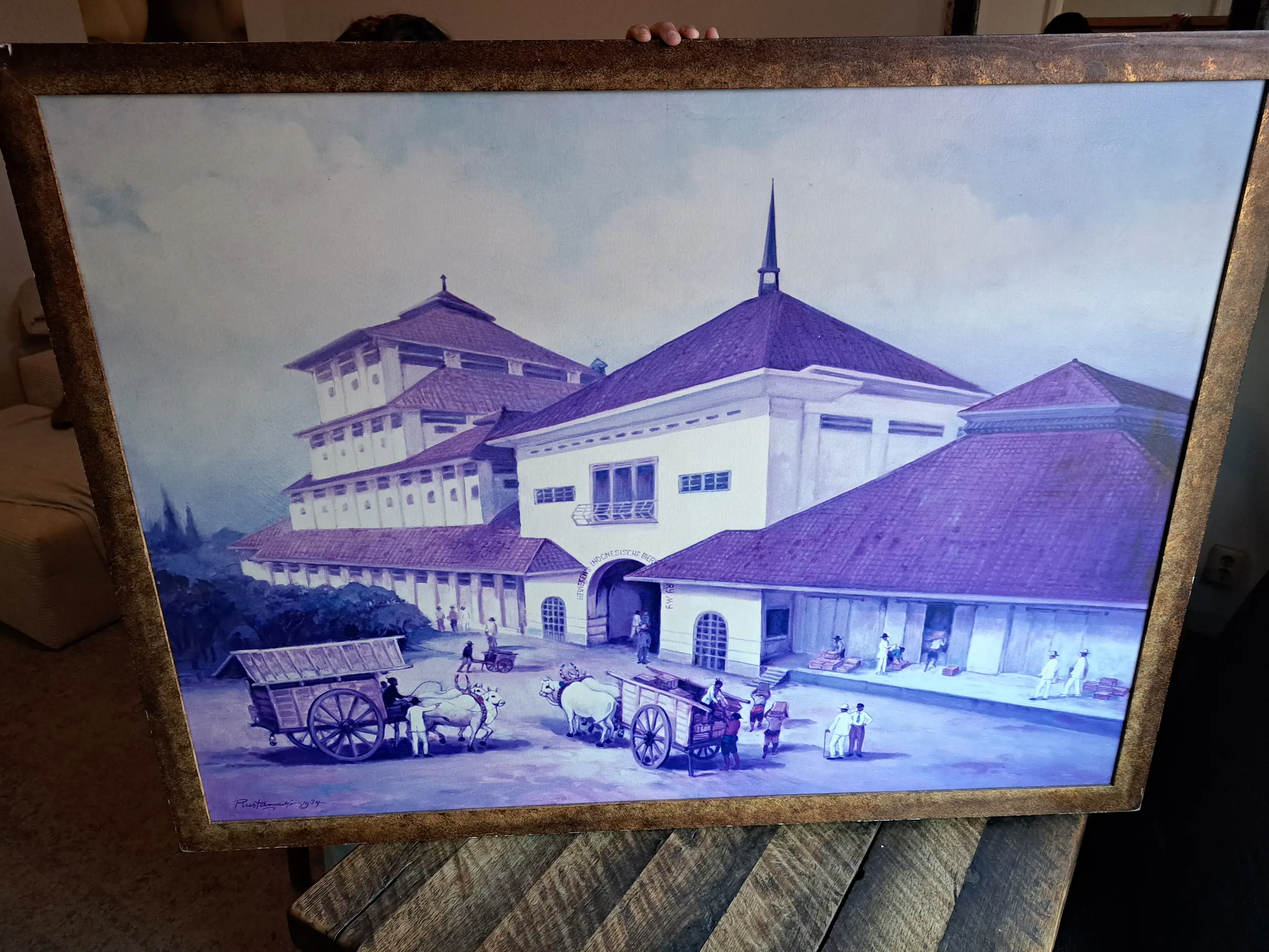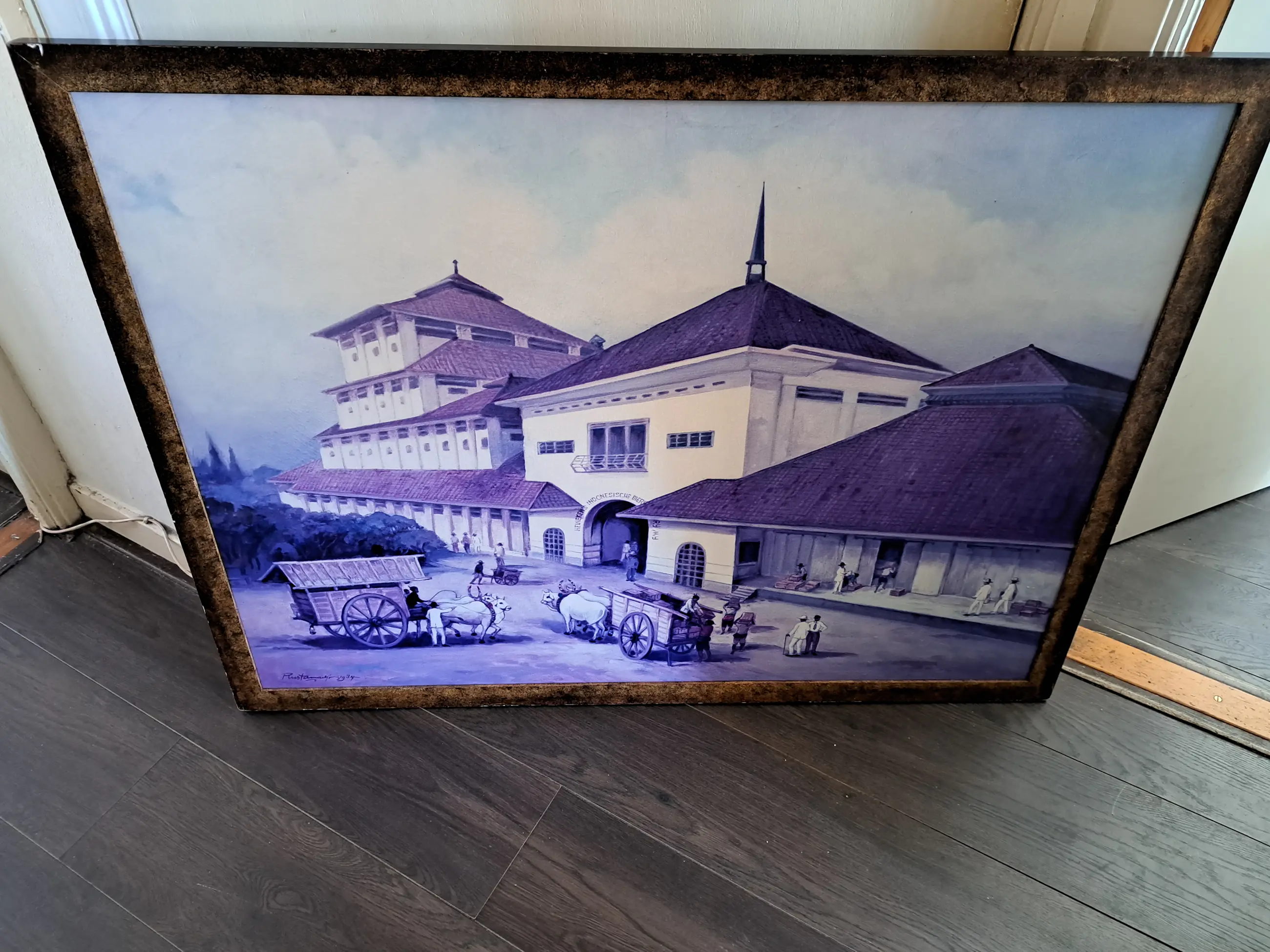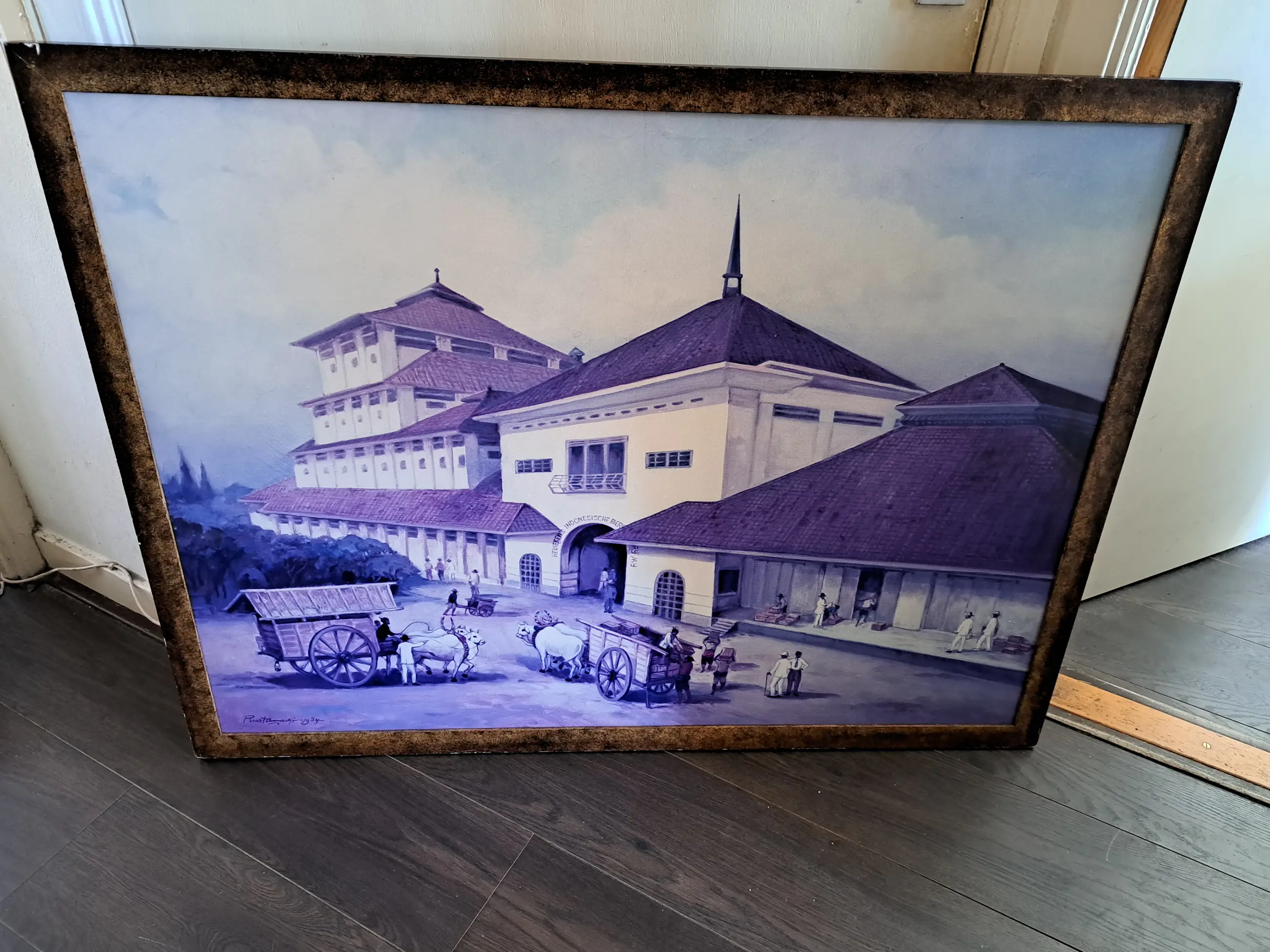 Prachtig Giclée van de bekende Indische schilder Rustamadji. Op de afbeelding is het prachtige gebouw te zien van de toenmalige Heineken Indische brouwerij met op de voorgrond ossenkarren. De signatuur is meegedrukt met het jaartal 84. De Giclée is vermoedelijk in 2006 in Jakarta gemaakt en professioneel Ingelijst. Vermoedelijk op een kantoor in Jakarta gehangen. Hoe het zijn weg naar Nederland heeft gevonden is onbekend. Prachtig object voor fans van Indonesische taferelen of Heineken fans.