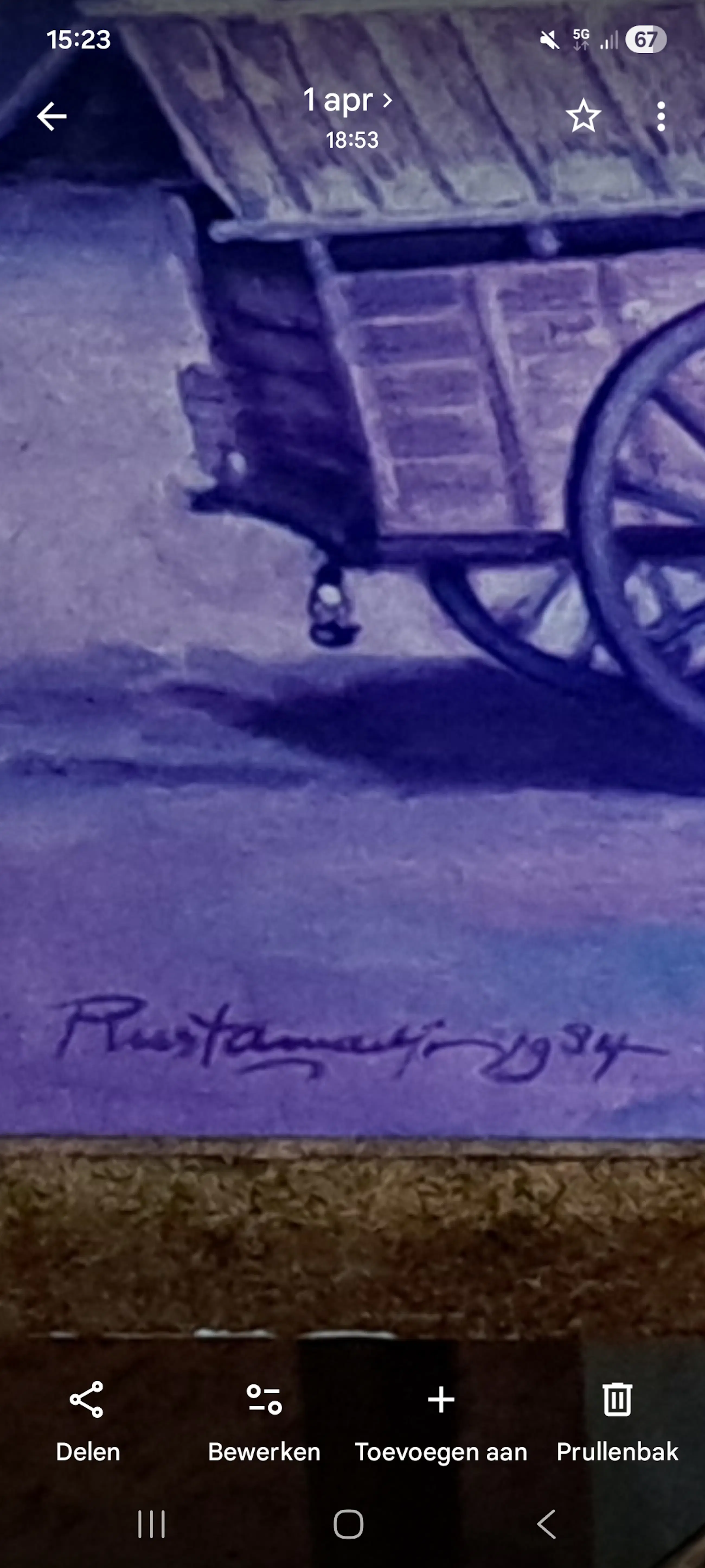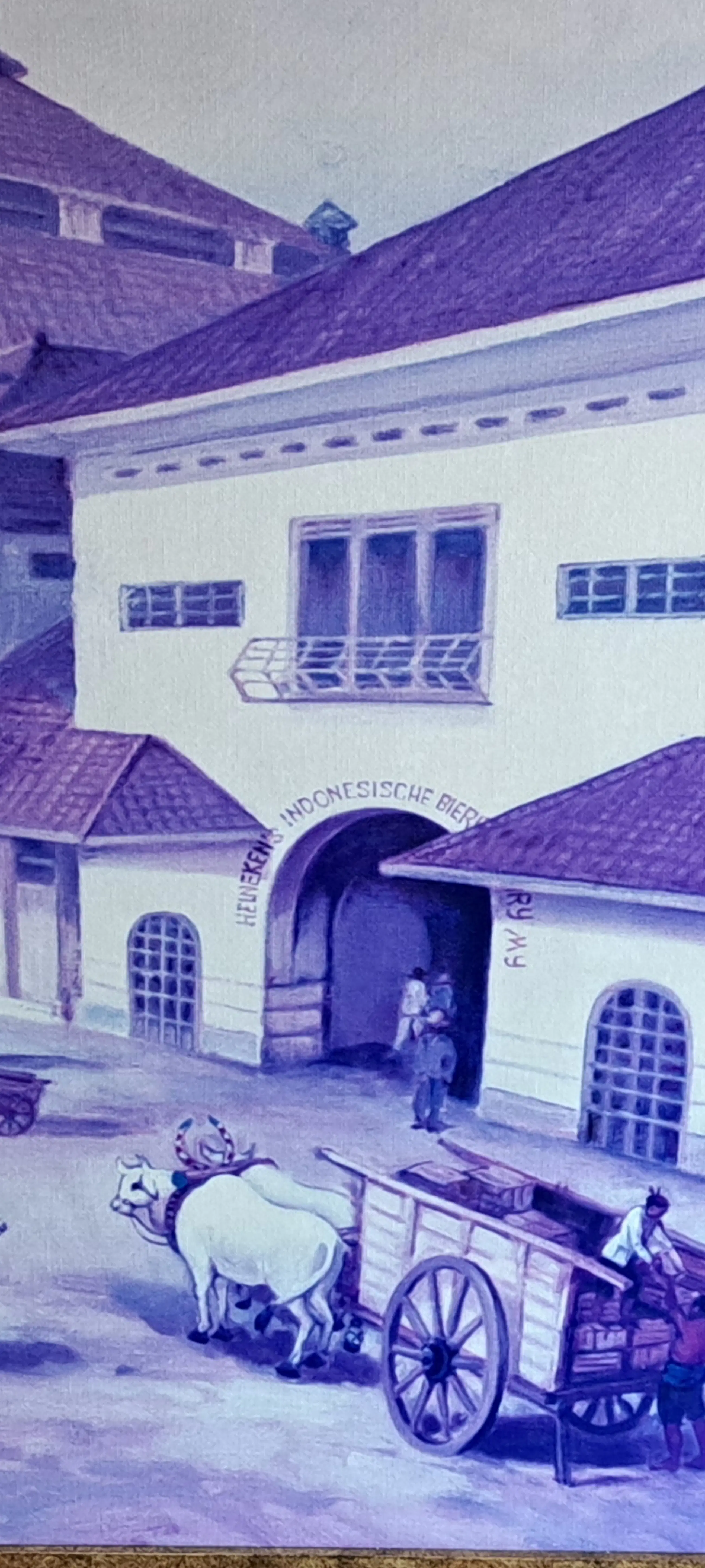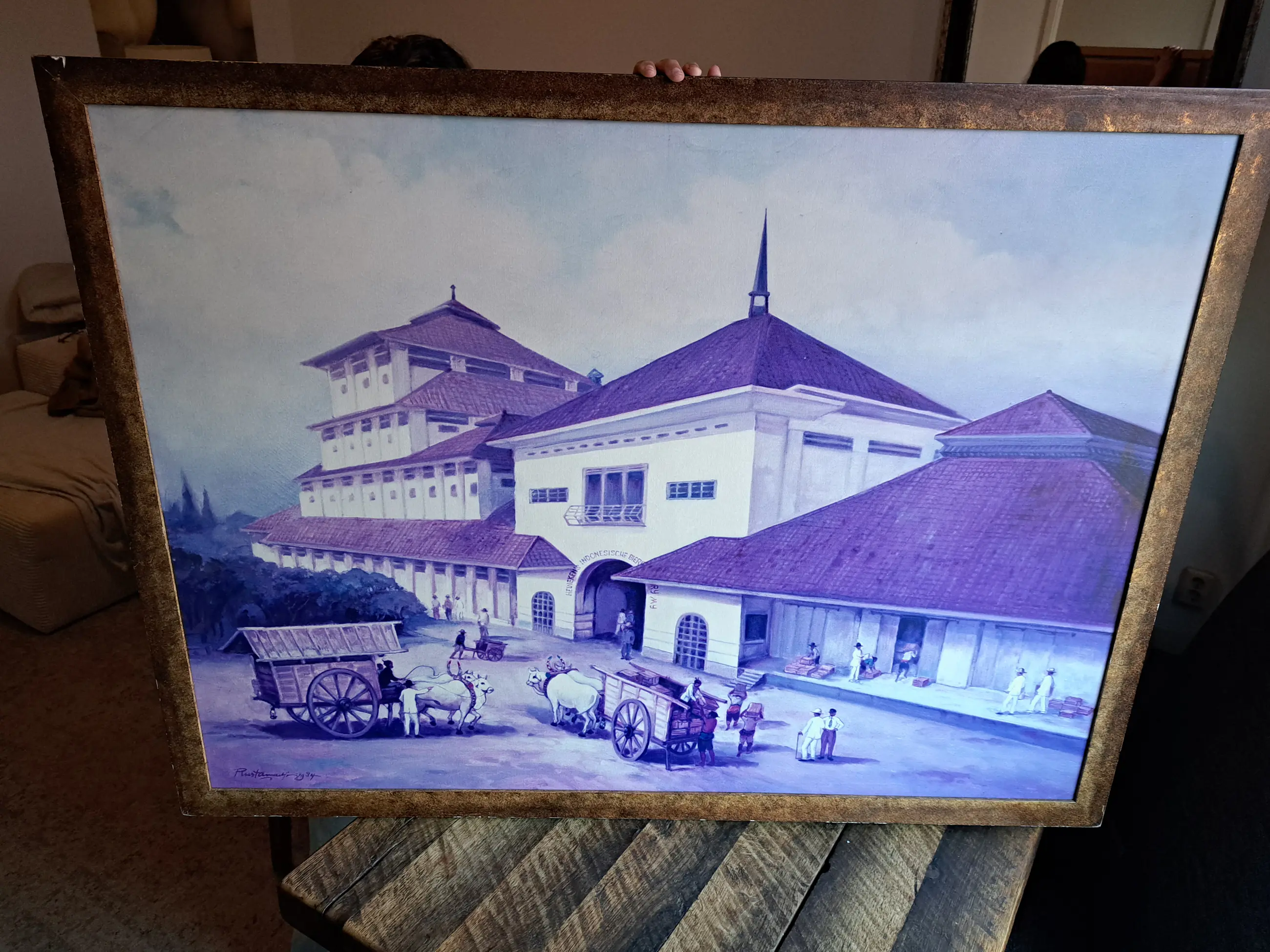 Prachtig Giclée van de bekende Indische schilder Rustamadji. Op de afbeelding is het prachtige gebouw te zien van de toenmalige Heineken Indische brouwerij met op de voorgrond ossenkarren. De signatuur is meegedrukt met het jaartal 84. De Giclée is vermoedelijk in 2006 in Jakarta gemaakt en professioneel Ingelijst. Vermoedelijk op een kantoor in Jakarta gehangen. Hoe het zijn weg naar Nederland heeft gevonden is onbekend. Prachtig object voor fans van Indonesische taferelen of Heineken fans.