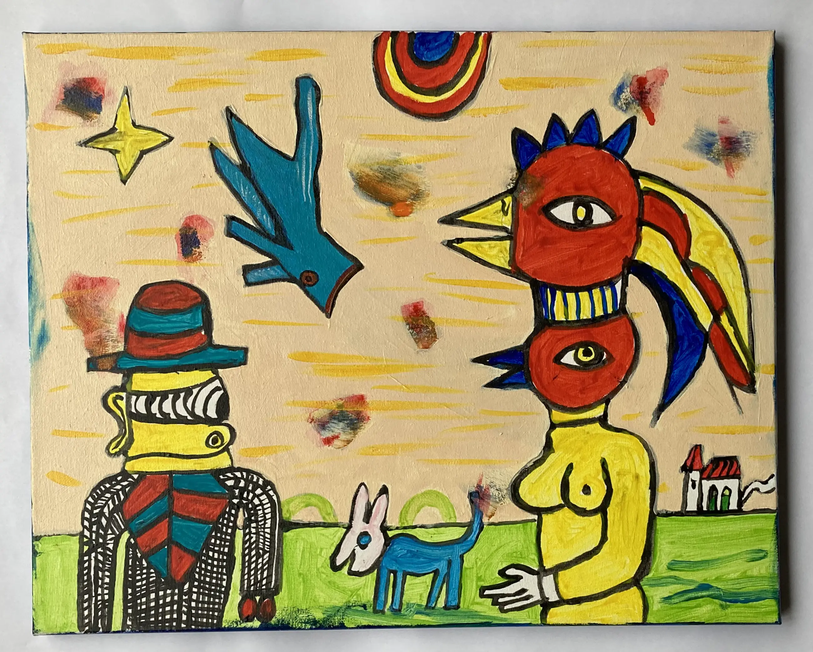 Acrylverfschilderij op doek. Zoals vaker heeft hij een eigen eerder schilderij over geschilderd. Afmeting 50 x 40 cm.