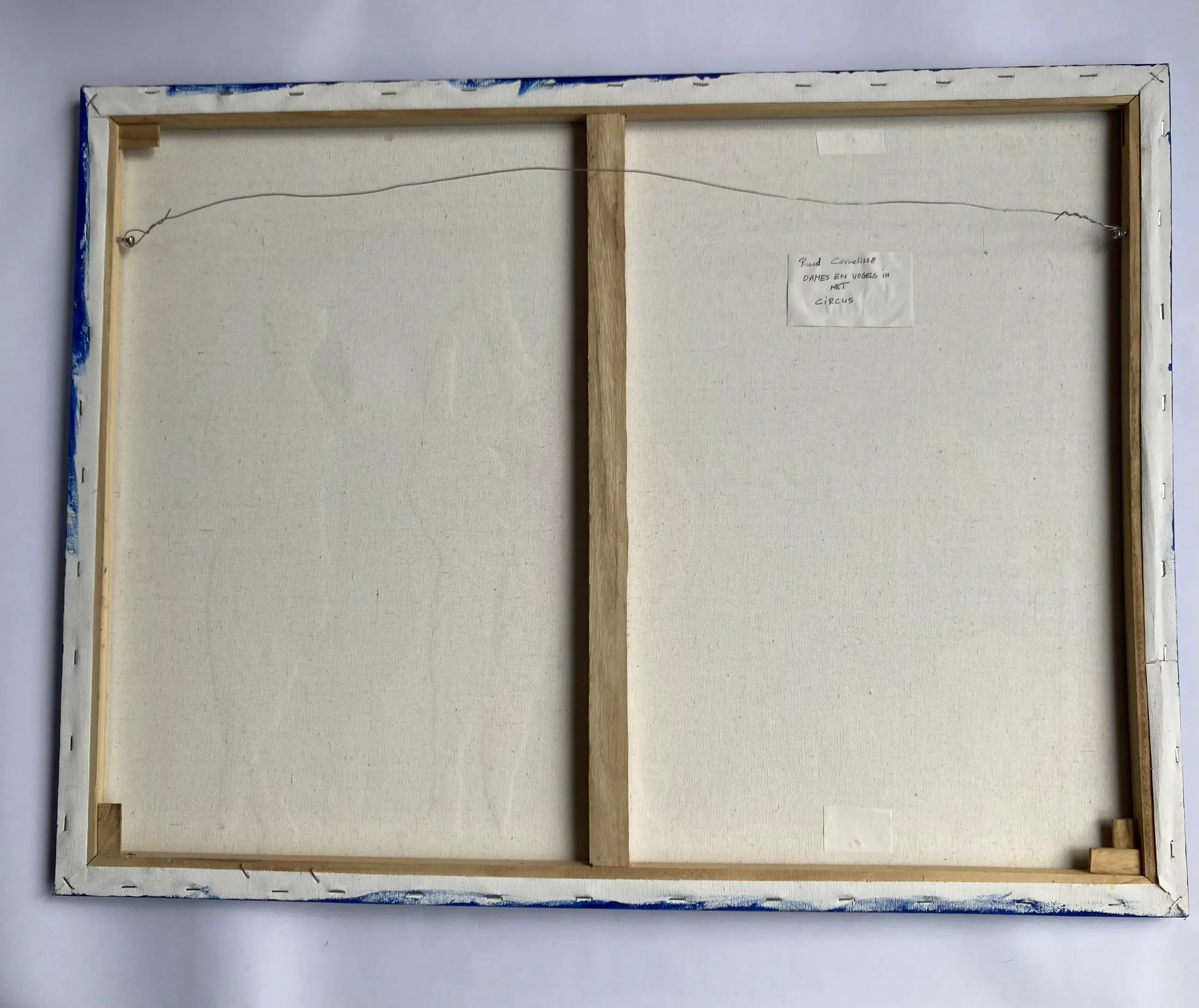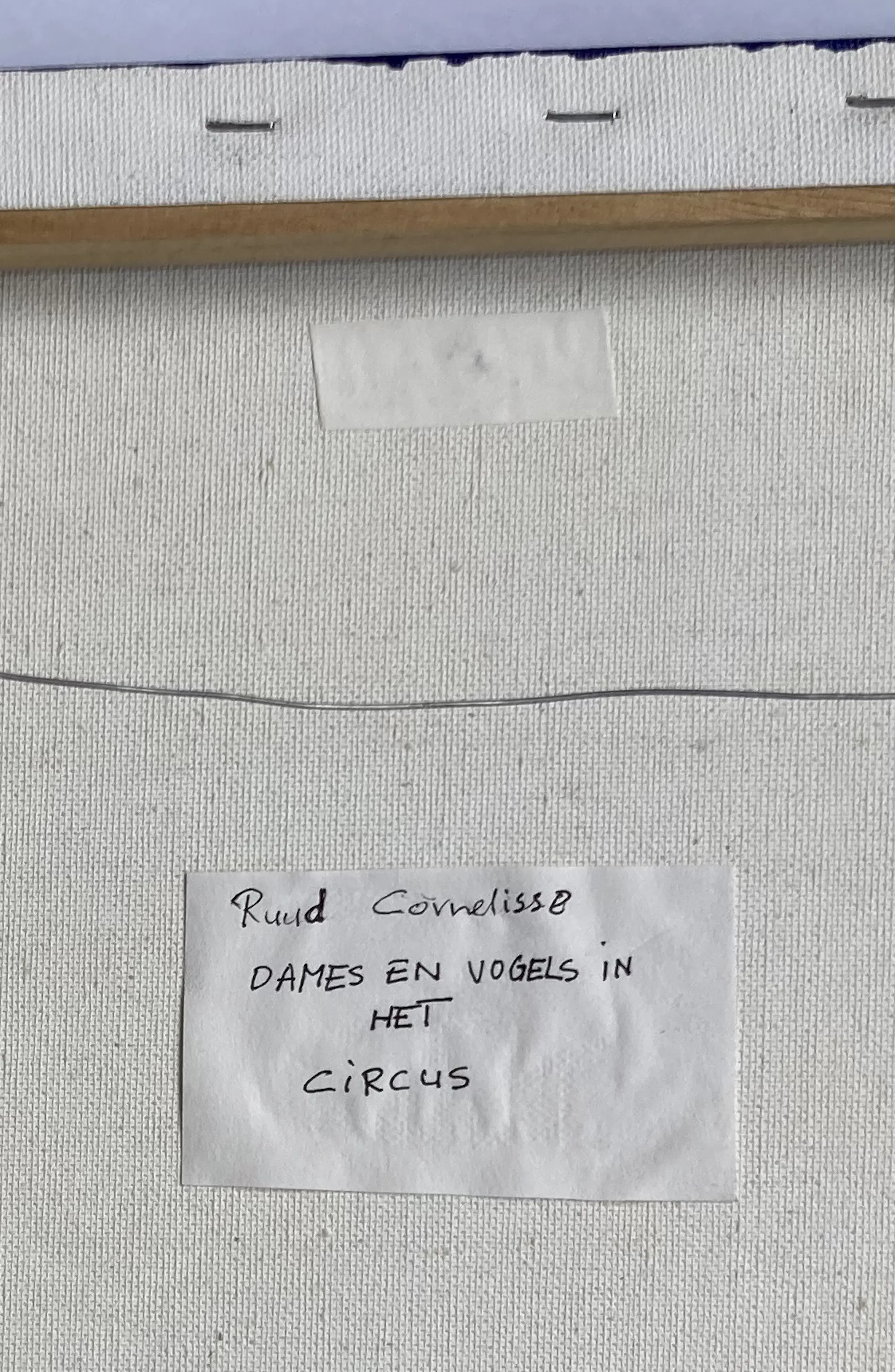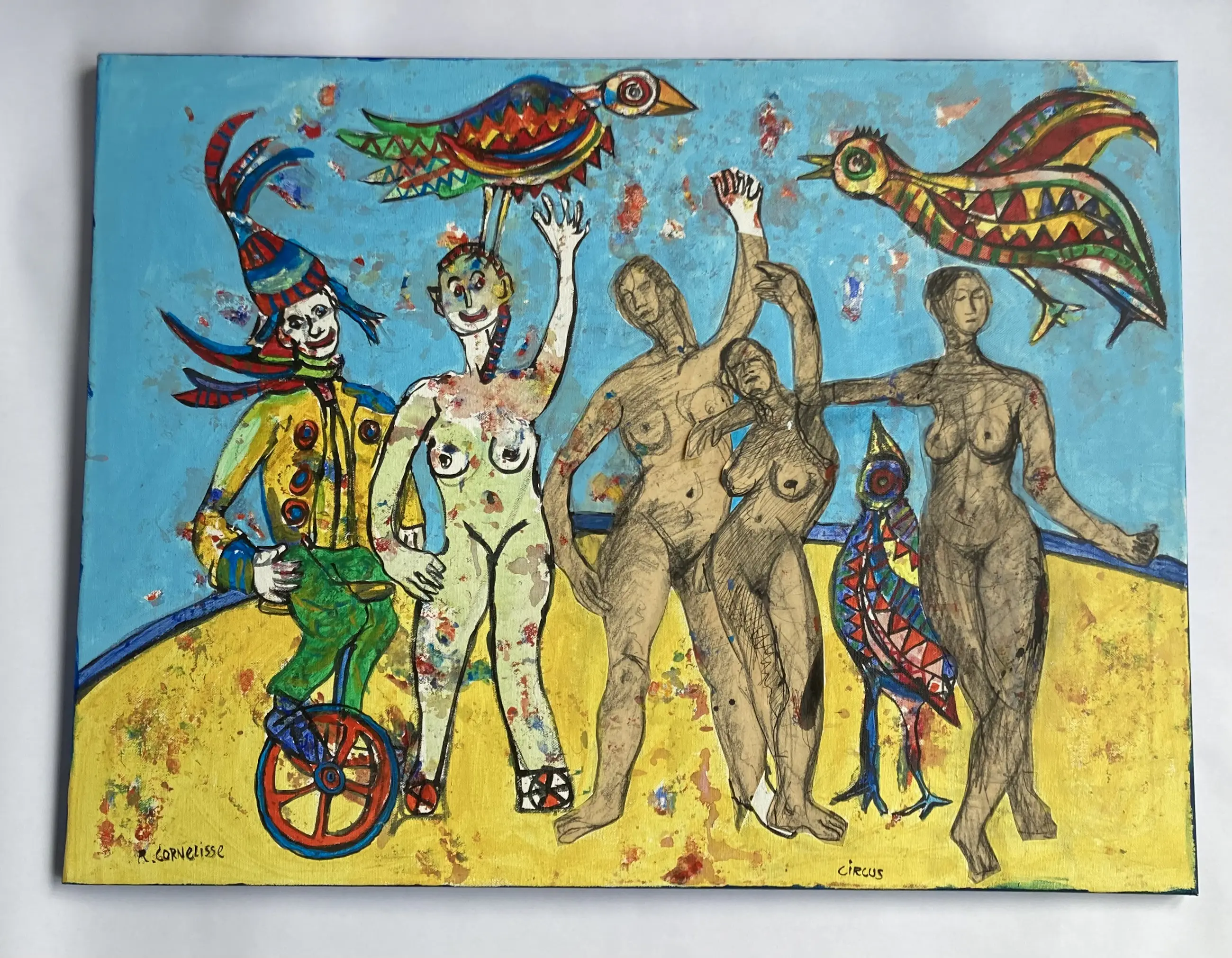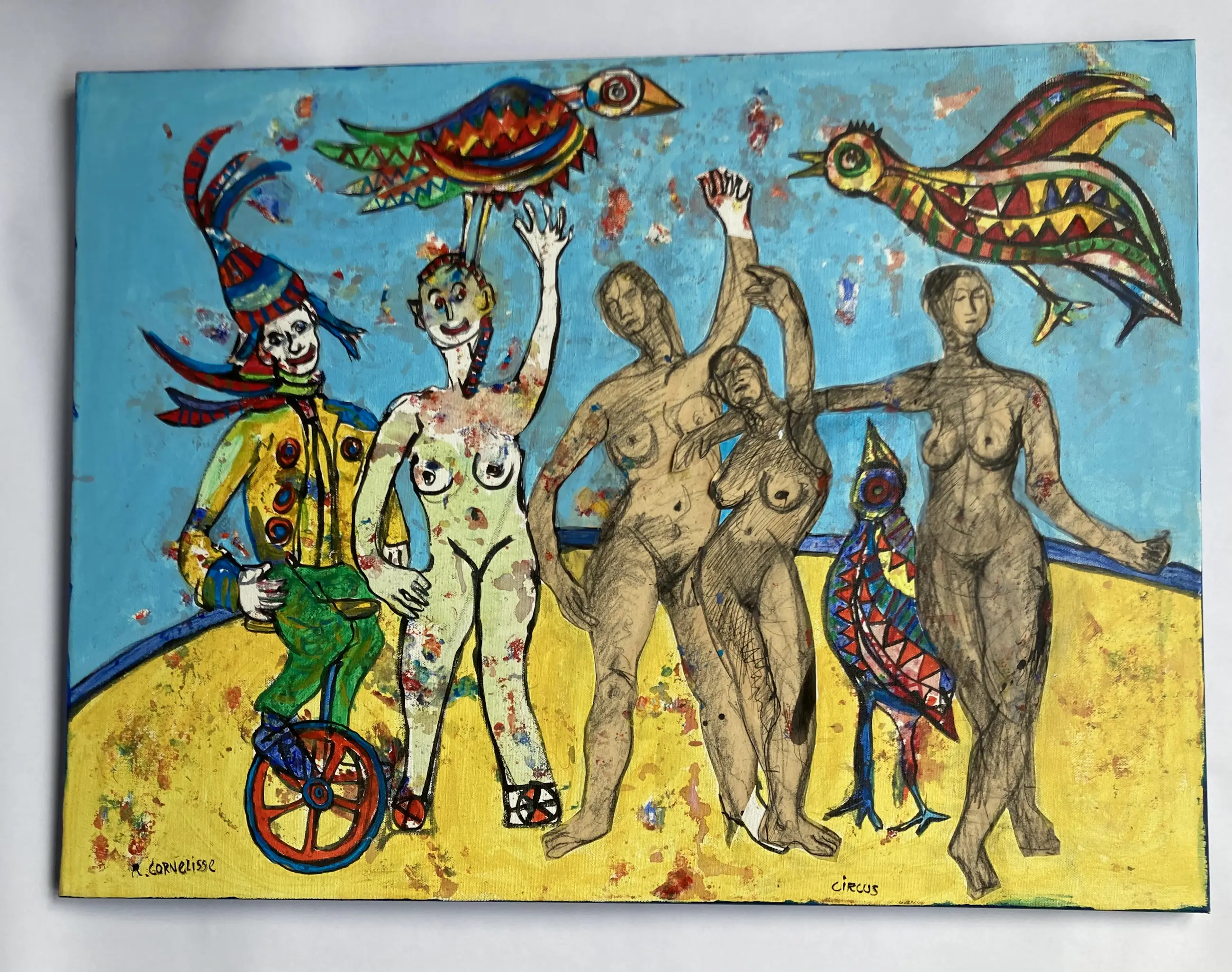 Dit schilderij van Ruud Cornelisse (1940 - 2024) is gemengde techniek. Het is acrylverf op doek en er zijn door hem tekeningen opgeplakt die hij eerder maakte. Aan de achterzijde zijn 2 zwakke plekken verstrekt met zuurvrije tape door de kunstenaar. Hij heeft daar ook nogmaals gesigneerd en de titel 'dames en vogels in het circus' opgeschreven. Het doek is niet ingelijst, de zijkanten zijn mee geschilderd. Naar schatting gemaakt tussen 2000 en 2010. 80 cm breed en 50 cm hoog. U kunt het schilderij ophalen (dat heeft mijn voorkeur), laten bezorgen door GLS of laten halen en bezorgen door een koeriersdienst. Voor de koeriersdienst kunt u gebruikmaken van de wijze zoals elders op de pagina van kunstveiling is omschreven.