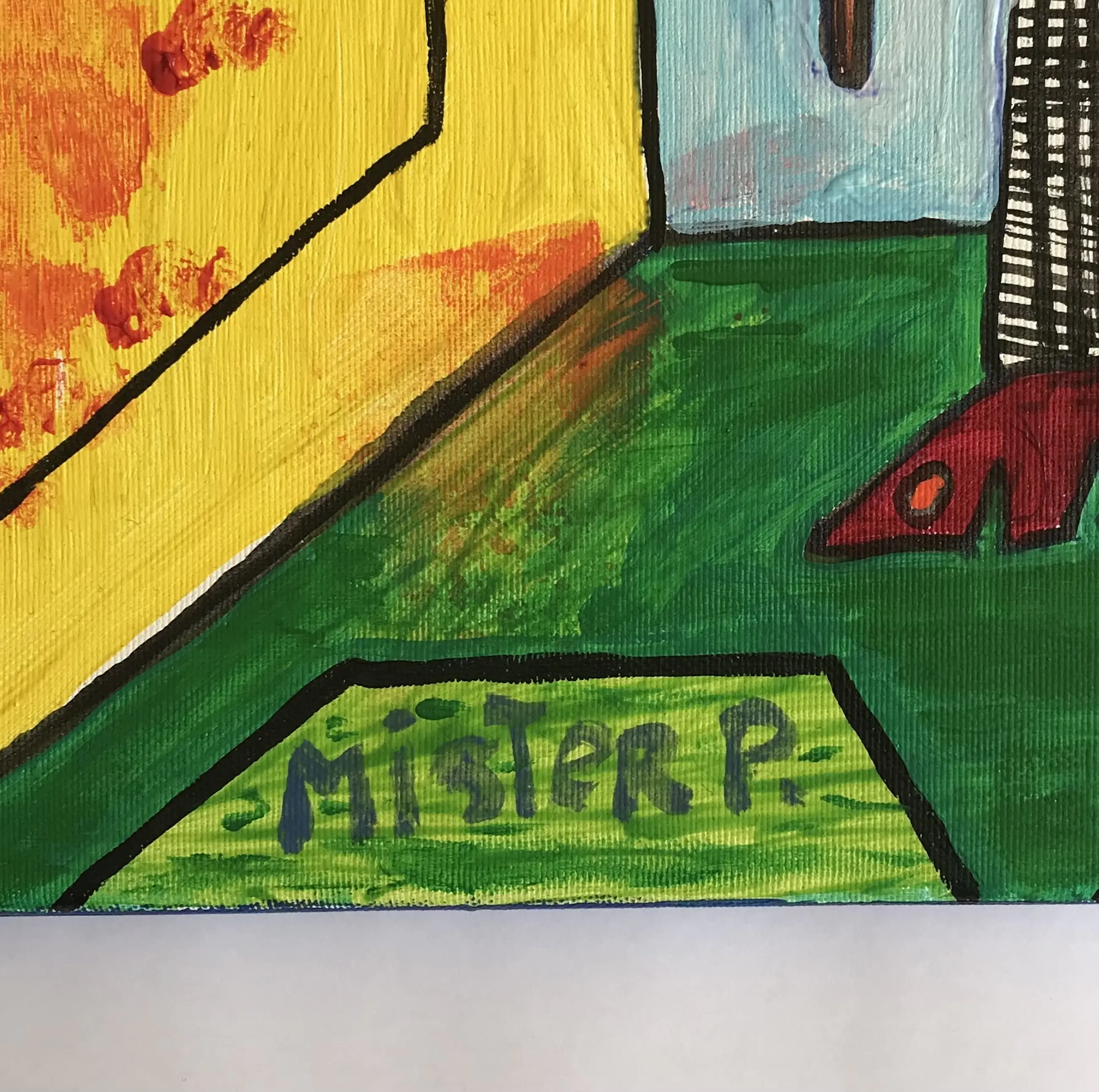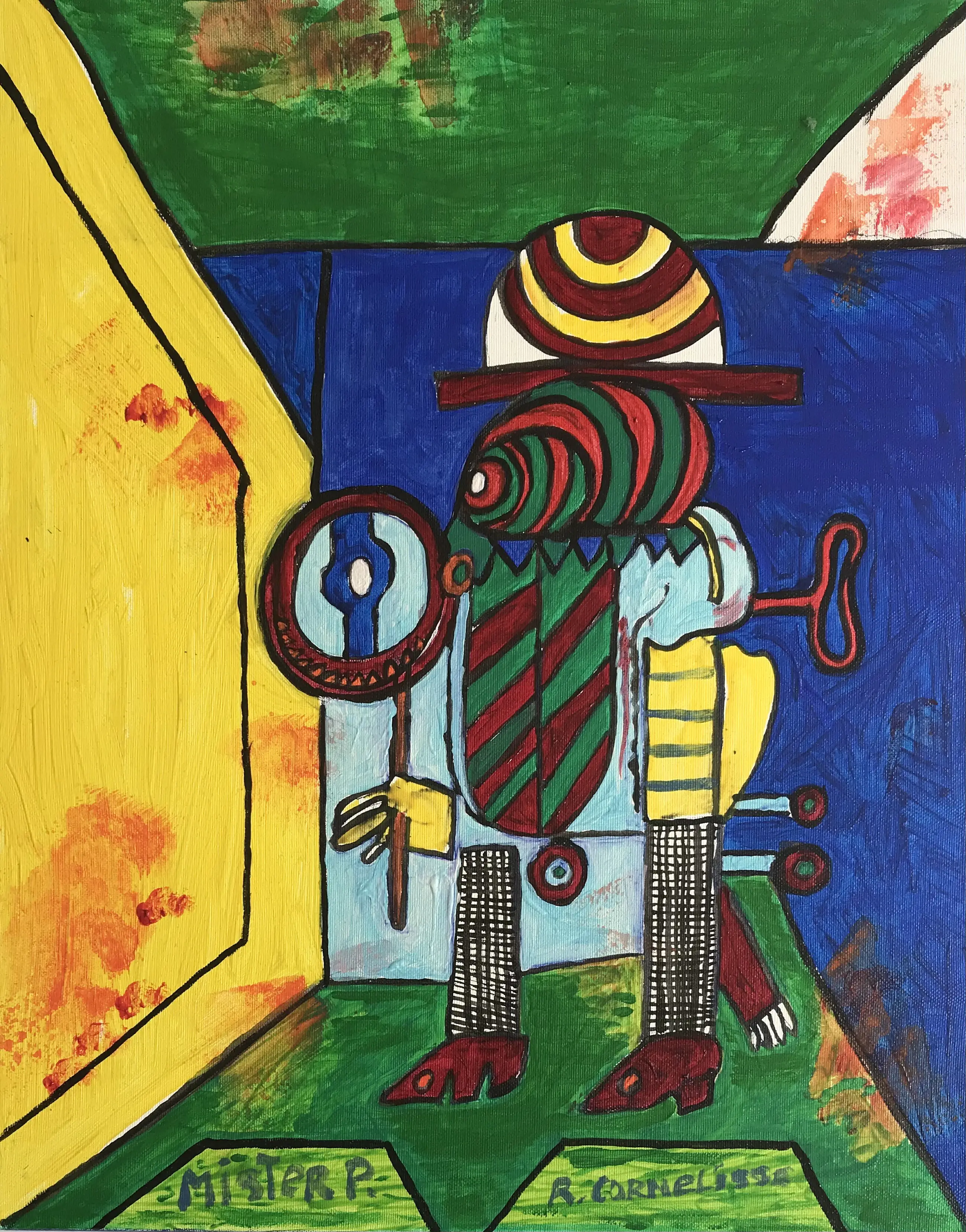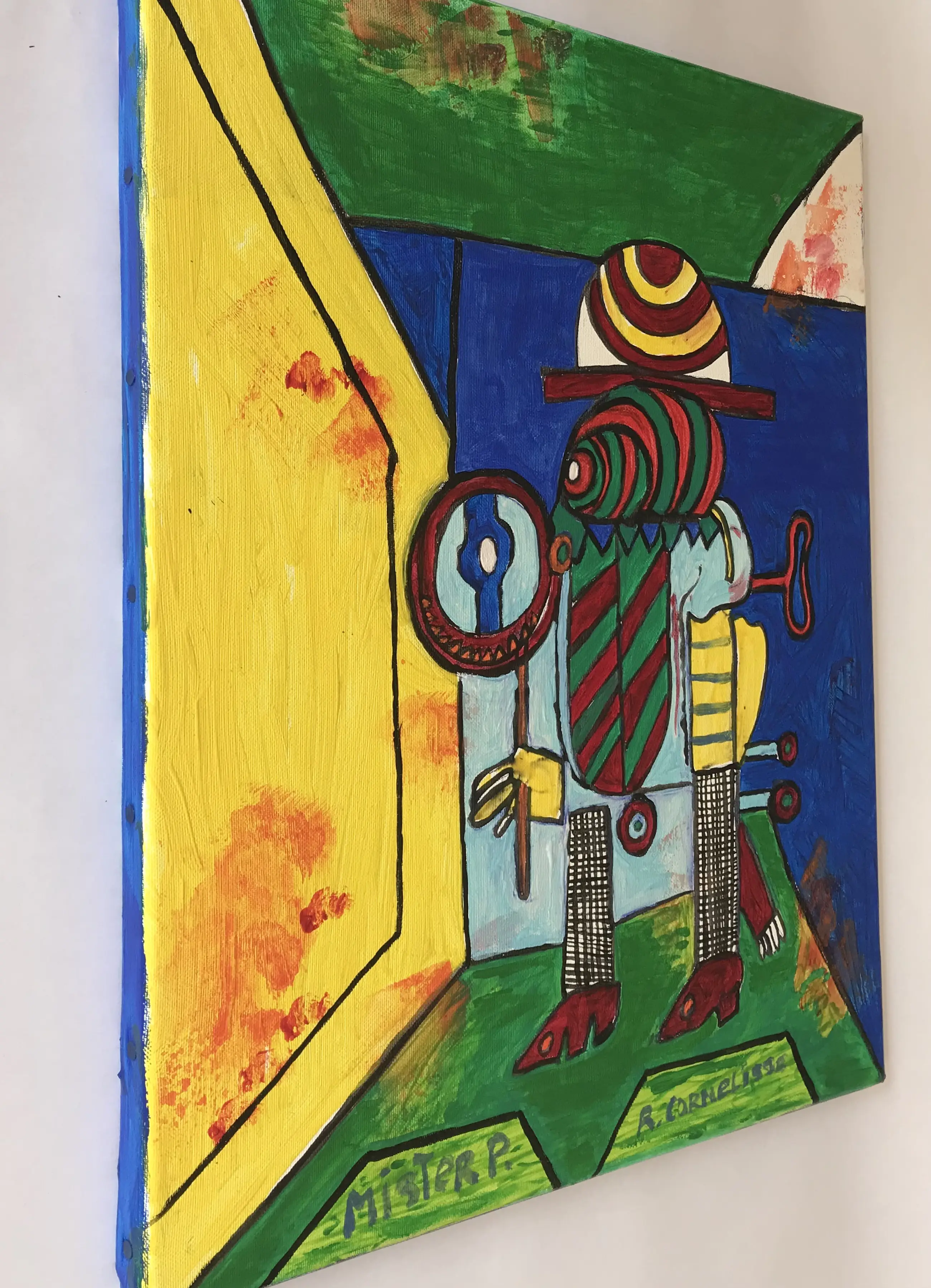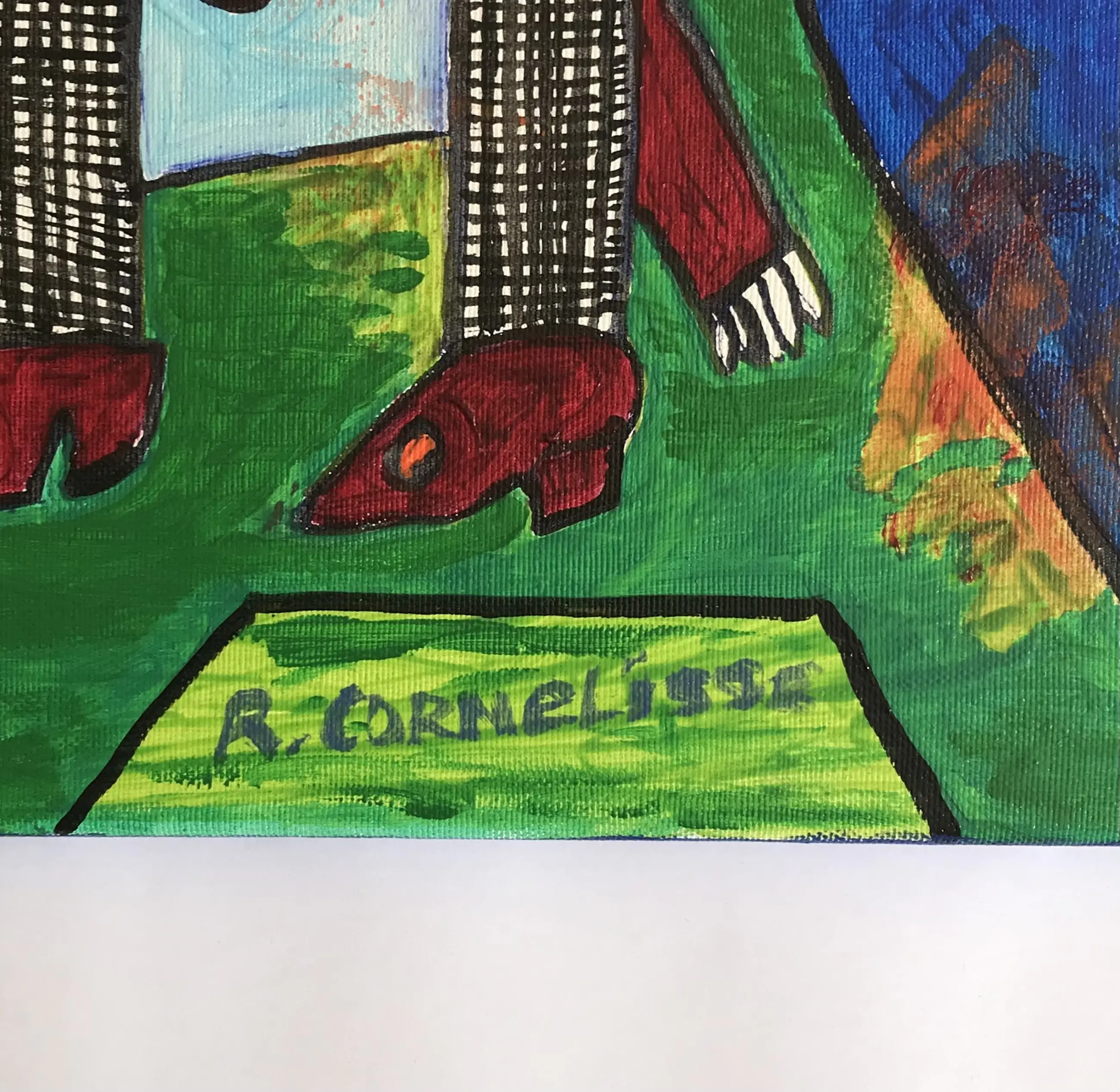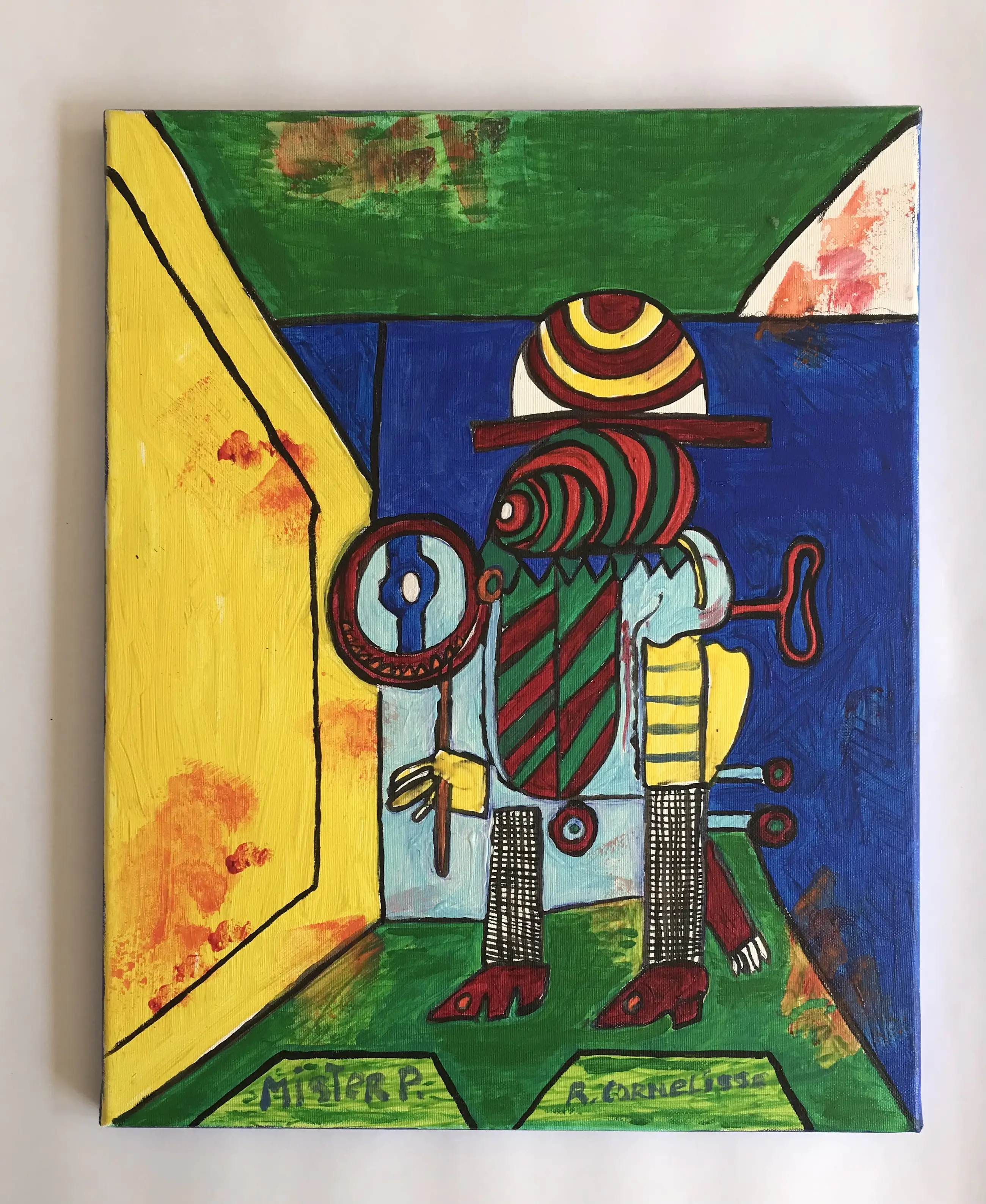 Typisch Ruud Cornelisse schilderij van Mister P. Hoogte 50 en 40 cm breed. Acrylverf met vernislaag op doek. Gesigneerd aan de voorzijde.