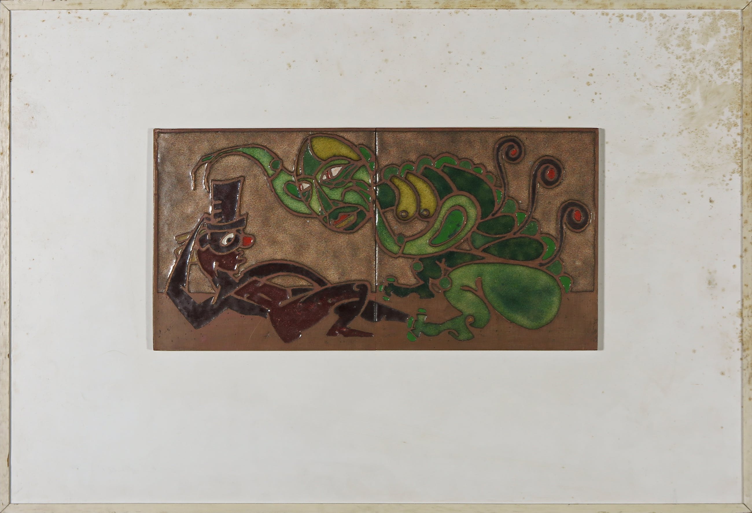 | De lijst (zonder glas, met houten passe-partout) is behoorlijk vuil/beschimmeld. De tegels zijn in goede staat. | |