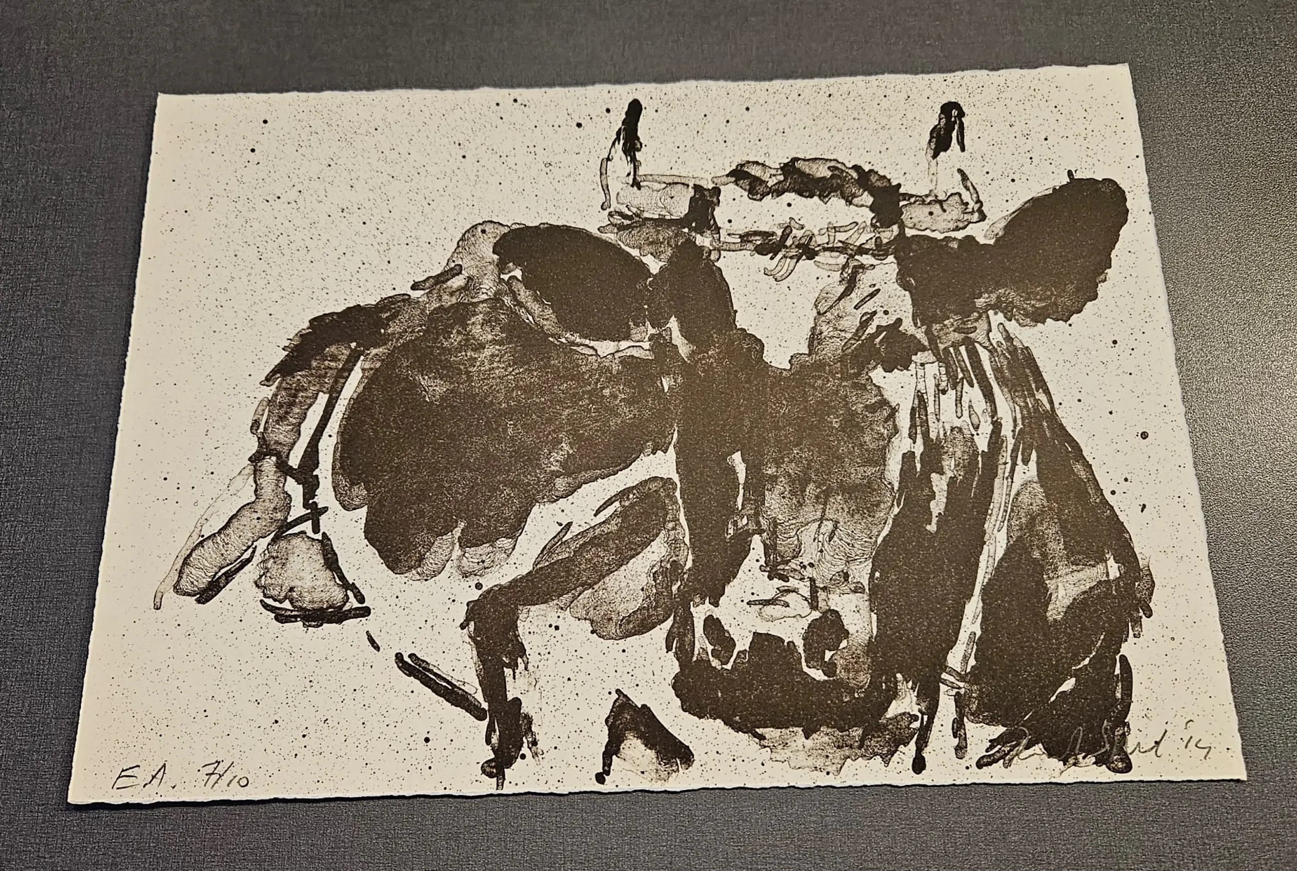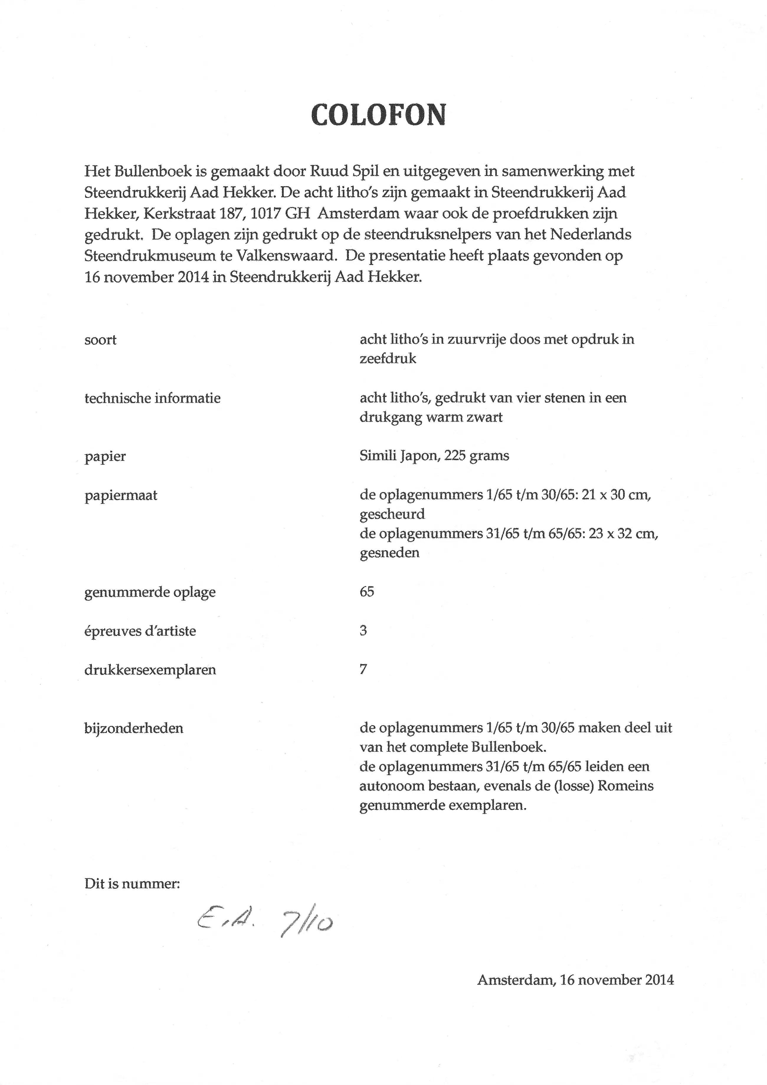 8 prenten uit het Bullenboek van Ruud Spil, zonder doos. Gedrukt in steendruk museum Valkenswaard, zie colofon.