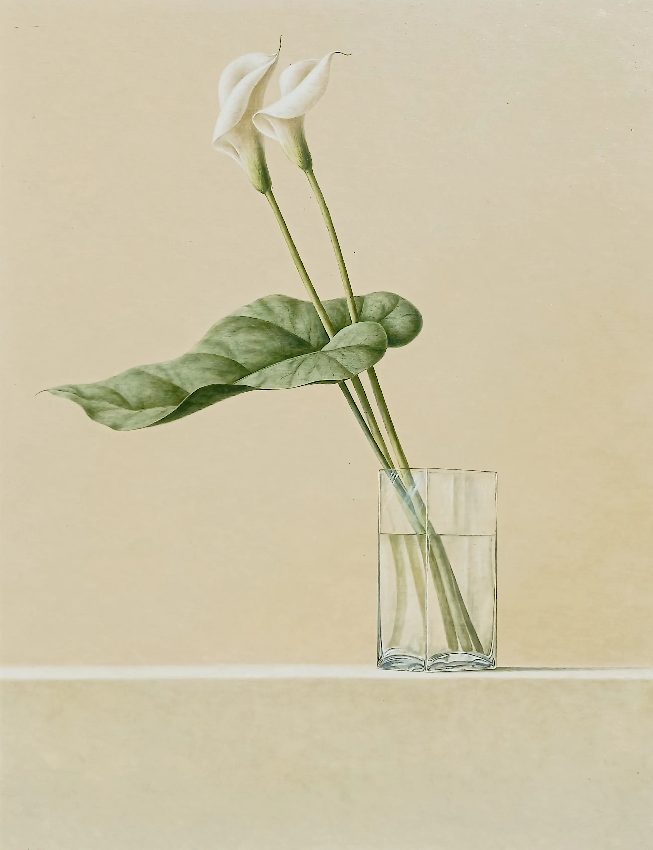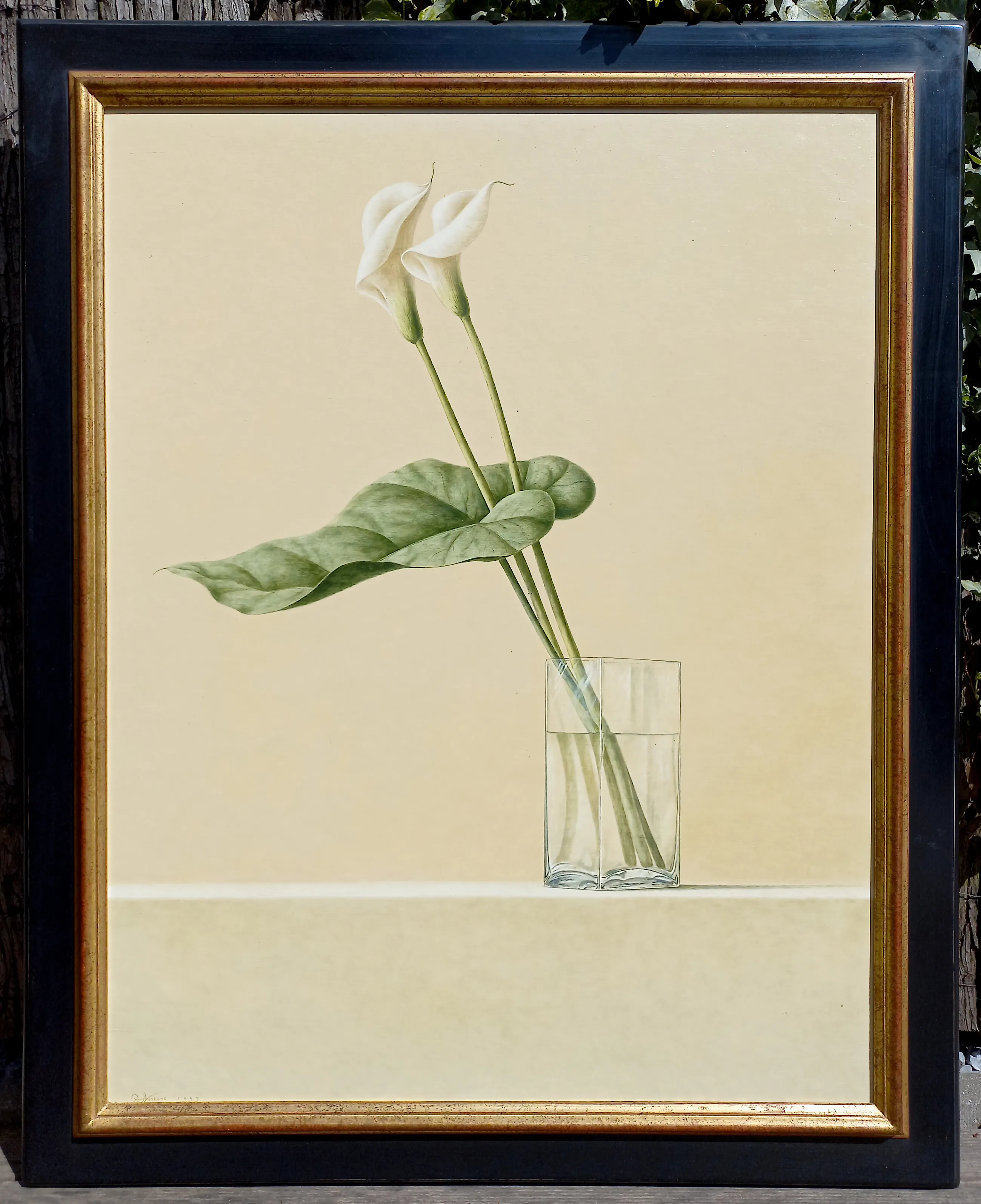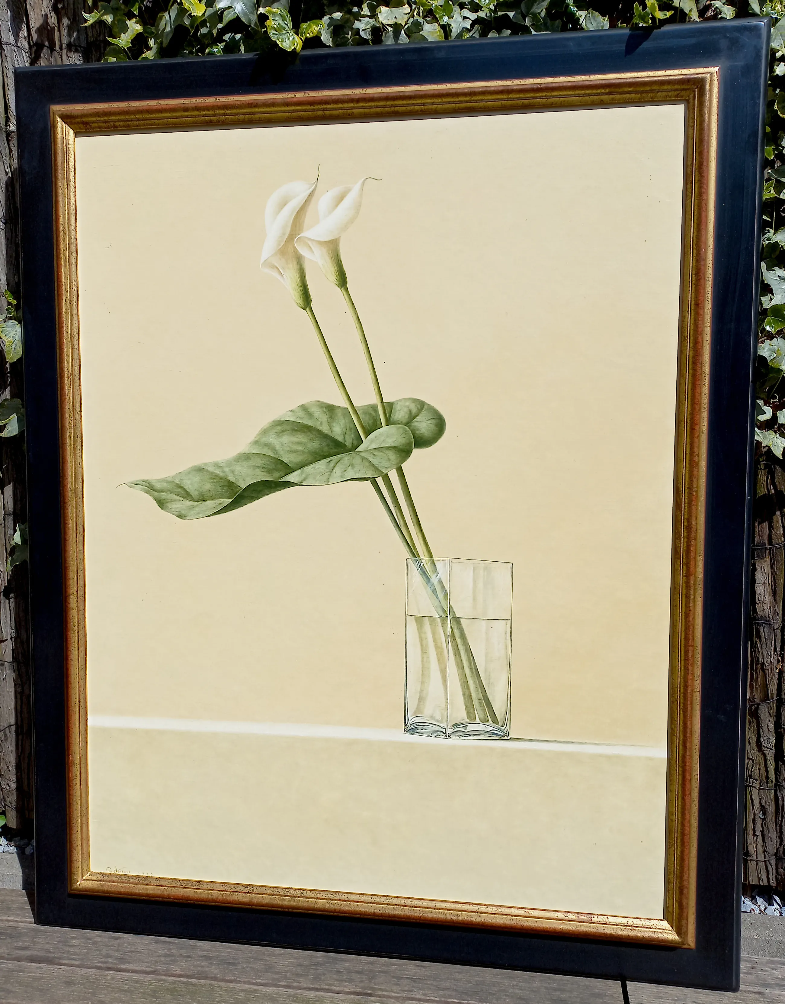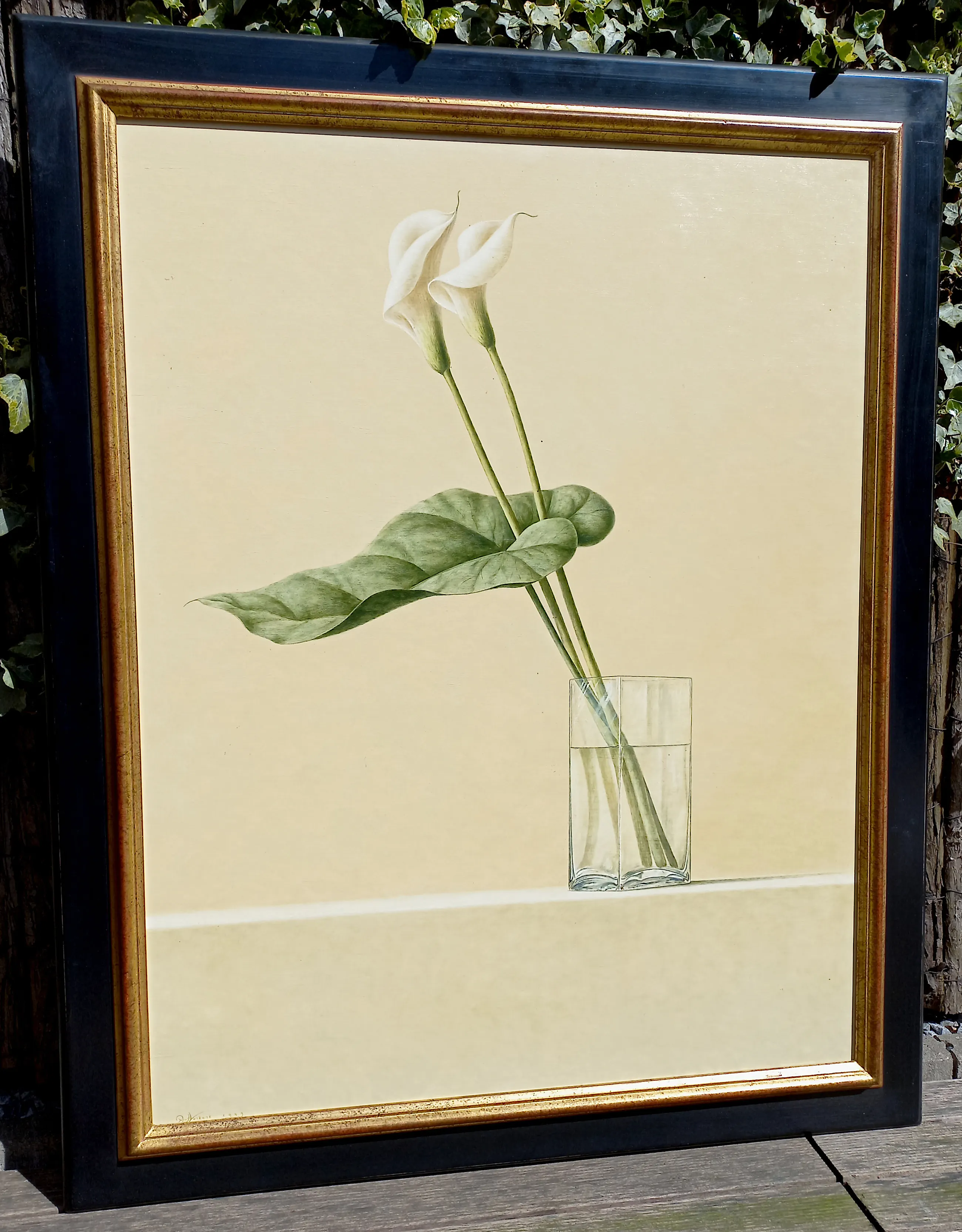 Het enige wat er op af te dingen is dat er op het werk een tiental minuscule stipjes zitten die van een afstand niet of nauwelijks zichtbaar zijn maar van dichtbij wel. De meest prominente zit rechts van de stengel, met wat minimale, professionele retouchering is het werk weer in mint conditie.