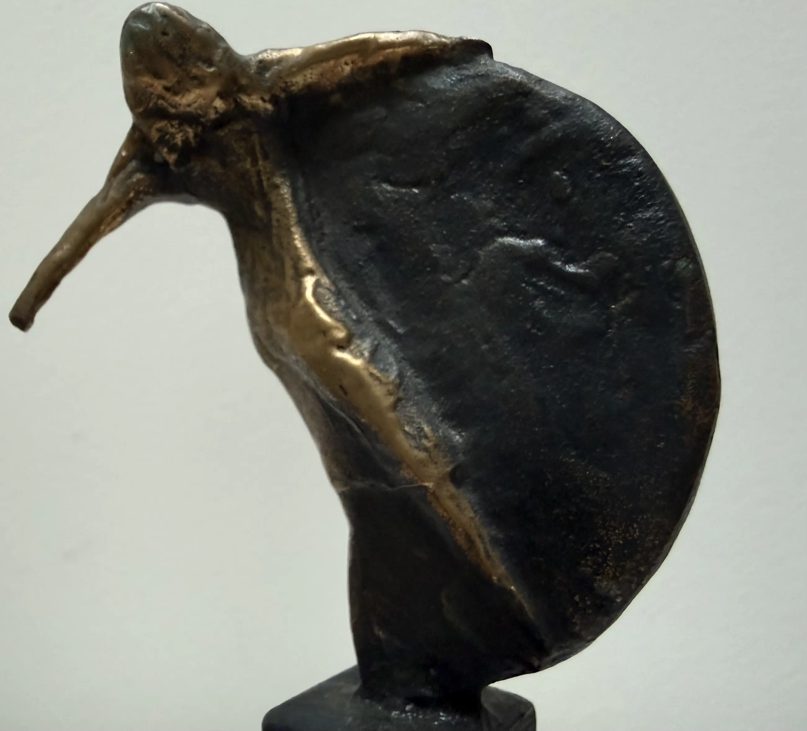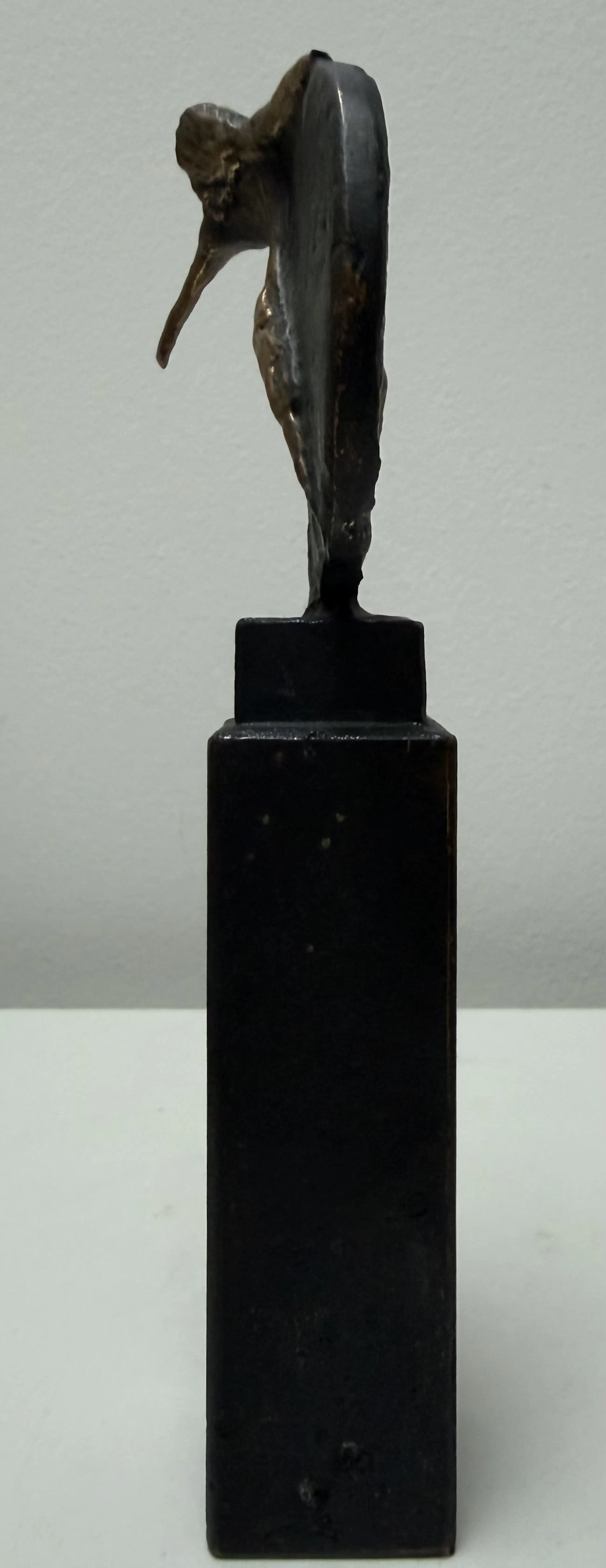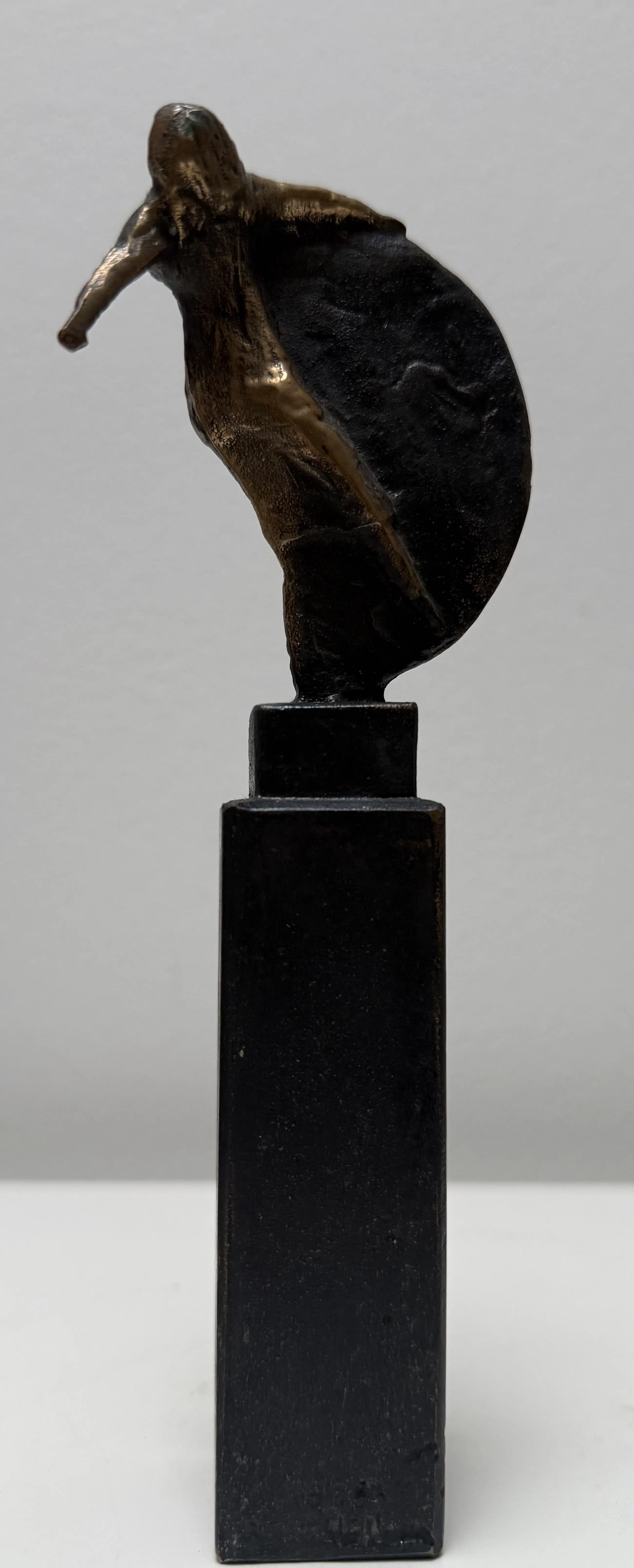 Mooi vormgegeven naakt vrouwfiguur met een halve cirkel. Het sculptuur is volledig van brons.