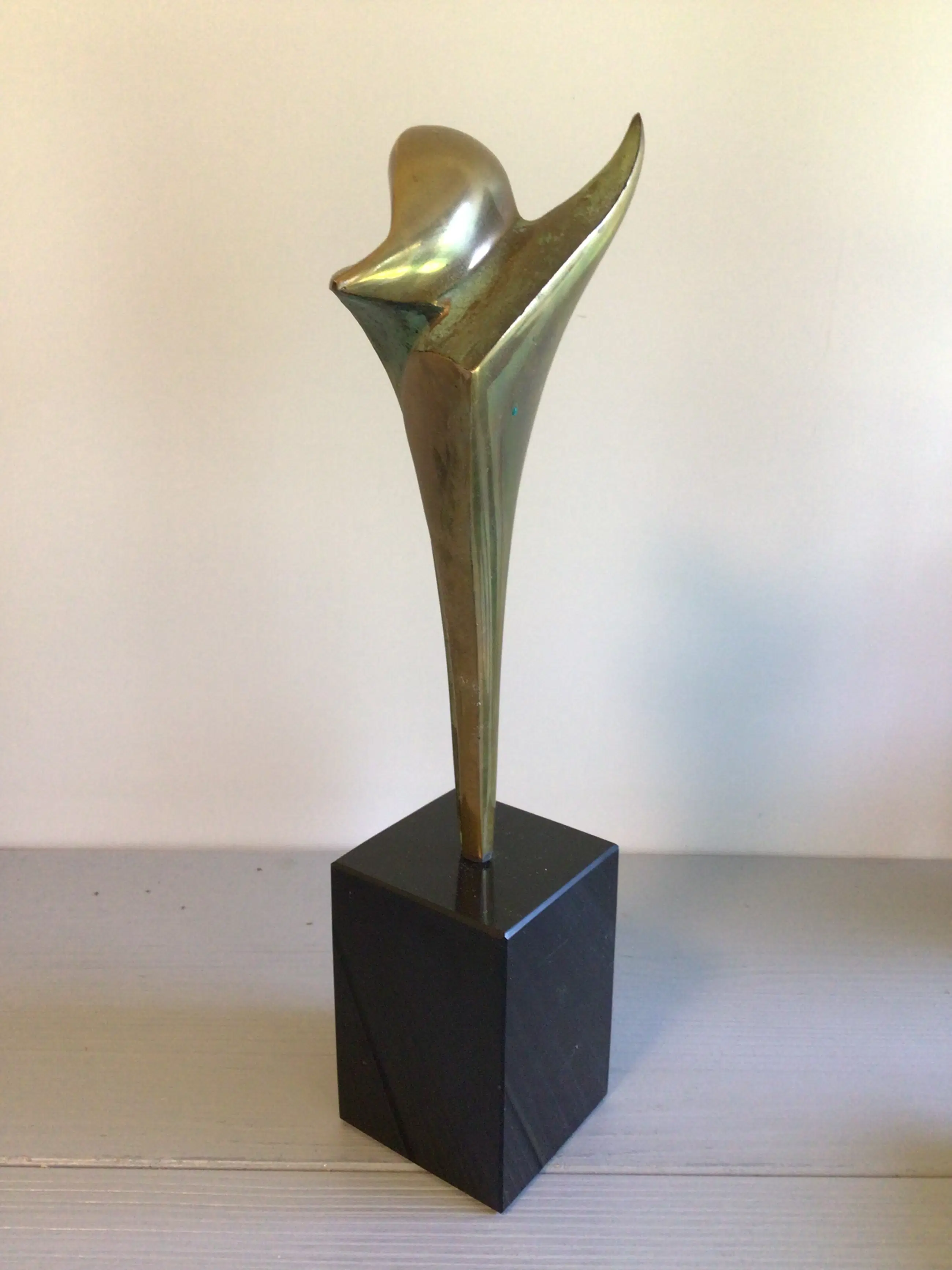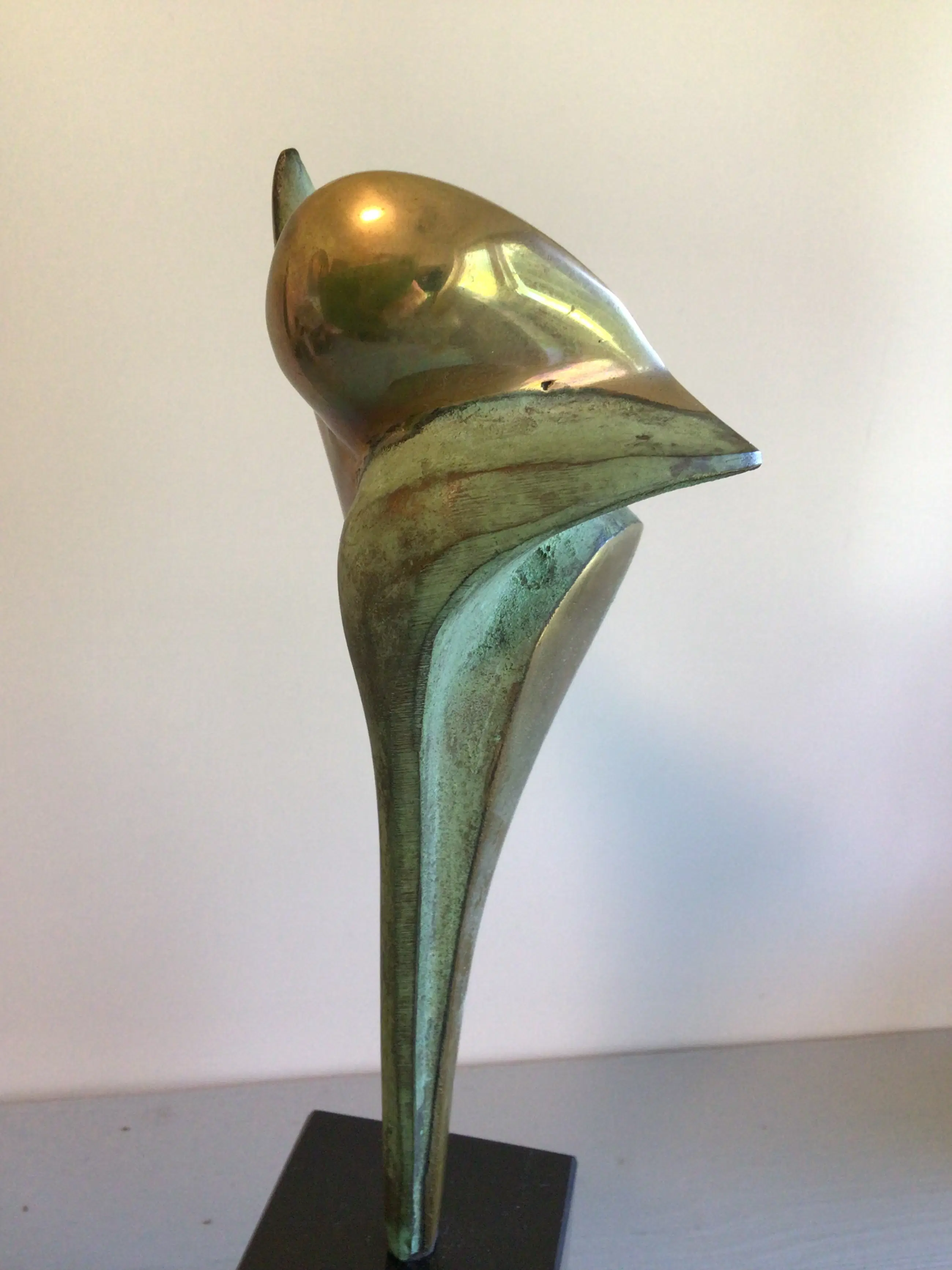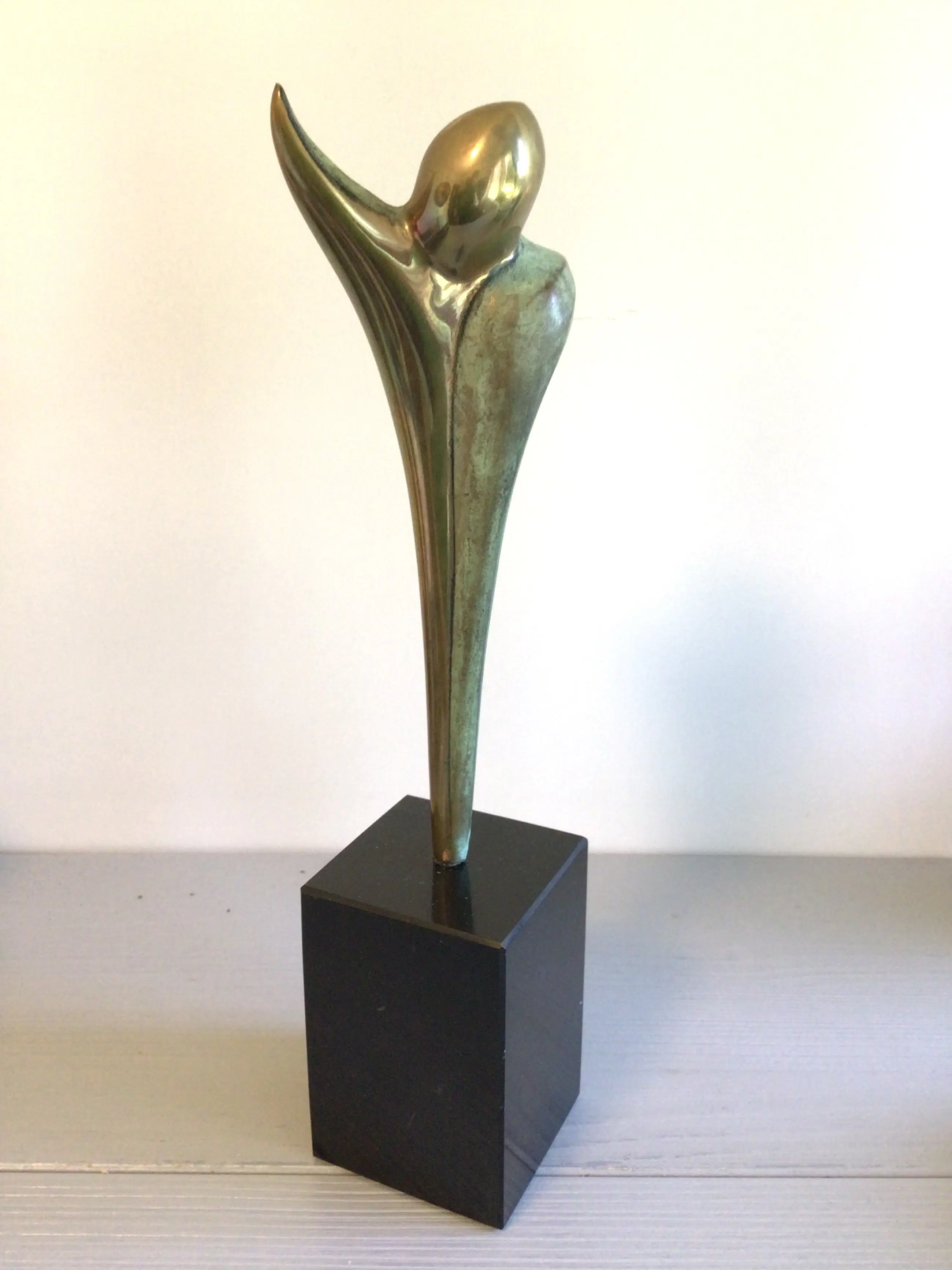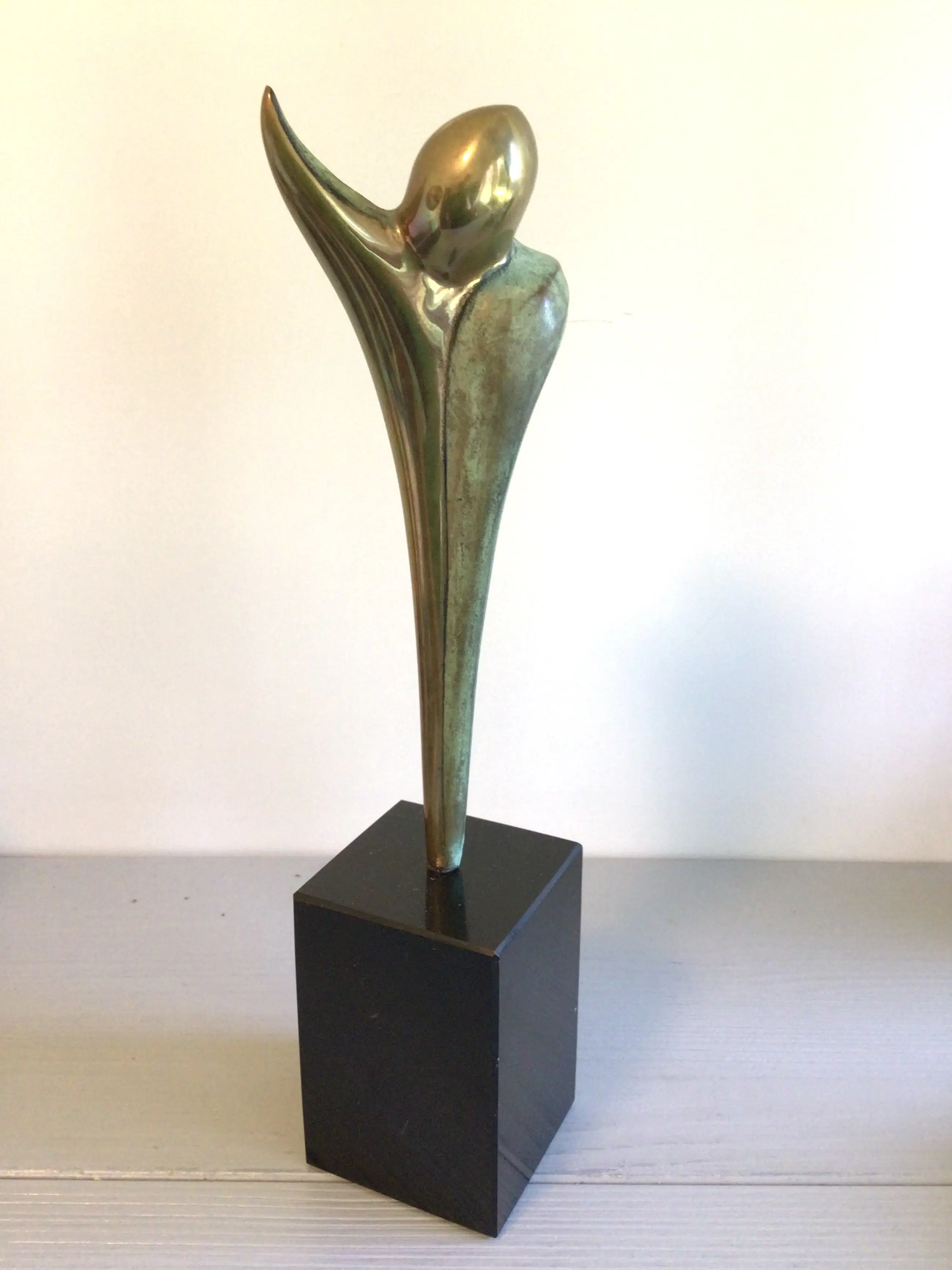 Zeer fraai vormgegeven stilistisch sculptuur van de bekende Nederlandse kunstenaar Ruurd Halsema. Titel “ Adieu “ Het sculptuur heeft een chique uitstraling door het goudkleurige afgewisseld met het groen kleurige patina, een zeer fraai geheel op een hoge zwart marmeren sokkel. Materiaal: brons ( verguld en koud geschilderd) Hoogte : 28 cm Het beeld verkeert in zeer goede staat en wordt zorgvuldig verpakt verzonden.