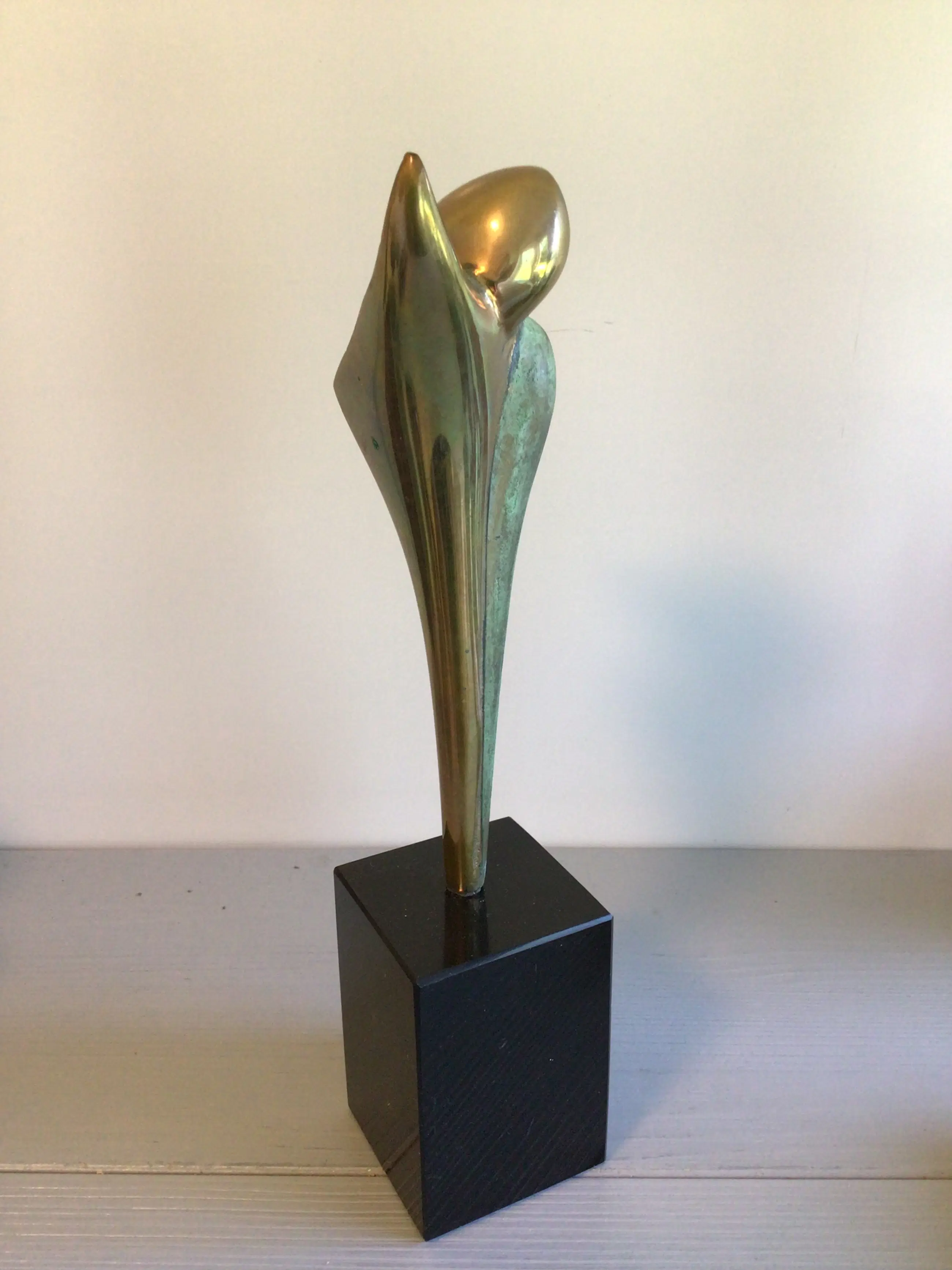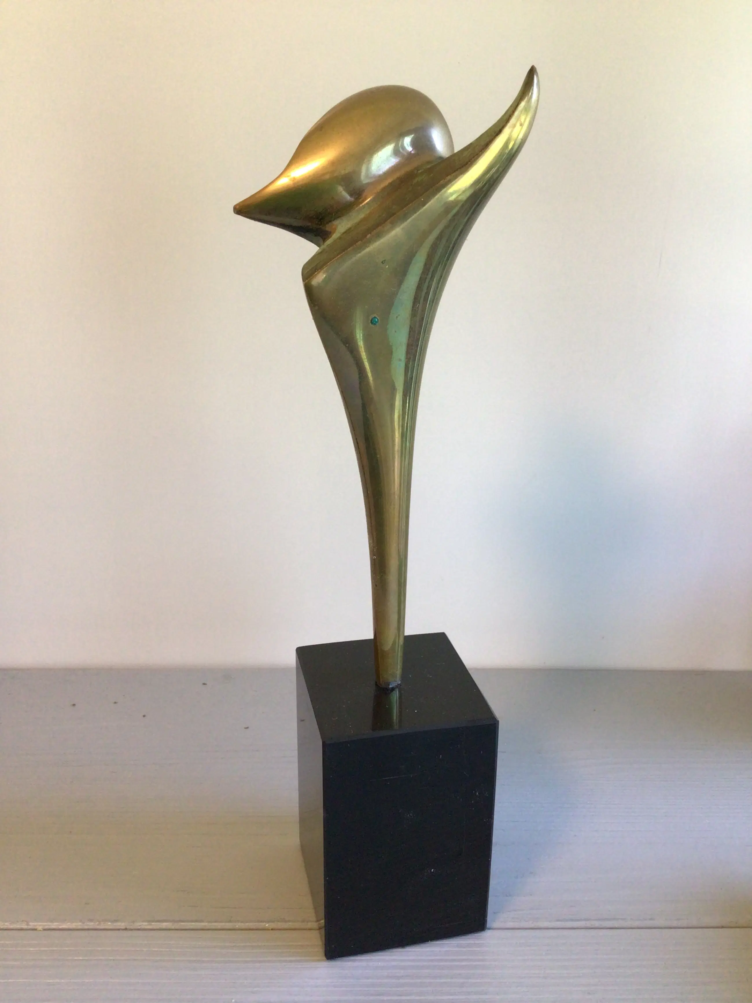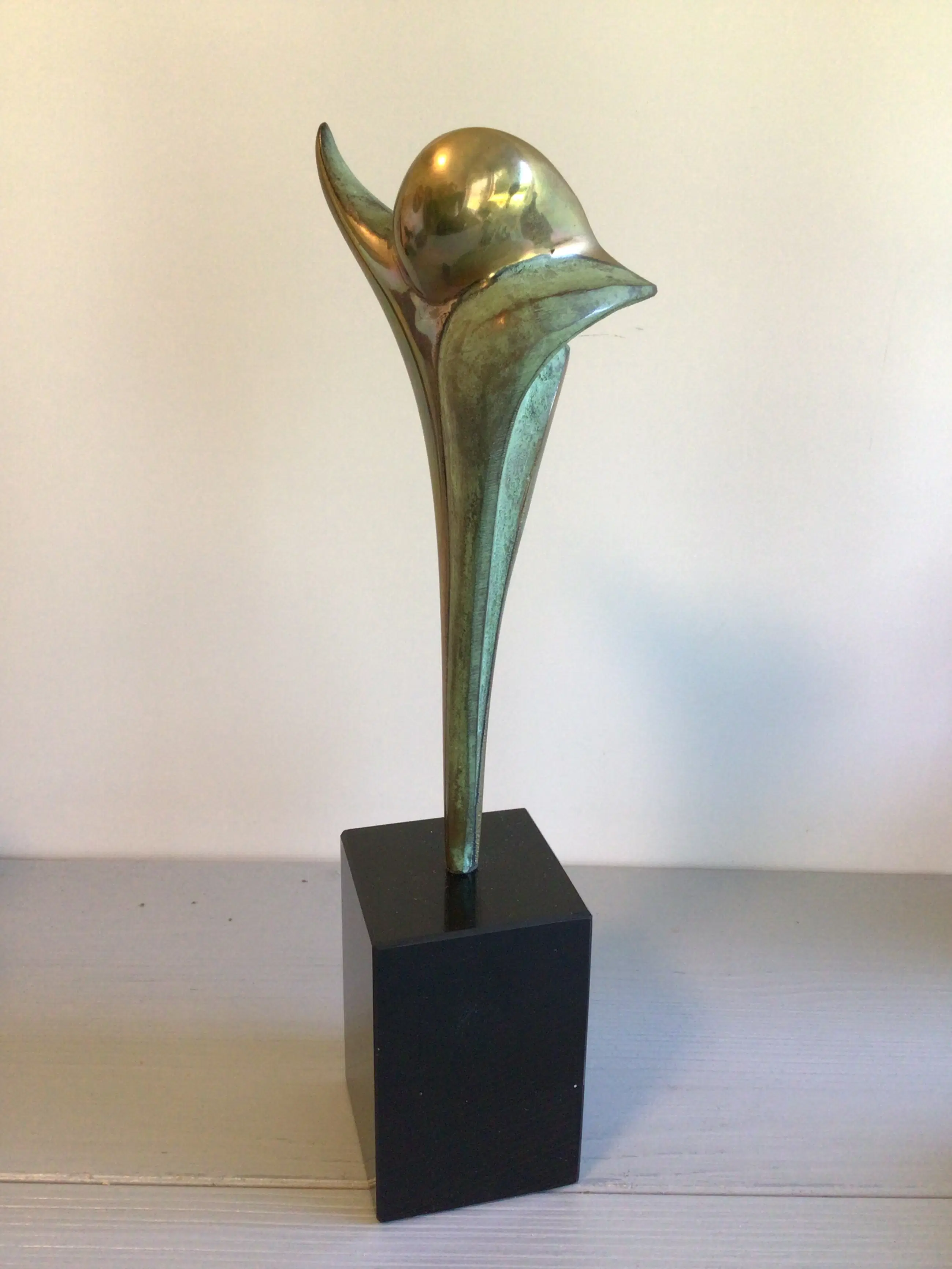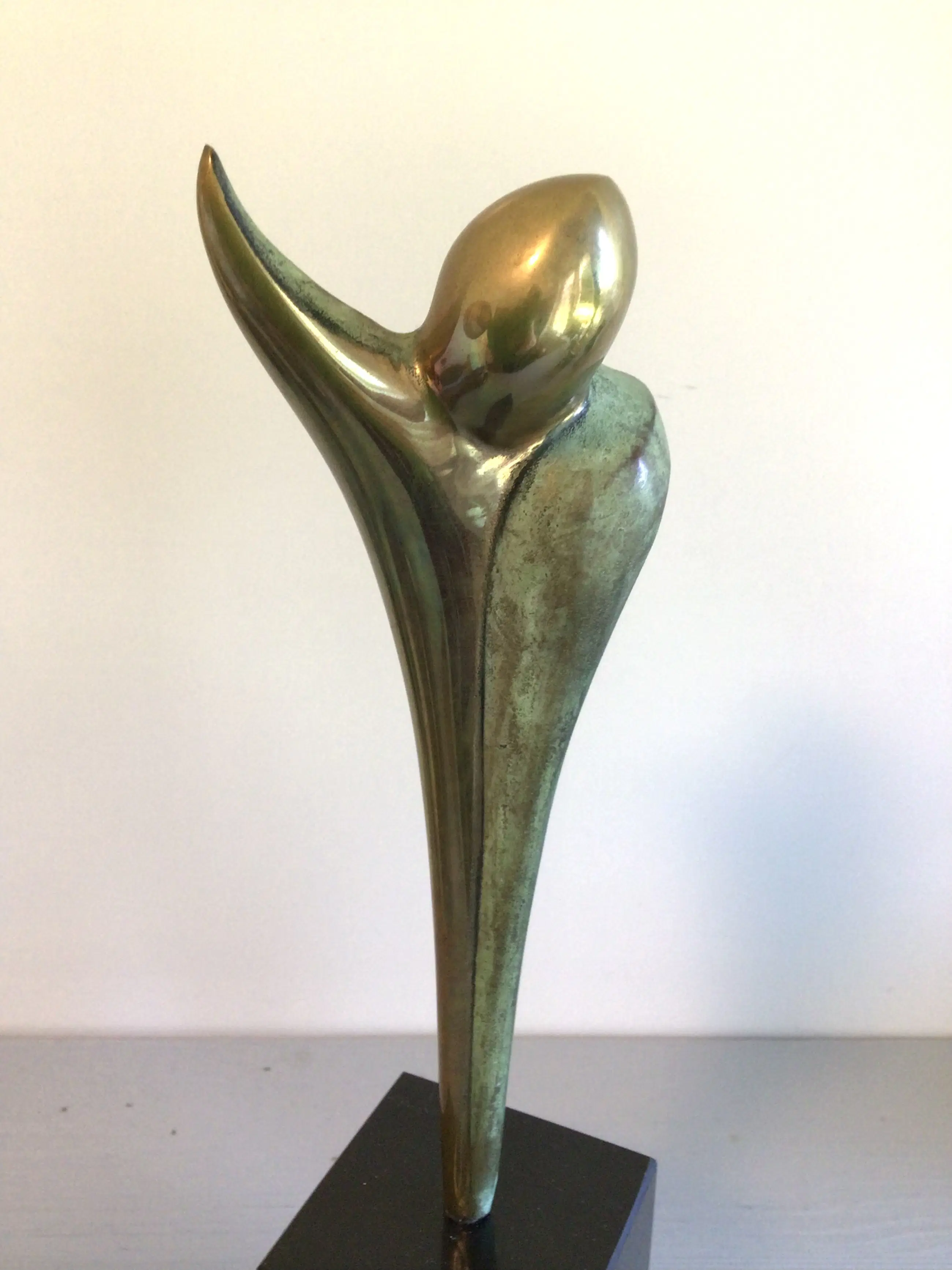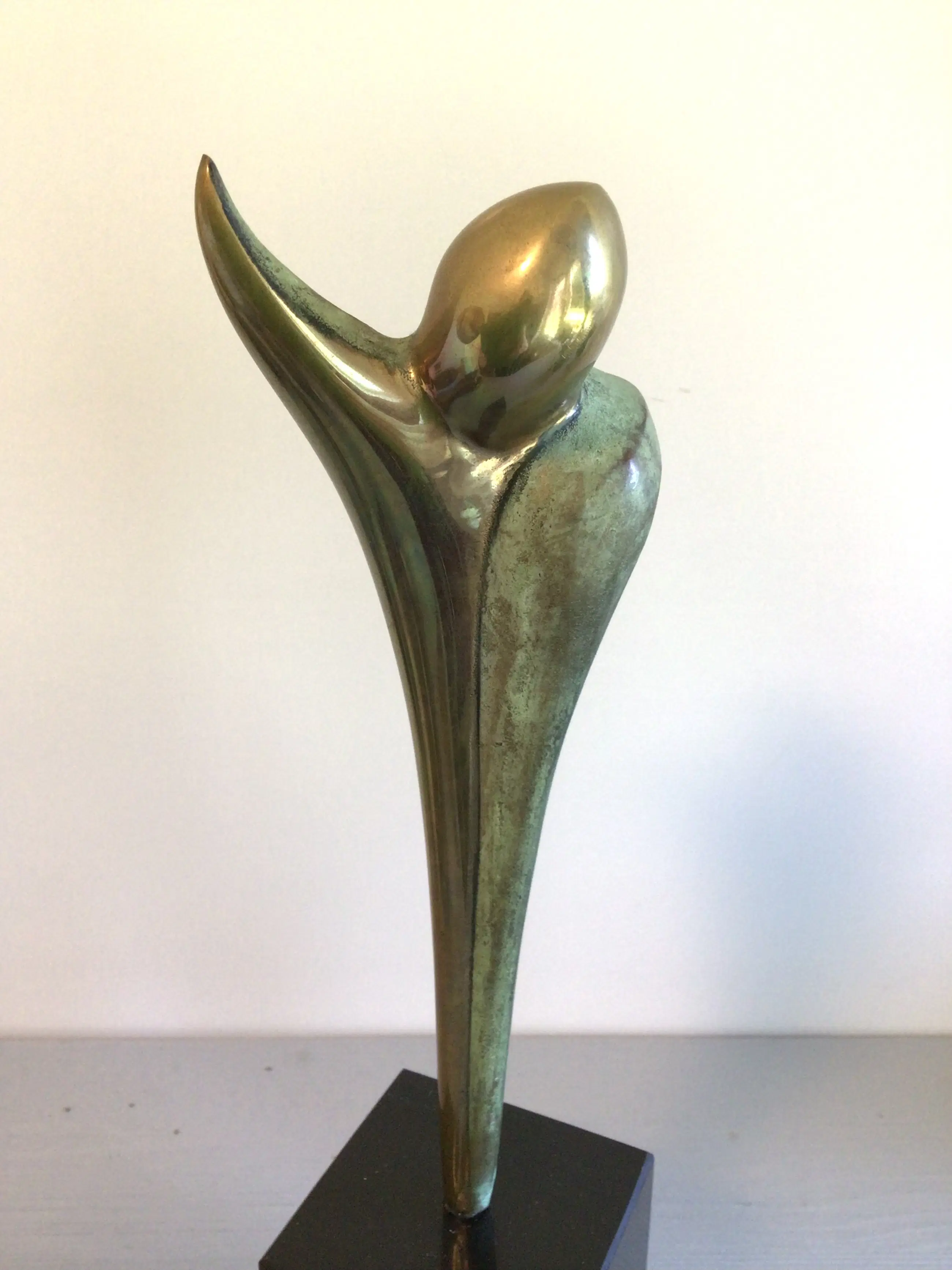 Zeer fraai vormgegeven stilistisch sculptuur van de bekende Nederlandse kunstenaar Ruurd Halsema. Titel “ Adieu “ Het sculptuur heeft een chique uitstraling door het goudkleurige afgewisseld met het groen kleurige patina, een zeer fraai geheel op een hoge zwart marmeren sokkel. Materiaal: brons ( verguld en koud geschilderd) Hoogte : 28 cm Het beeld verkeert in zeer goede staat en wordt zorgvuldig verpakt verzonden.