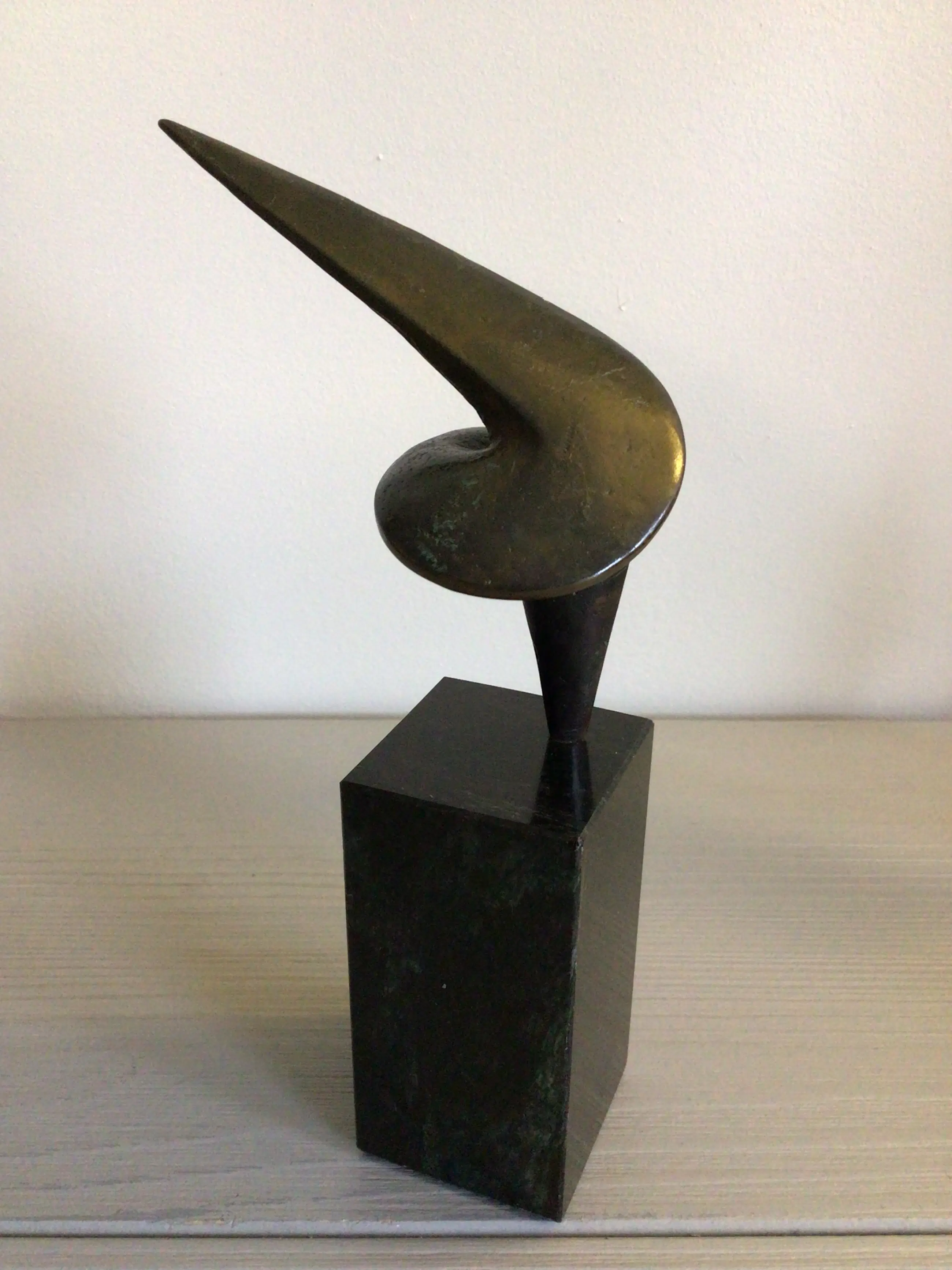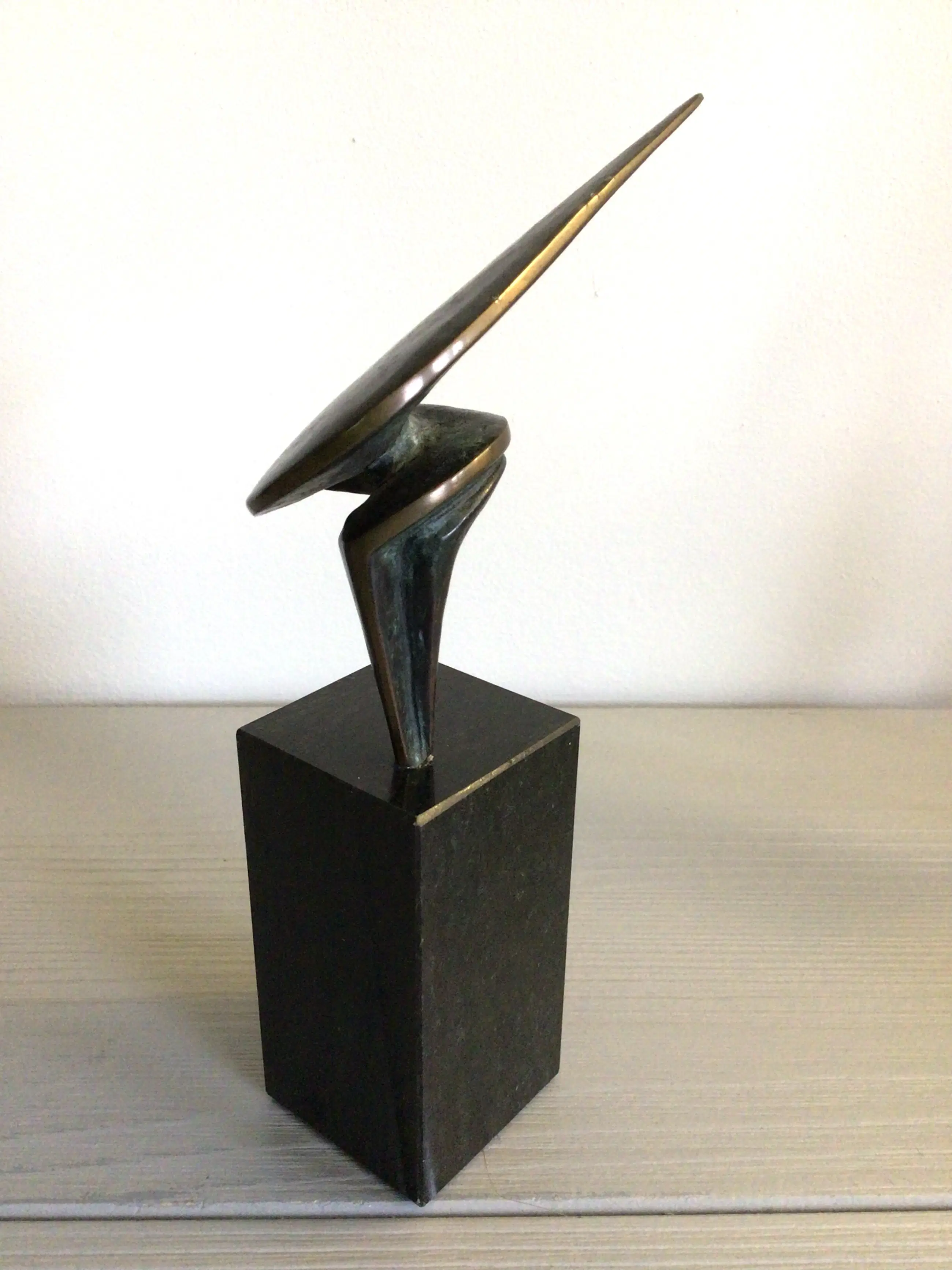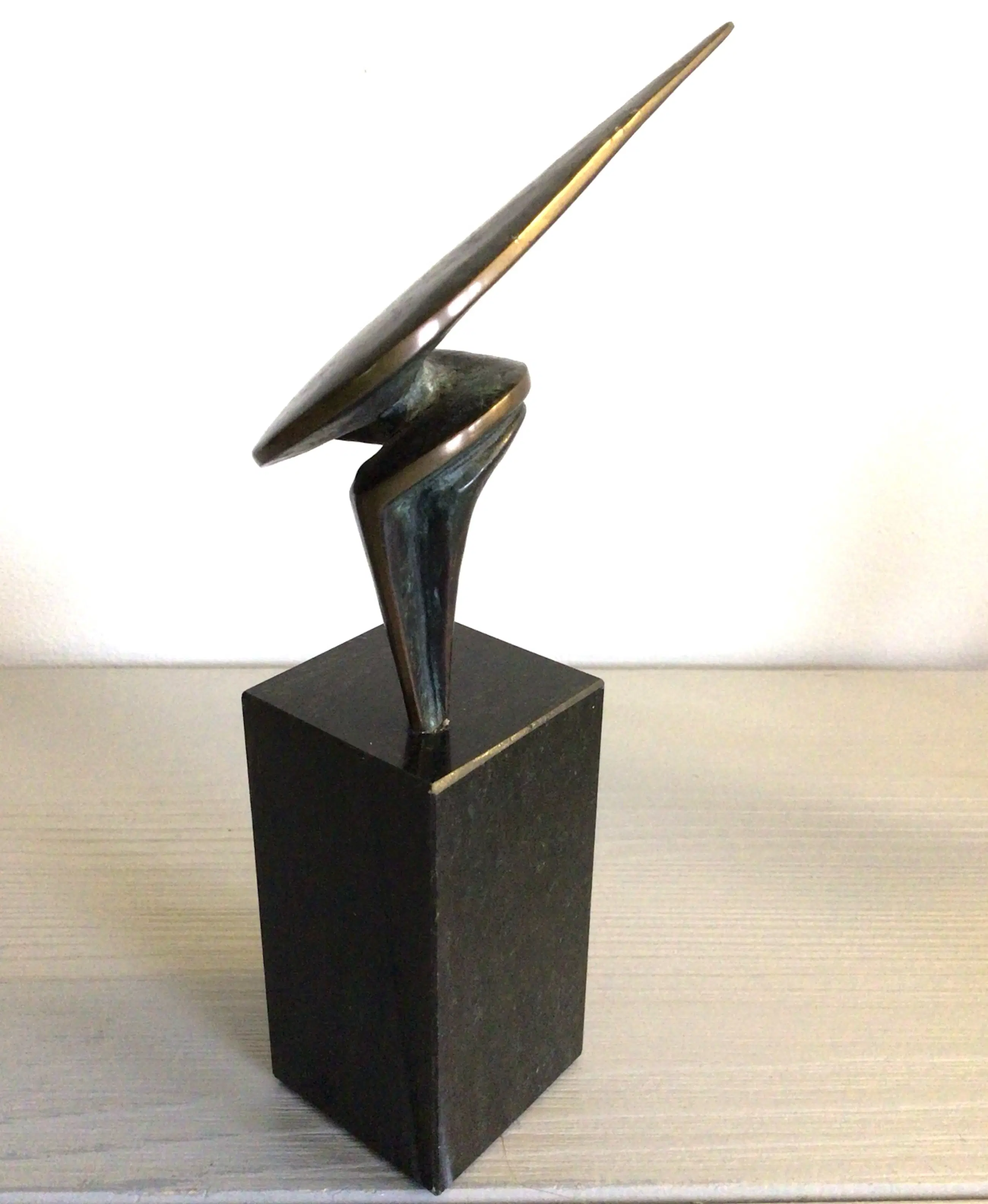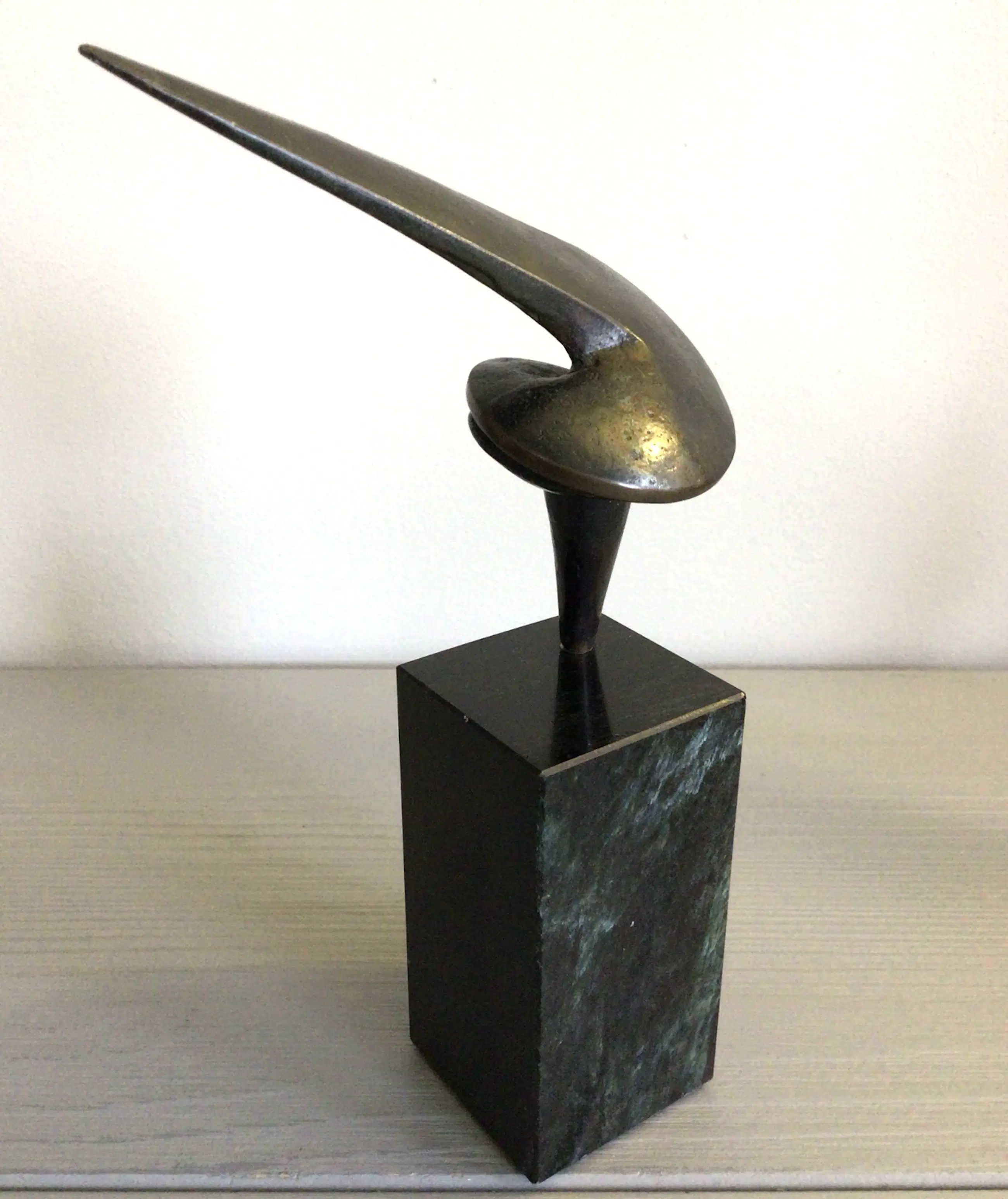 Zeer fraai vormgegeven stilistisch sculptuur van de bekende Nederlandse kunstenaar Ruurd Halsema. Titel “ Trots “ Het sculptuur heeft een chique uitstraling en vorm, hoe je het sculptuur ook neerzet. Materiaal: brons op fraaie zwart marmeren sokkel Hoogte : 16 cm Het beeld verkeert in goede staat en wordt zorgvuldig verpakt verzonden.