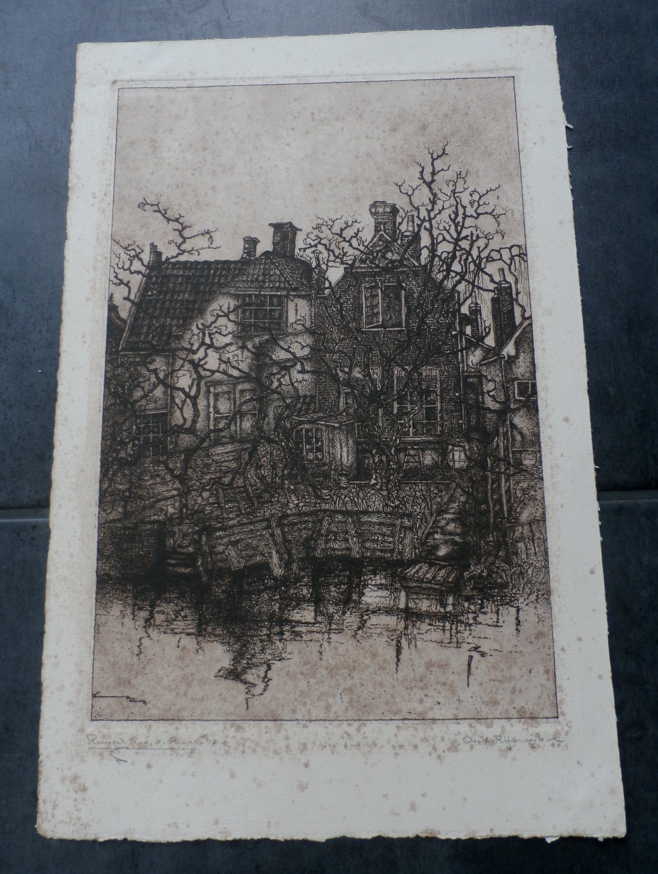 Ets van Ruurd van den Berg. Jaar: 1942. Titel: Oud Rijswijk. Afmetingen blad h36 x b23,5 cm. Afmetingen voorstelling: H29,5 x b19,5 cm. Het werk is linksonder met potlood gesigneerd door de kunstenaar. De authenticiteit van het aangeboden werk wordt vooleldig gegarandeerd. Een certificaat van echtheid kan, op aanvraag worden gemaild.