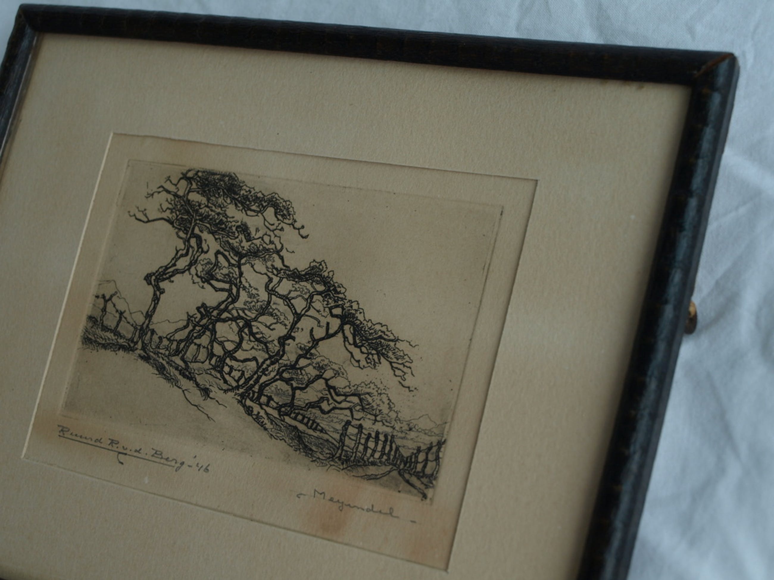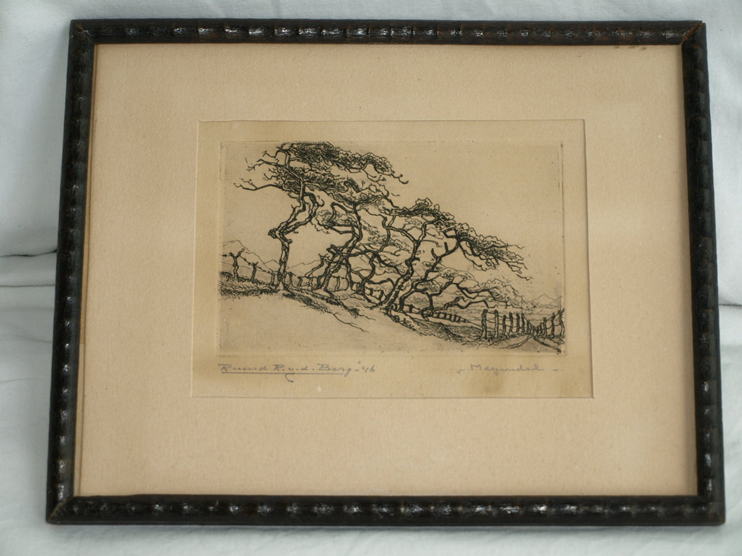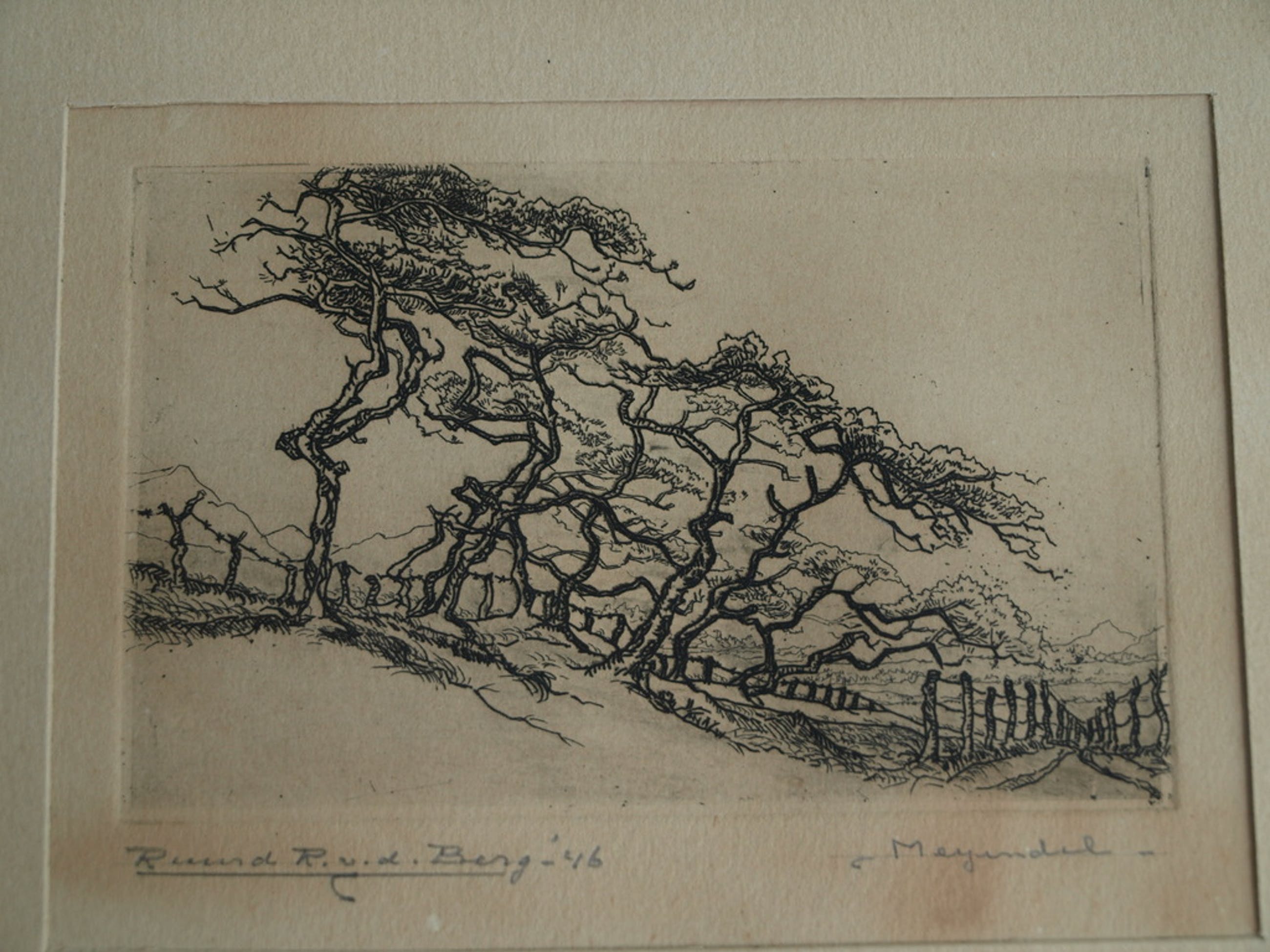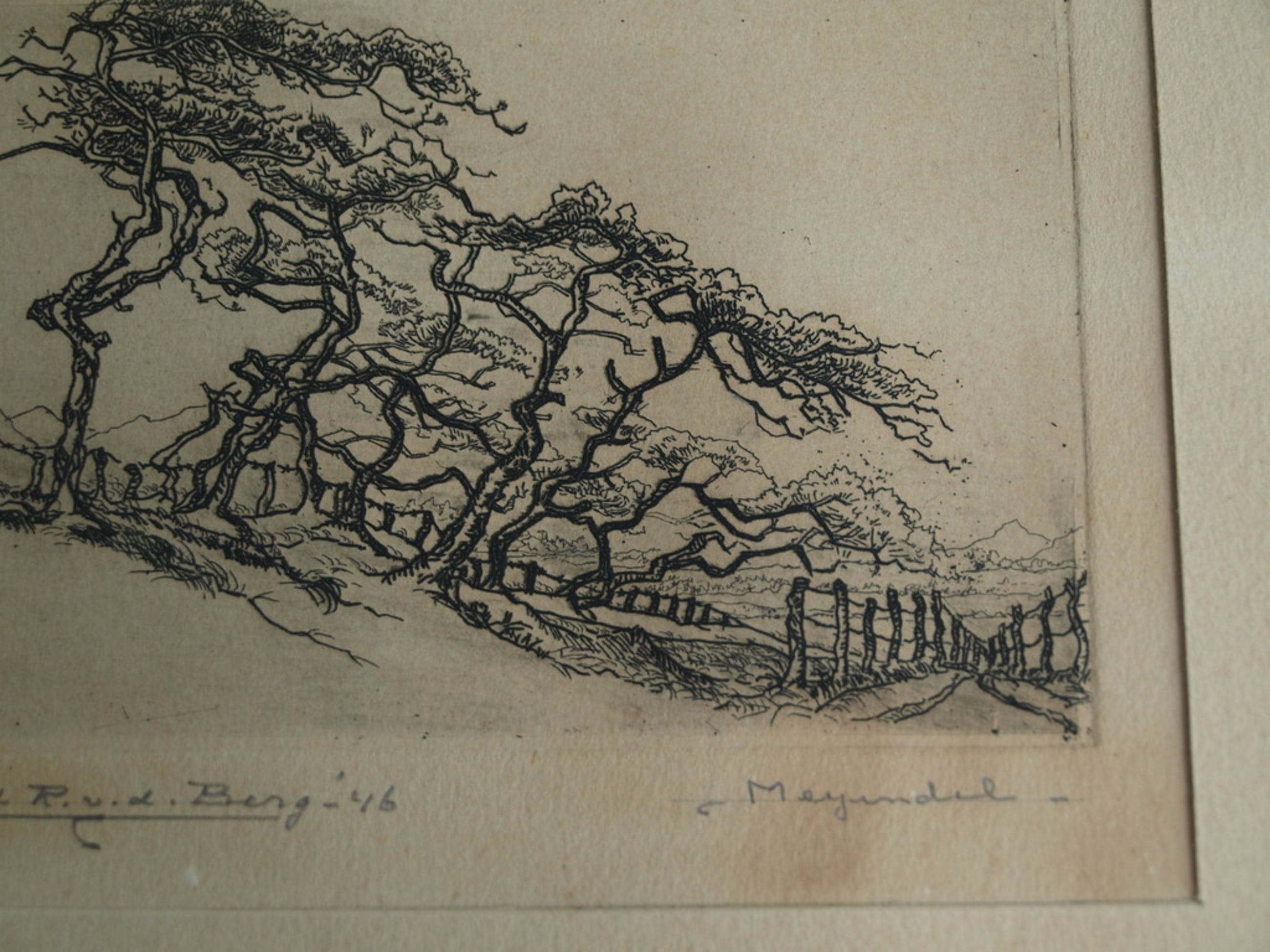 Conditie: Het papier van de ets en van het passe-partout is ‘vergeeld’. De ets zit wat ‘los’ in de lijst: het papieren tape op de achterkant zit een beetje los.