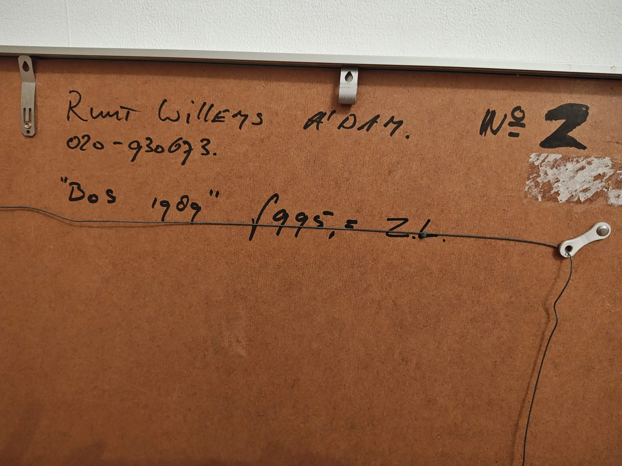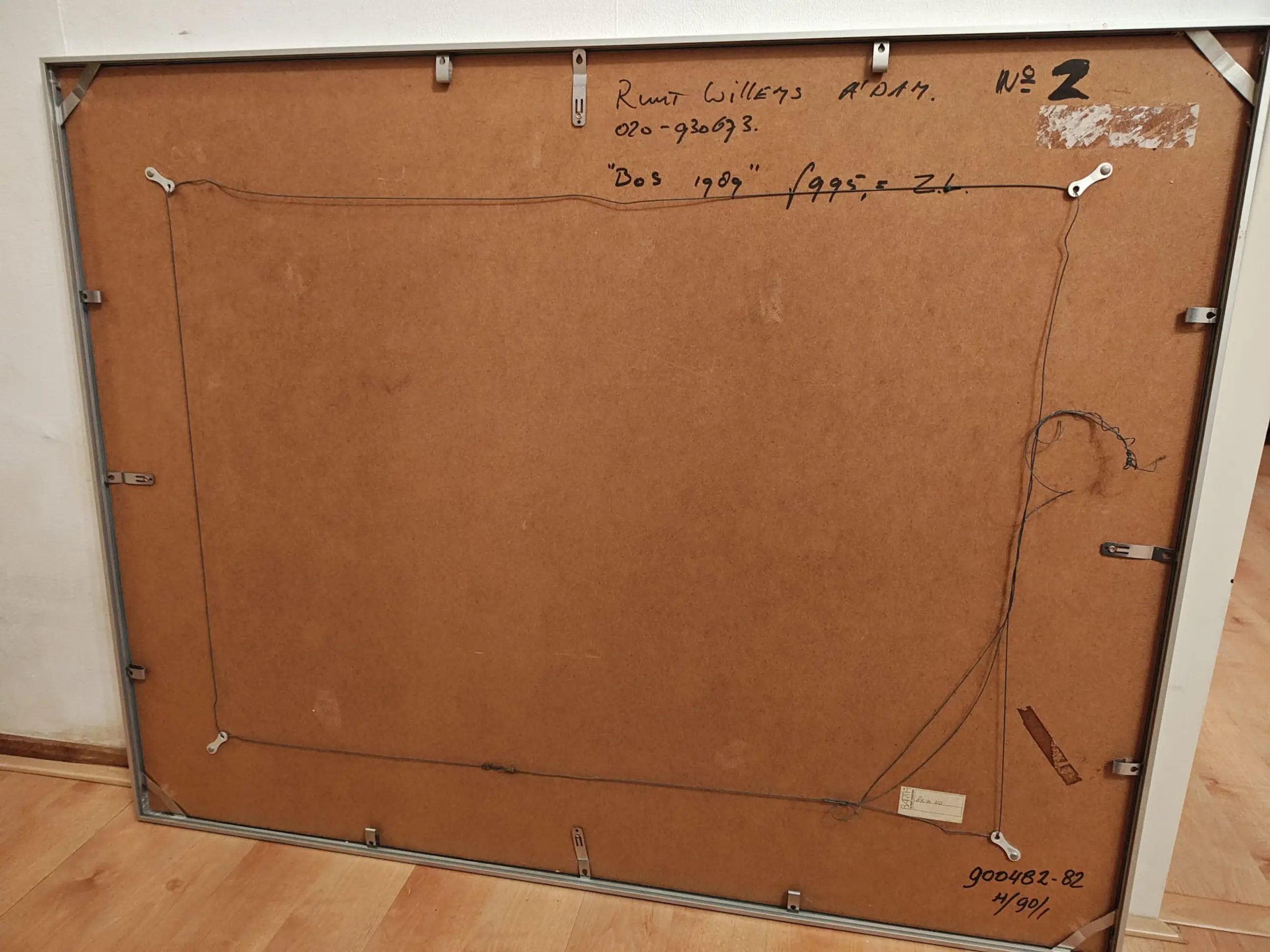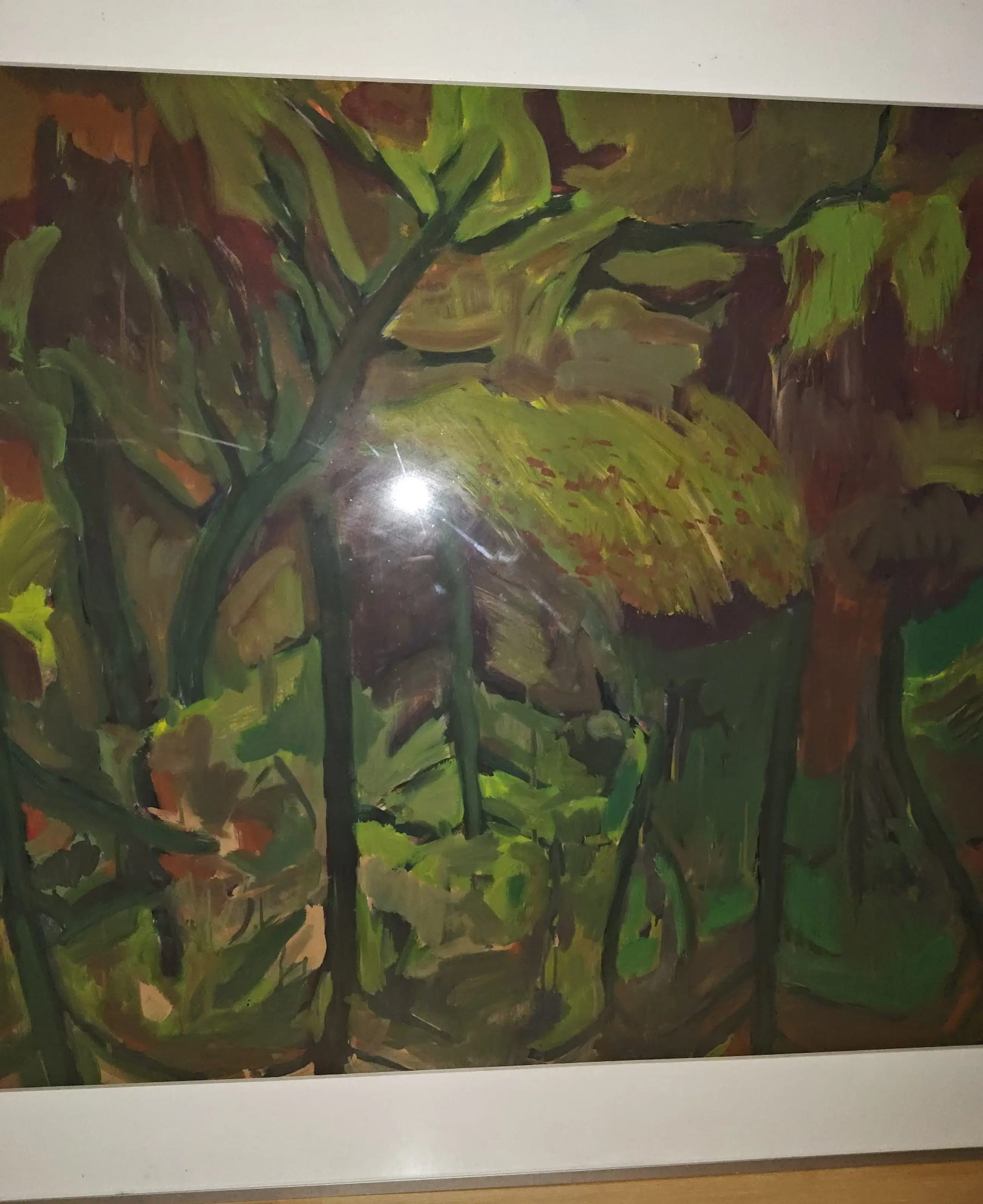 Schilderij van een donker bos met veel groen- en bruintinten. Ingelijst achter glas (en daardoor lastig te fotograferen).