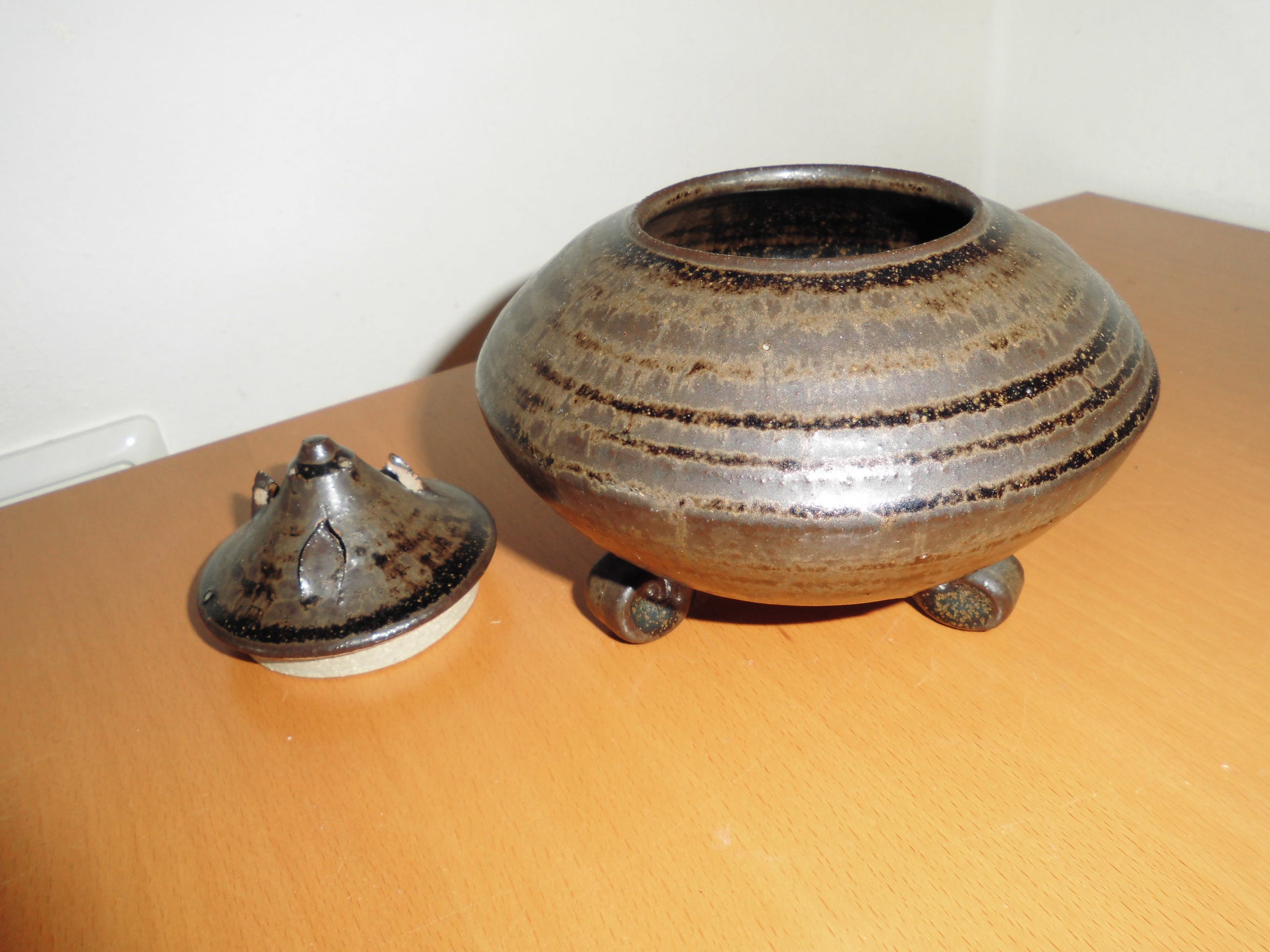 Keramiek/Steengoed Dekselvaasje = op 3 pootjes hoogte = 12 cm