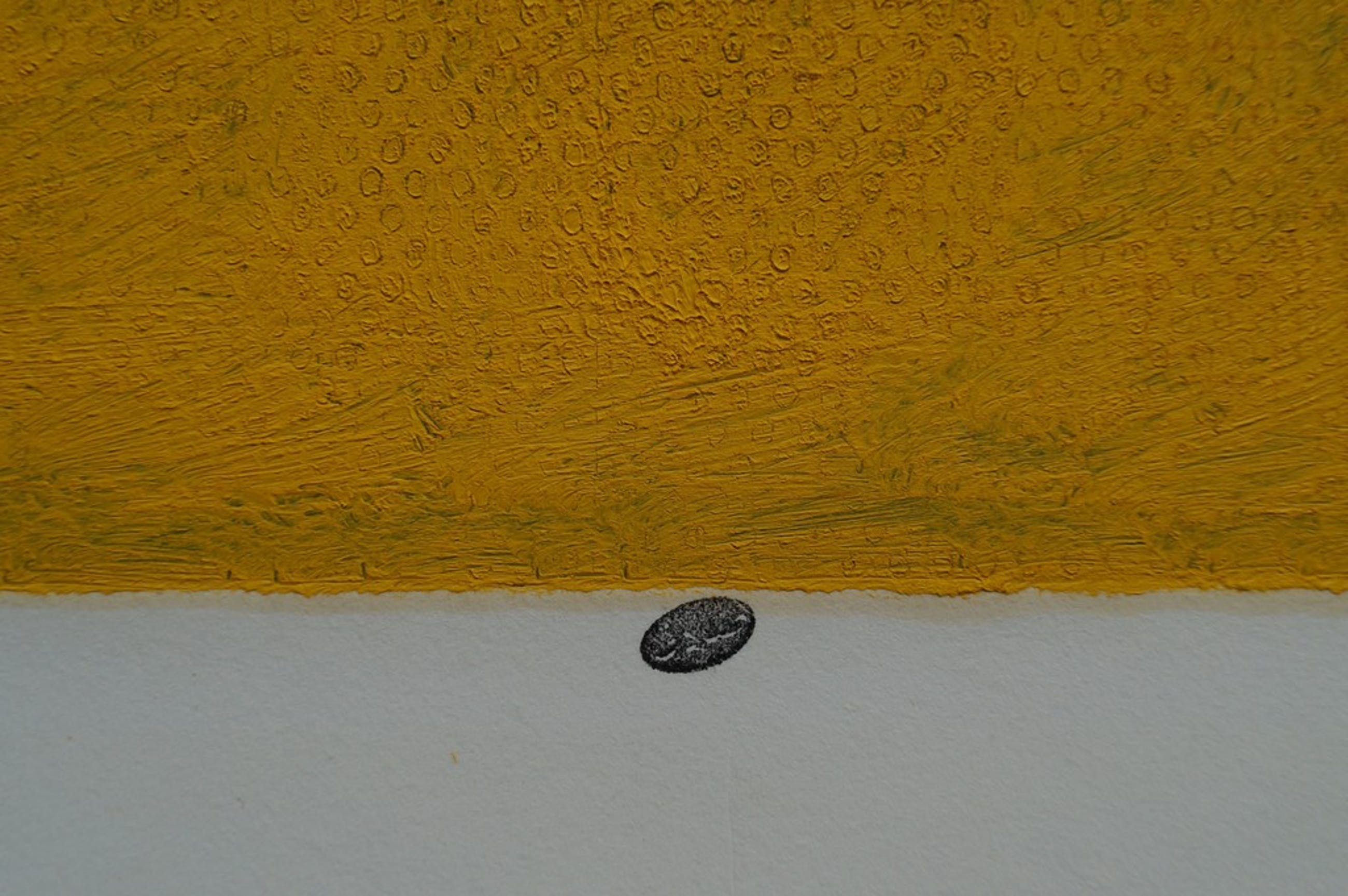 Het rode middengedeelte ligt verzonken, terwijl de verf op het gele vlak dik is aangezet.
