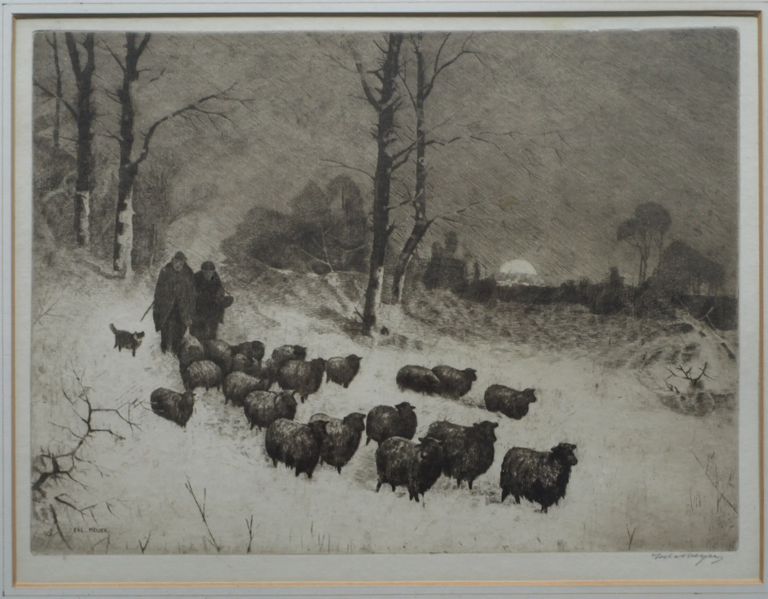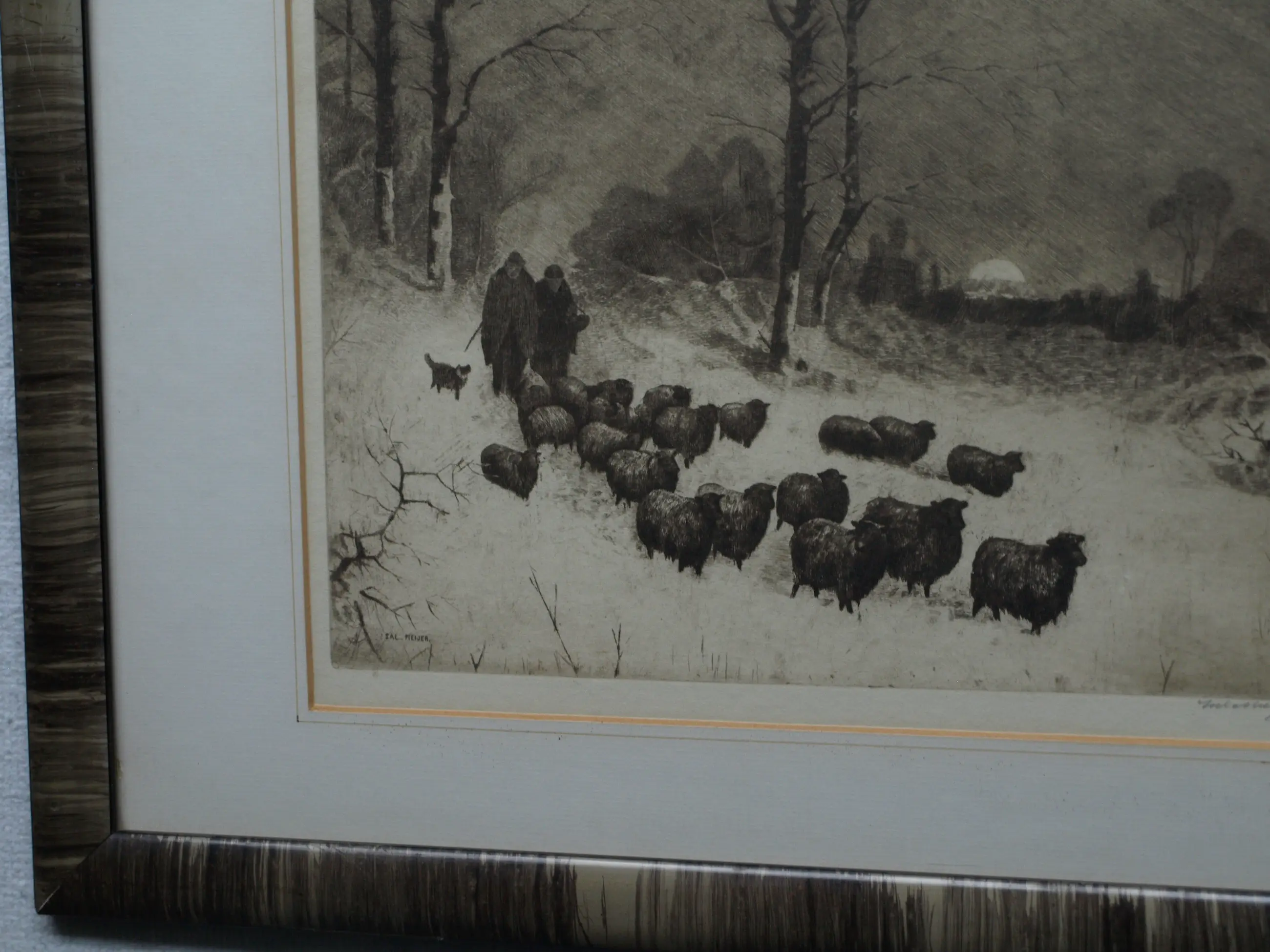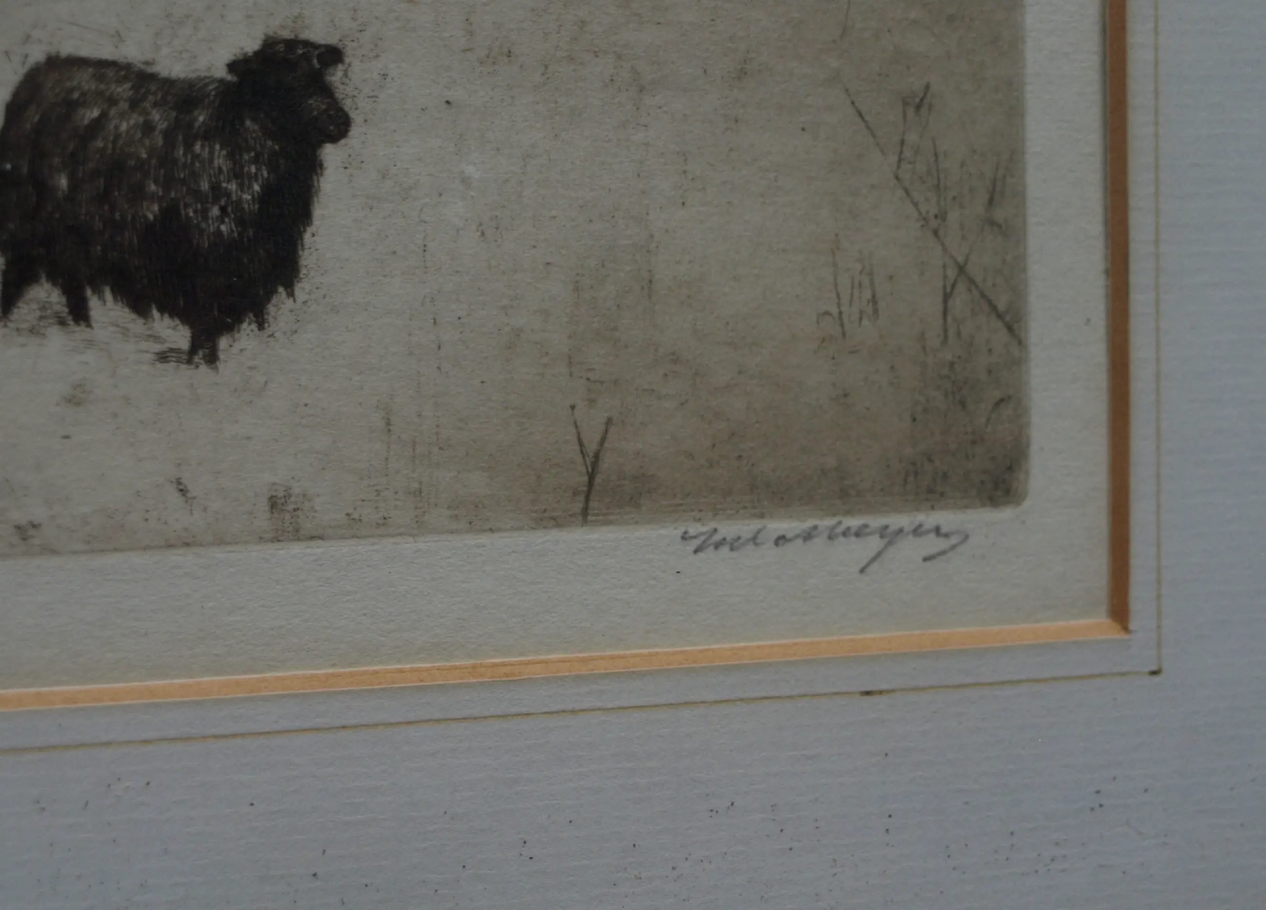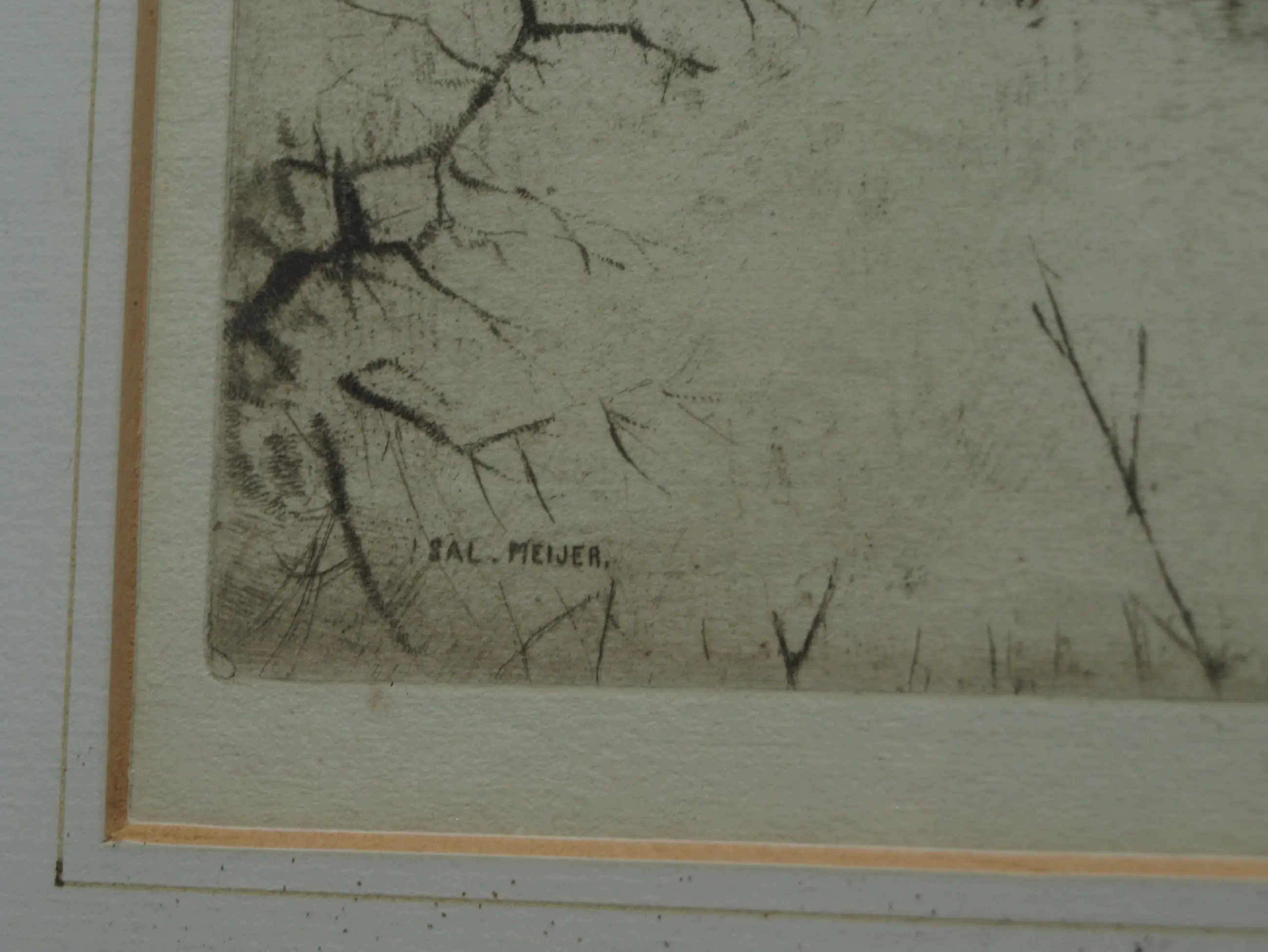 Een ingelijste ets van de Nederlandse kunstenaar Sal Meijer (1877-1965). -Handgesigneerd met potlood rechtsonder. Ook drukgesigneerd linksonder in de ets. -Ingelijst in een houten lijst met passe-partout en glasplaat. -Afmetingen: Lijst, 39 x 52,5 x 2 cm. Beeld / ets, 23 x 31 cm. -Herkomst: Uit een inboedel. -Conditie: De ets is in goede staat. Het papier van de ets en het passe-partout zijn licht ‘vergeeld'. De lijst heeft slijtplekjes. De kartonnen achterplaat heeft vlekken. Zie ook alle foto’s voor een eigen indruk. Kan zo aan de muur.