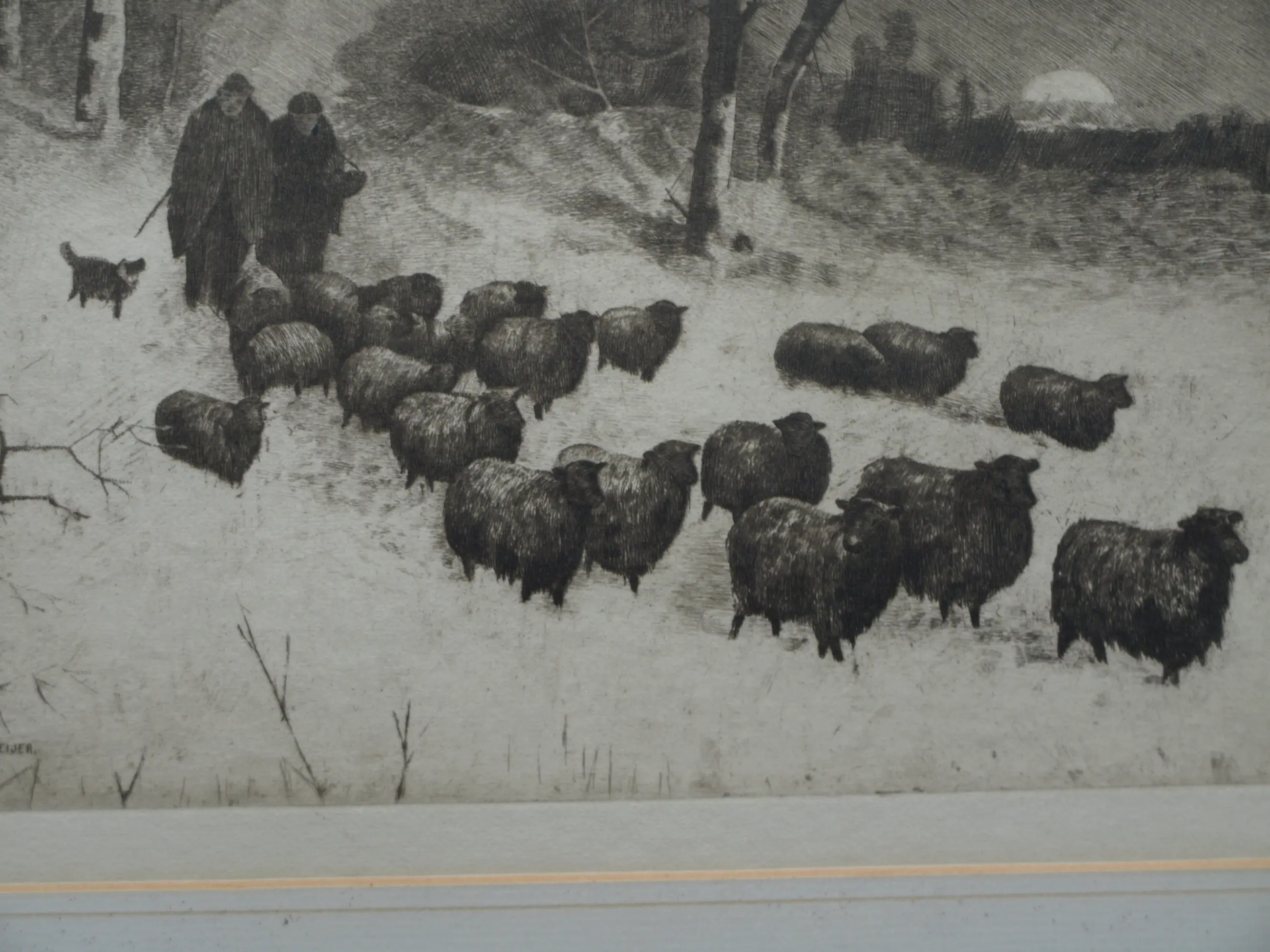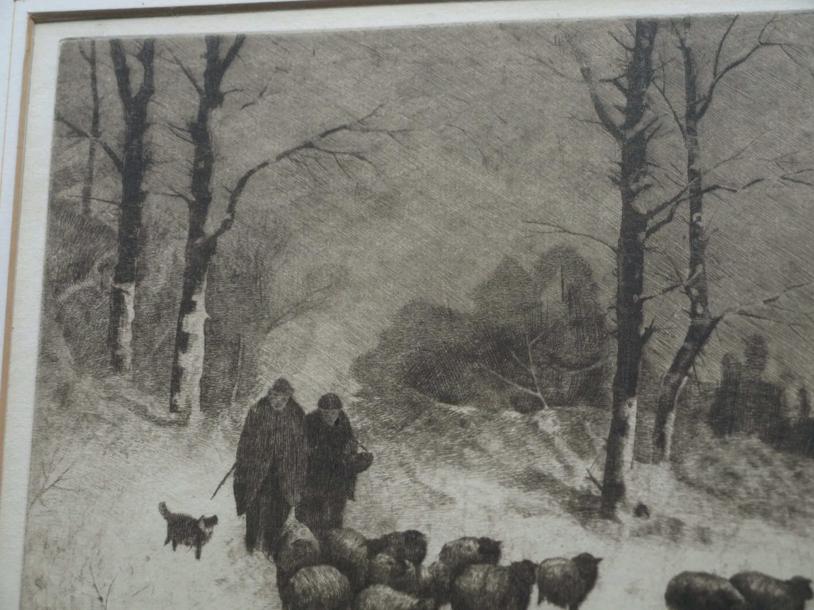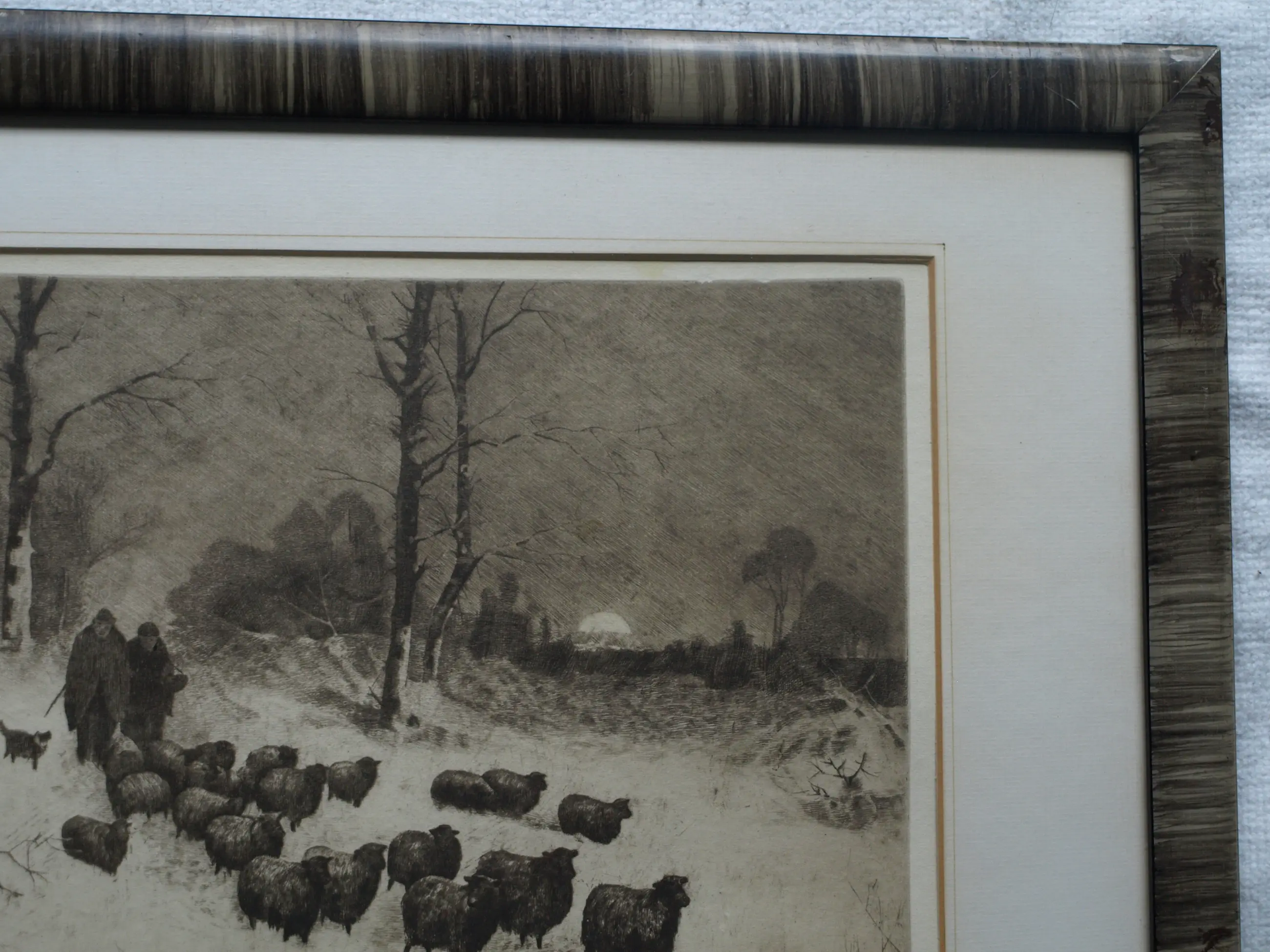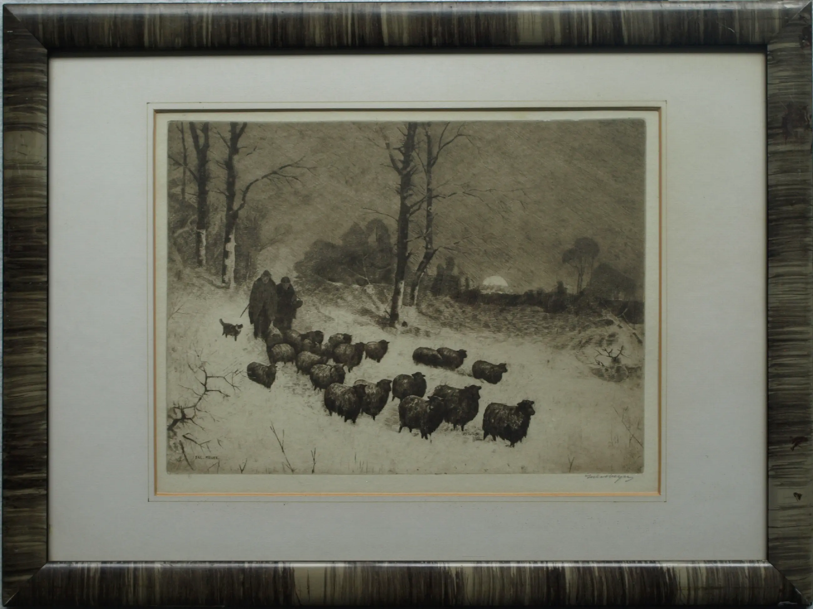 Een ingelijste ets van de Nederlandse kunstenaar Sal Meijer (1877-1965). -Handgesigneerd met potlood rechtsonder. Ook drukgesigneerd linksonder in de ets. -Ingelijst in een houten lijst met passe-partout en glasplaat. -Afmetingen: Lijst, 39 x 52,5 x 2 cm. Beeld / ets, 23 x 31 cm. -Herkomst: Uit een inboedel. -Conditie: De ets is in goede staat. Het papier van de ets en het passe-partout zijn licht ‘vergeeld'. De lijst heeft slijtplekjes. De kartonnen achterplaat heeft vlekken. Zie ook alle foto’s voor een eigen indruk. Kan zo aan de muur.