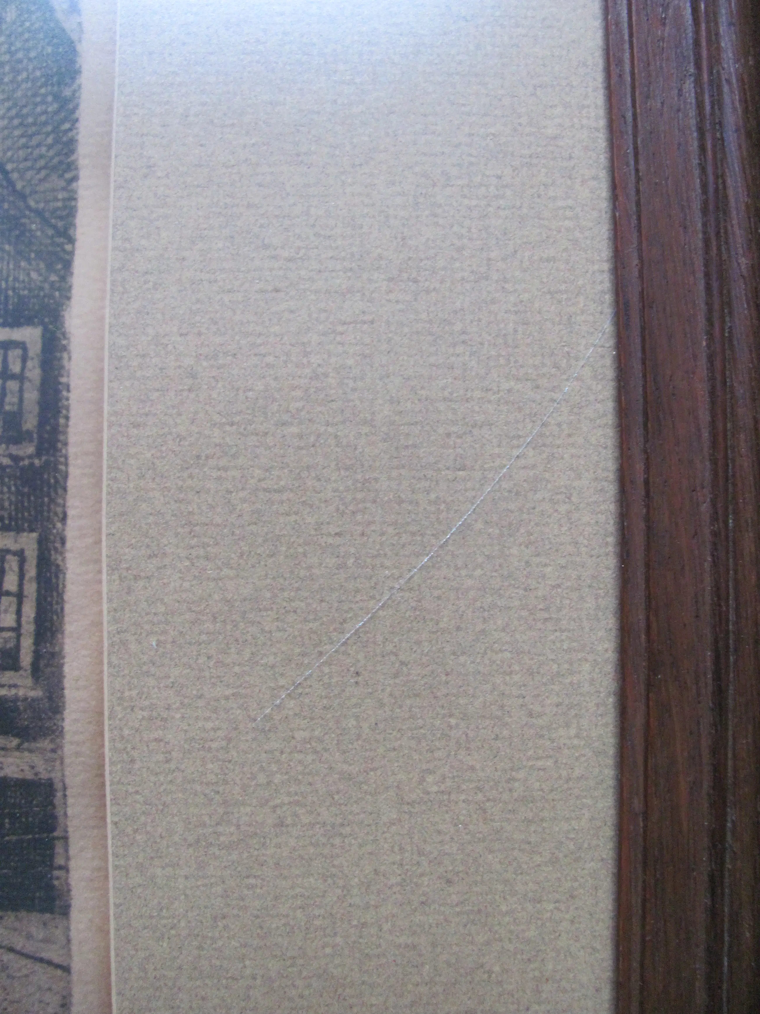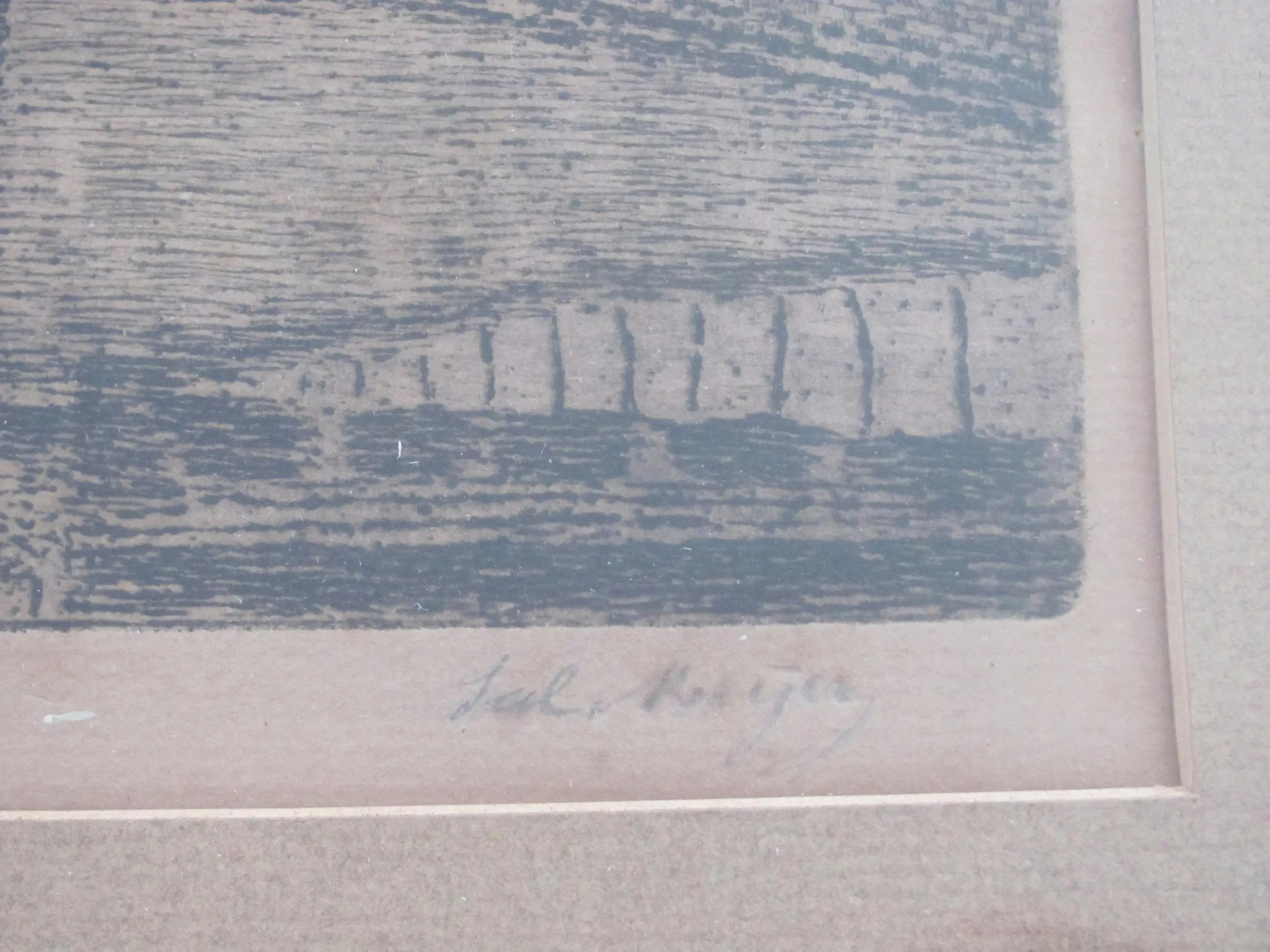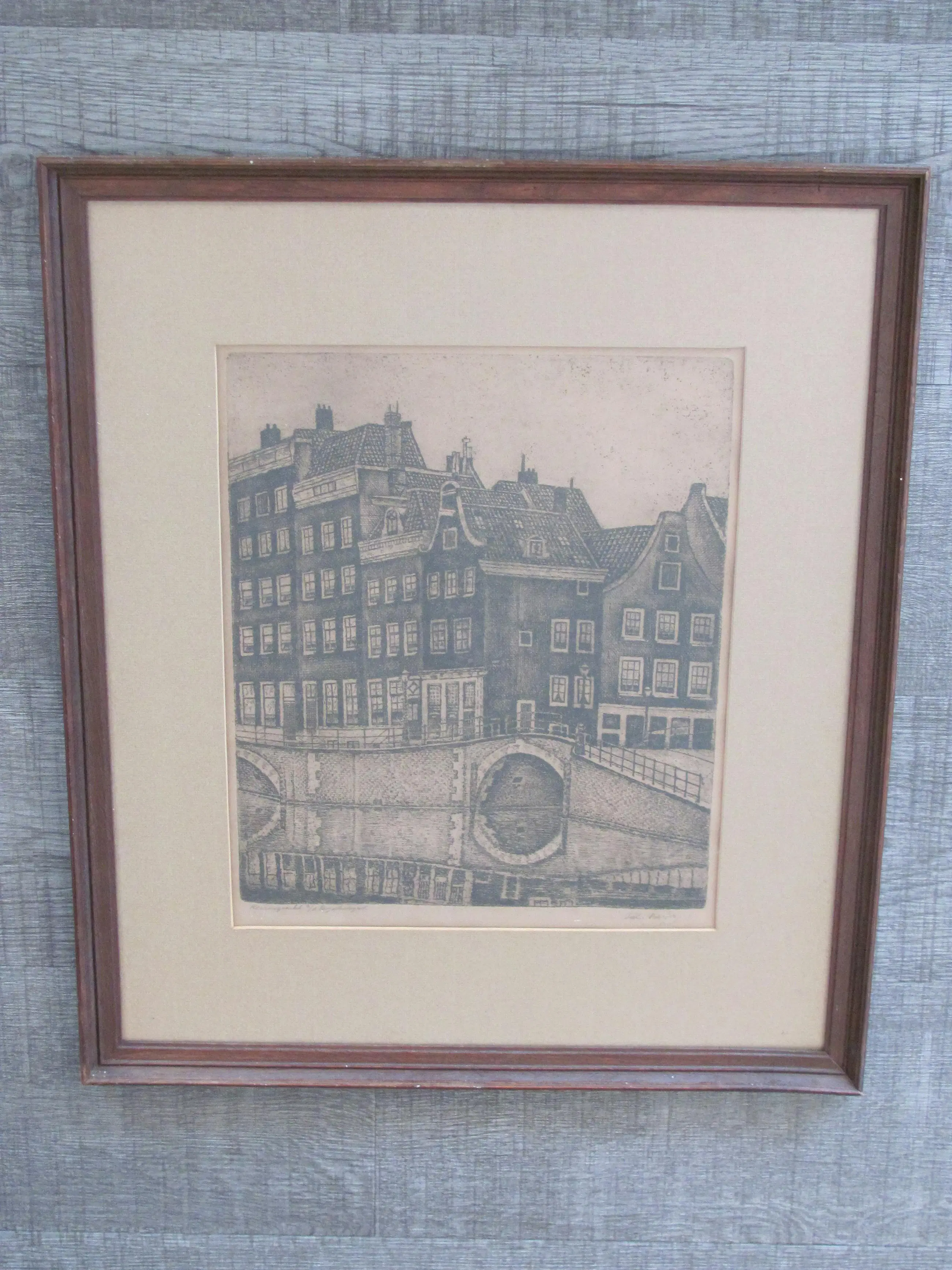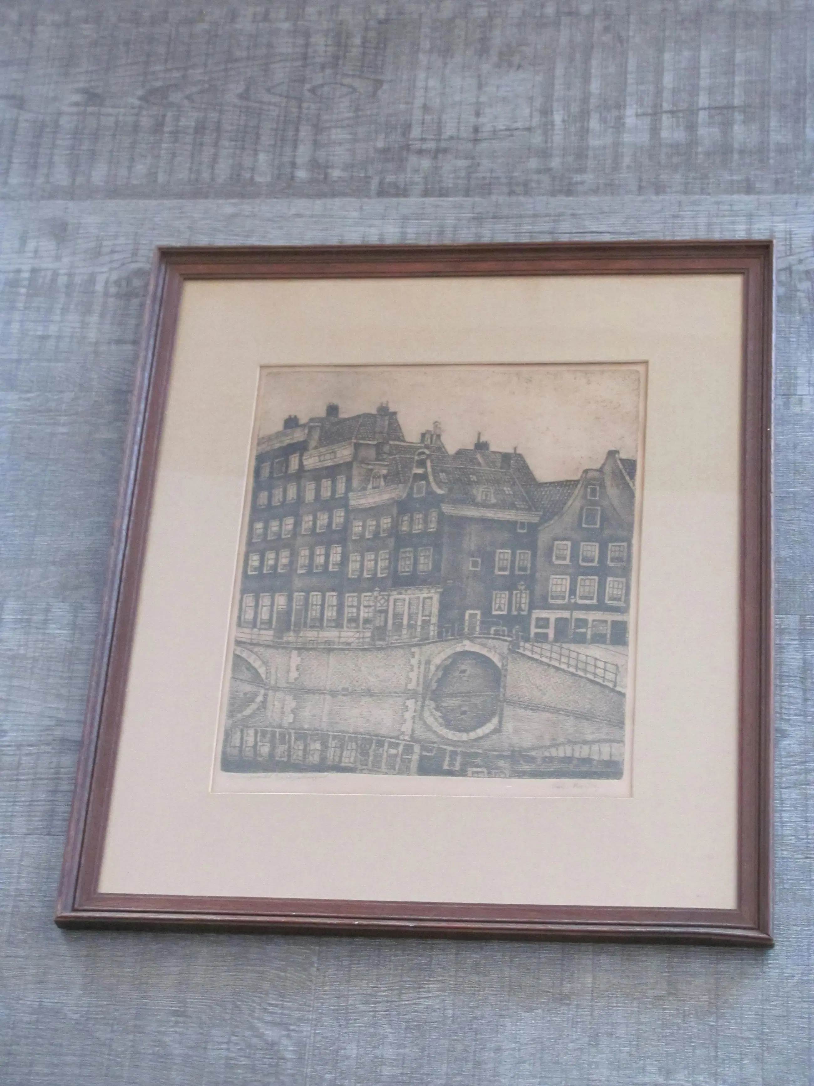 Grote ets van Sal. Meijer in de originele lijst en passe-partout. De ets heeft geen beschadigingen maar is in de loop der jaren wel licht gebruind geraakt. Op het glas ter hoogte van de passe-partout aan de rechterzijde loopt een lichte kras in het glas. (Niet ter hoogte van de ets zelf.) Dit is bijna niet zichtbaar en moeilijk te fotograferen, zie de laatste foto.