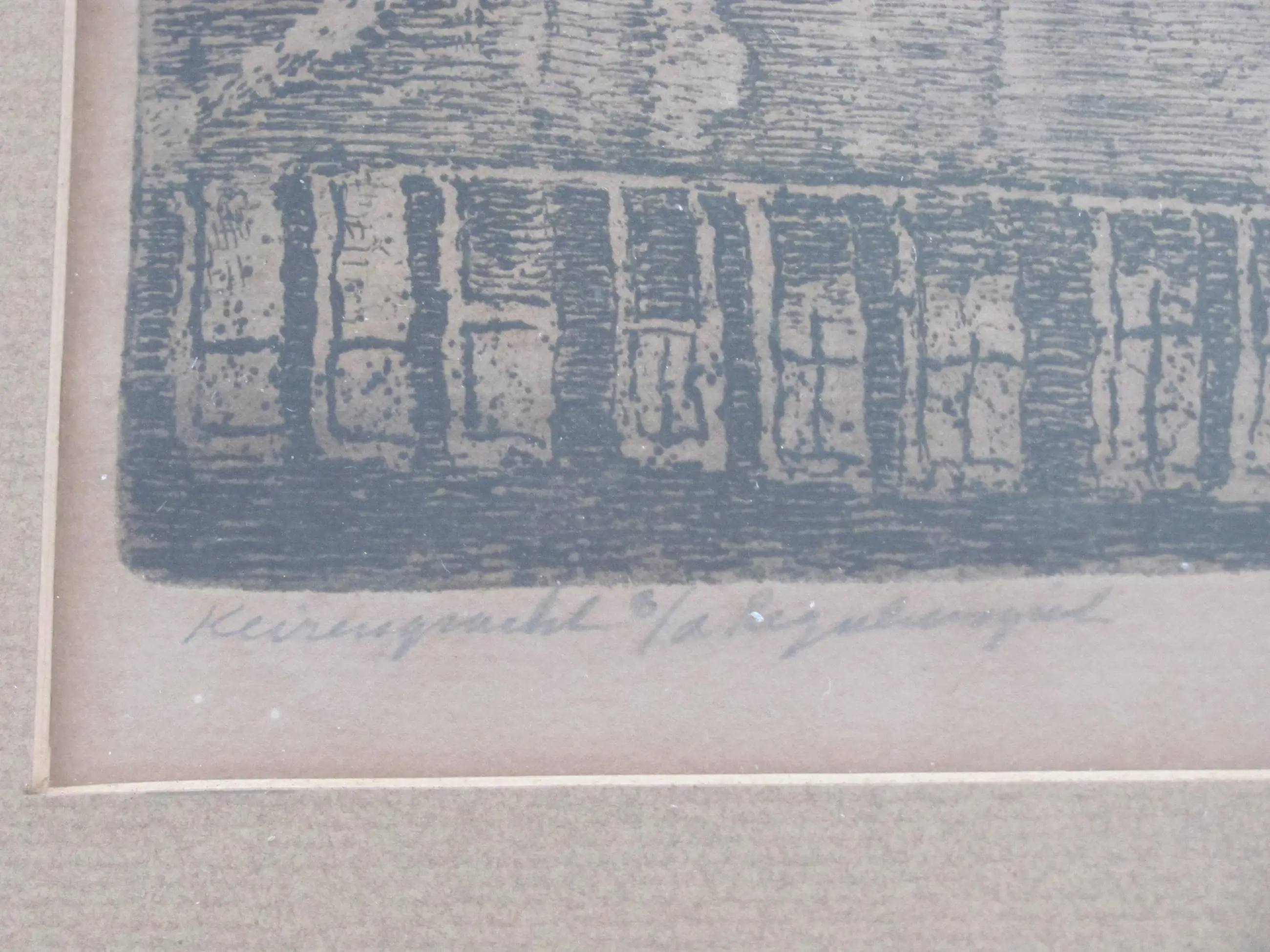 Ets van Sal (Salomon) Meijer (1877-1965). Afgebeeld is de hoek van de Keizersgracht met de Reguliersgracht te Amsterdam. Gesigneerd en getiteld in potlood.