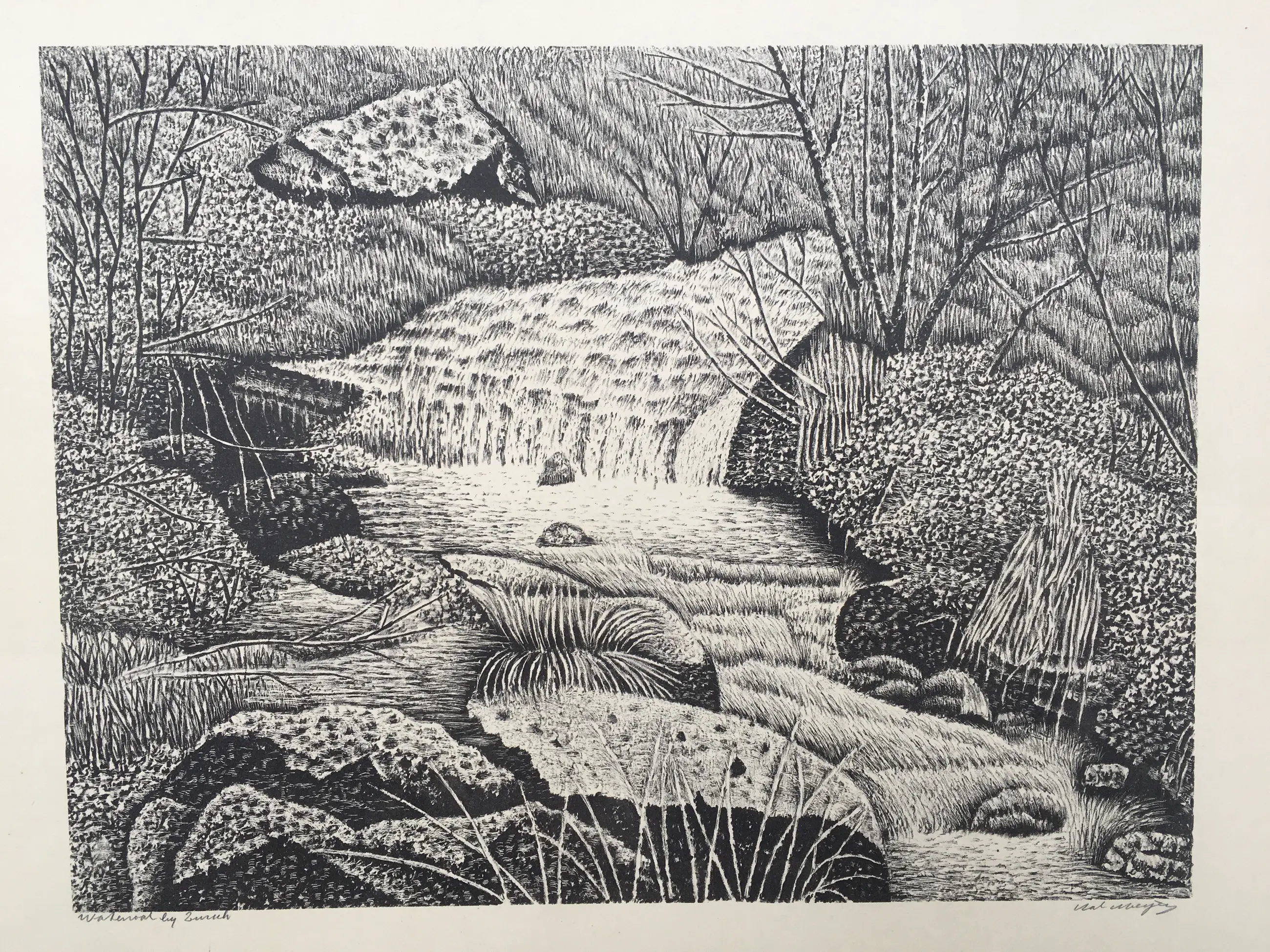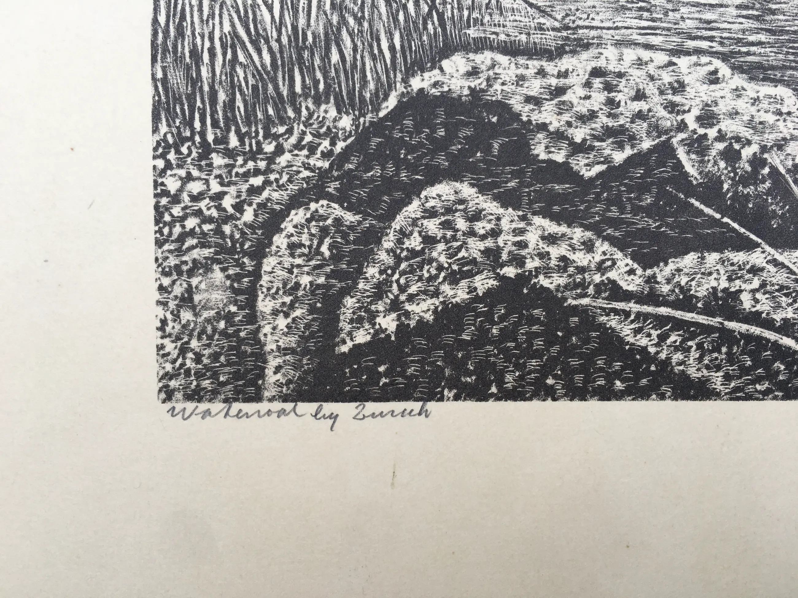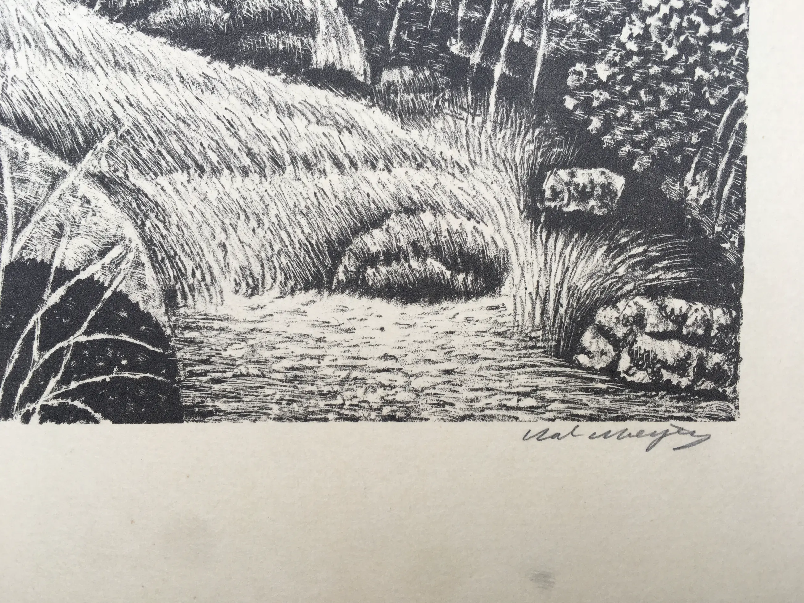 Litho "Waterval bij Zurich". Rechtsonder in potlood gesigneerd "Sal Meijer" Linksonder in potlood "Waterval bij Zurich".