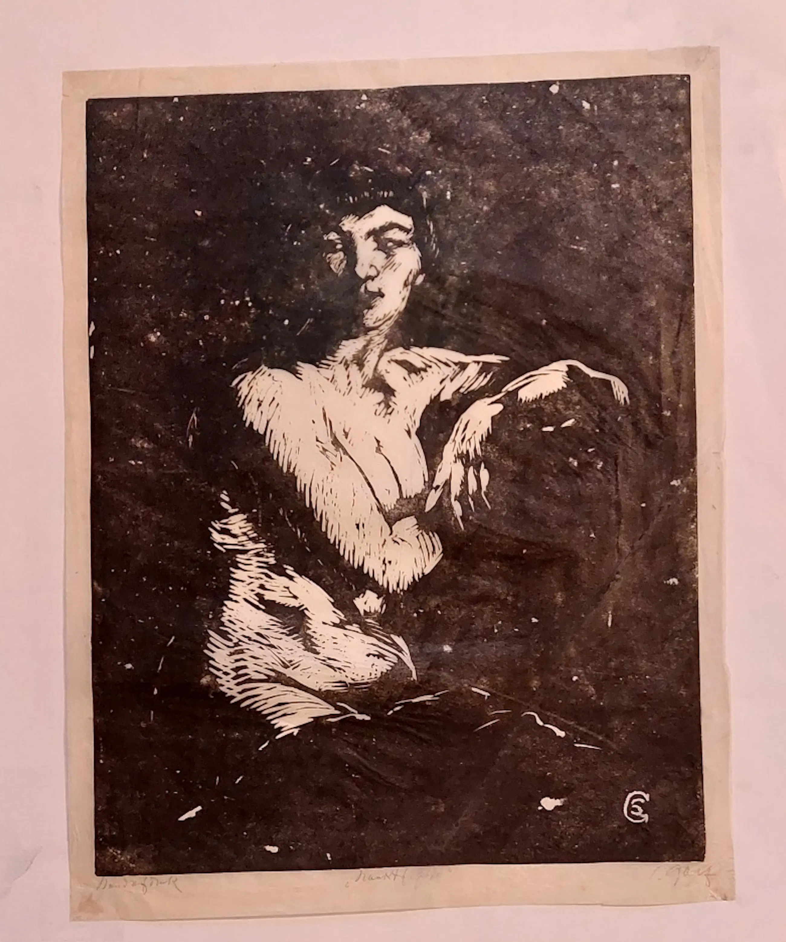 Mooie hout of linosnede, zittend naakt in potlood gesigneerd en nogmaals in de snede zijn monogram. Links onder in potlood: 'Handafdruk'.