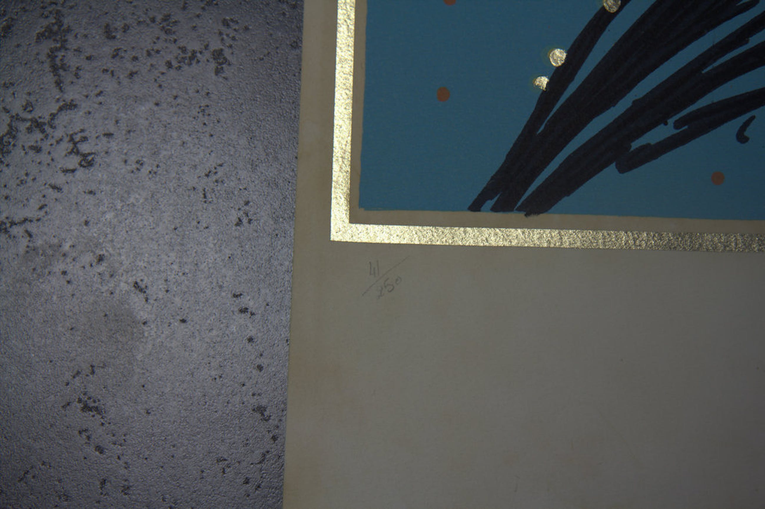 Het "Arches" papier waarop het werk is gedrukt meet 65 x 48 cm. De litho in blauw met zwart is versierd met bladgoud: gouden glimmende stippels en een gouden rand.