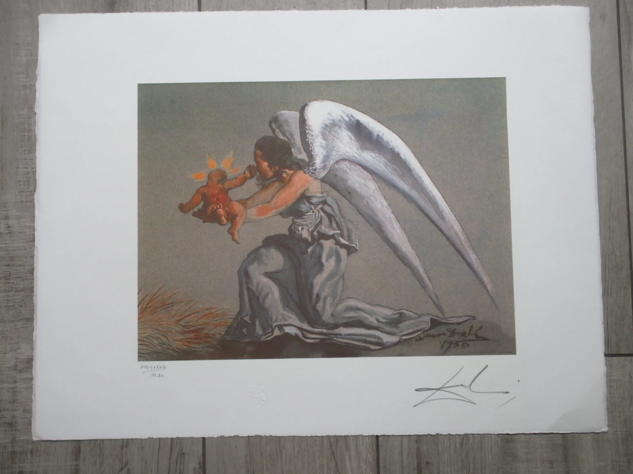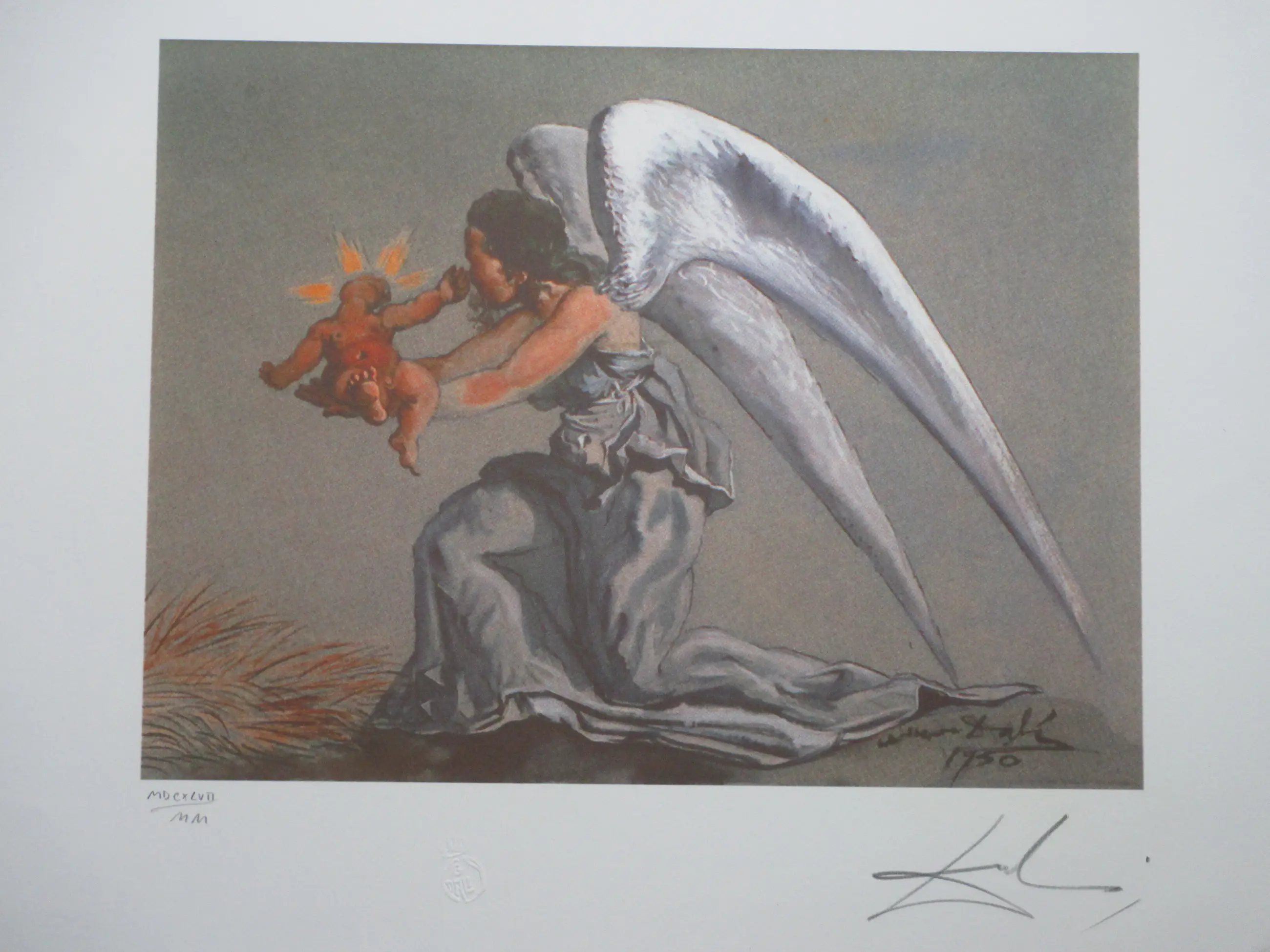 Zeefdruk door Salvador Dali Voorstelling van een gevleugelde engel met het Christuskind in haar handen Losbladig, beeldmaat 33x44, bladmaat 50x65 Gesigneerd in potlood r.o.: 'Dali' Tevens gesigneerd en gedateerd in de druk r.o.: '1950' Romeins genummerd l.o. in potlood: 'MDCXLVII / MM' = 1647 /2000 Ter authenticiteit blinddruk (Gal/Dali) m.o. in het blad