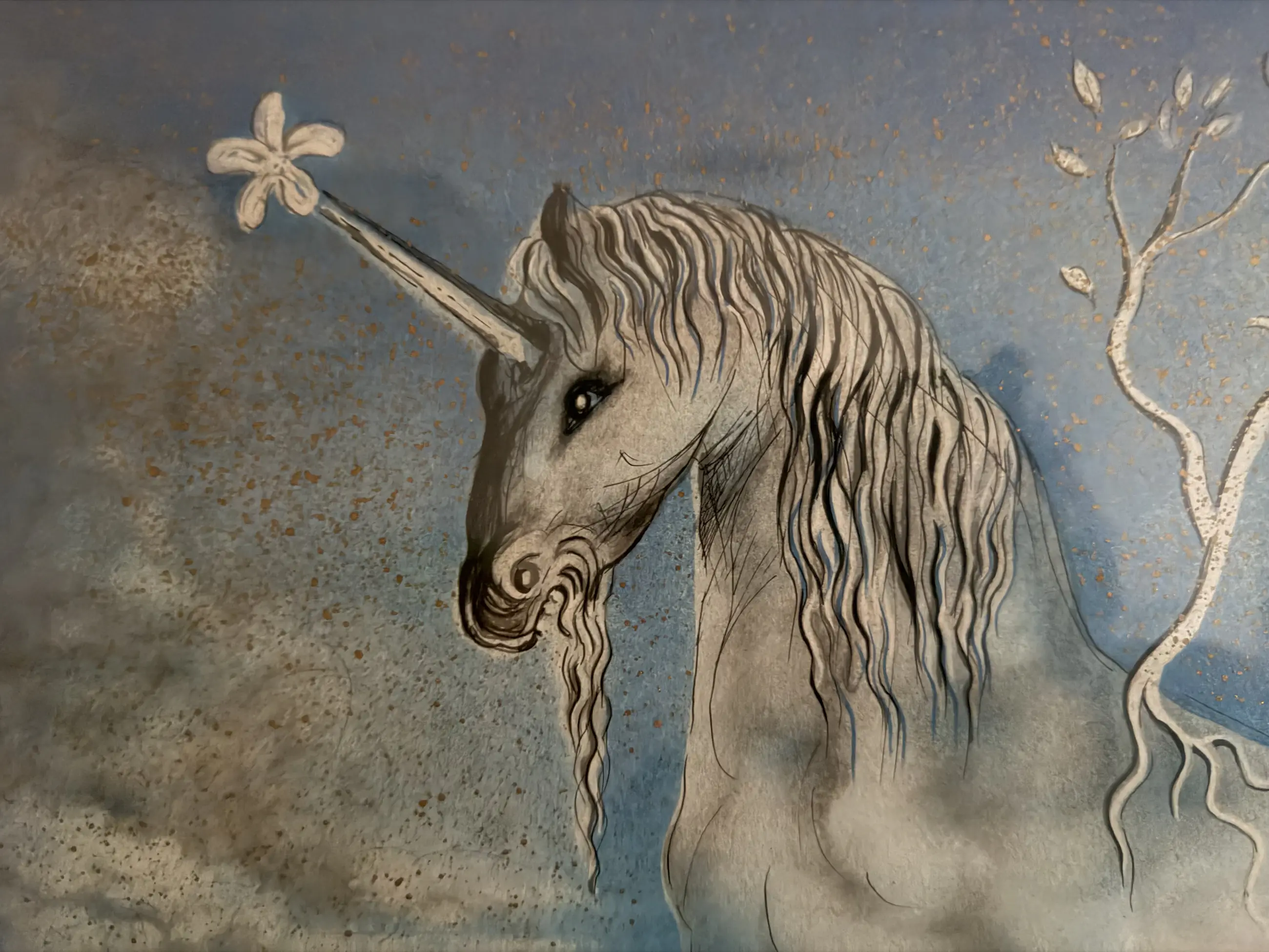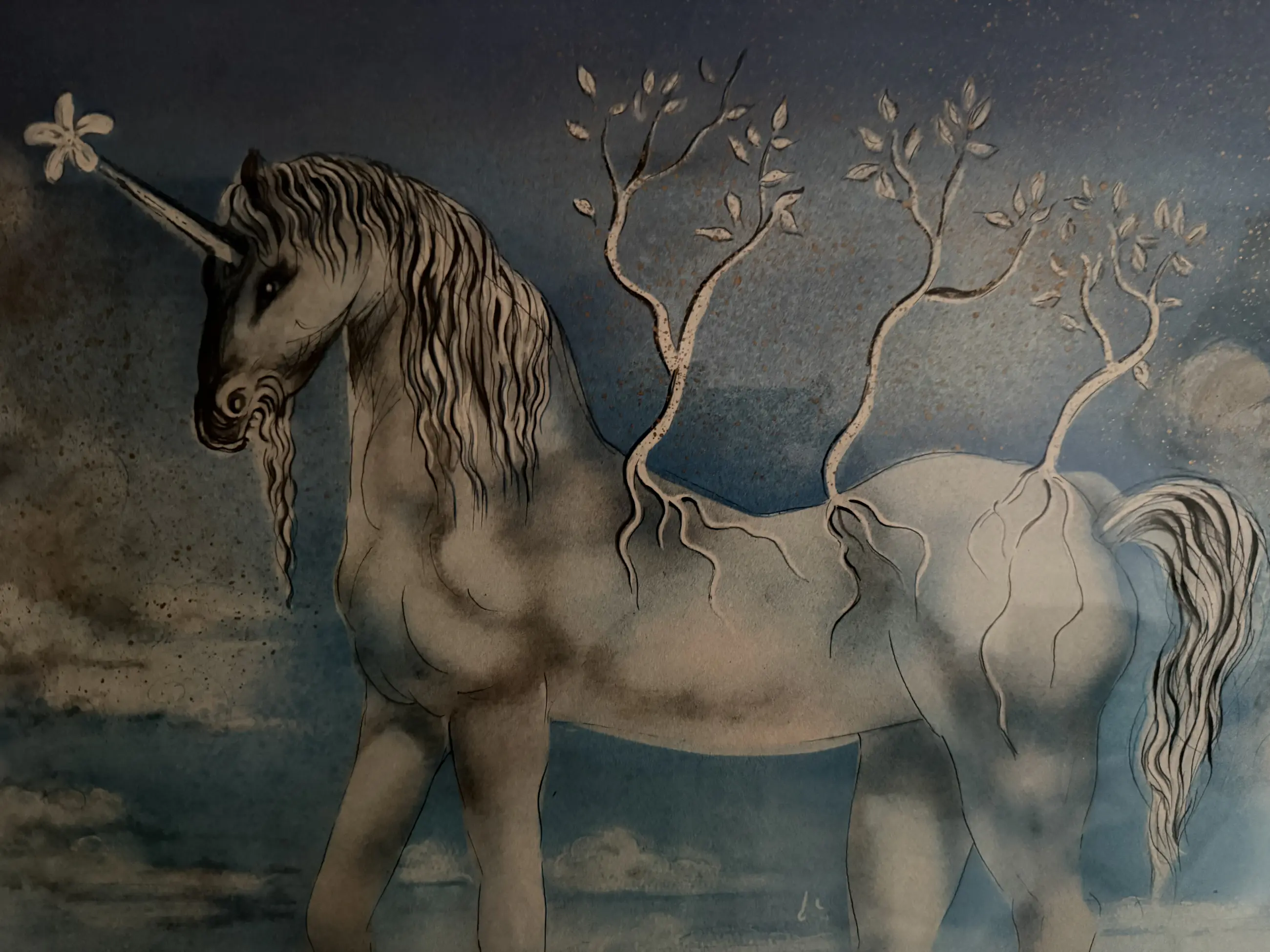 De afbeelding toont een ingelijste litho van "The Unicorn" (La Licorne) door Salvador Dalí.