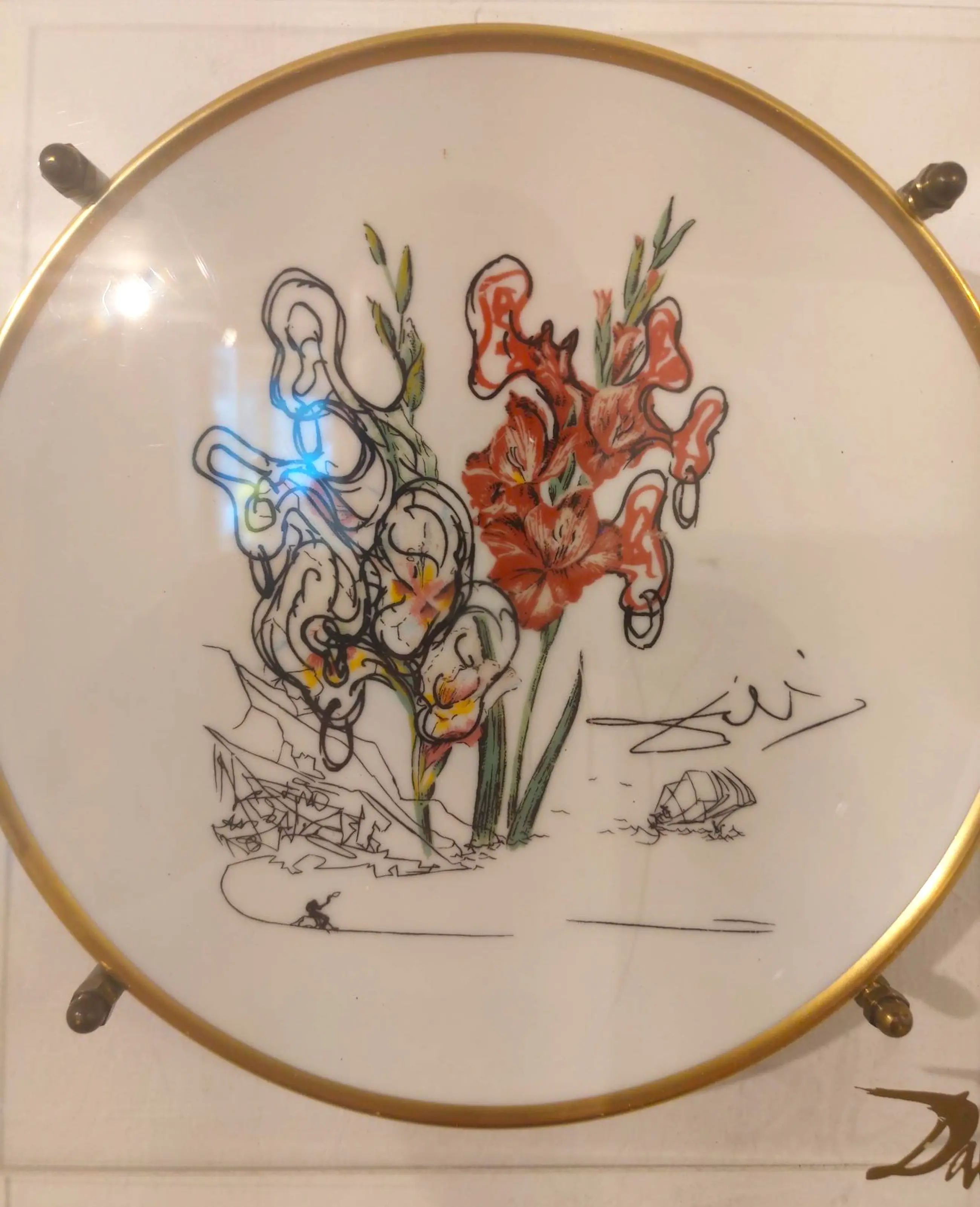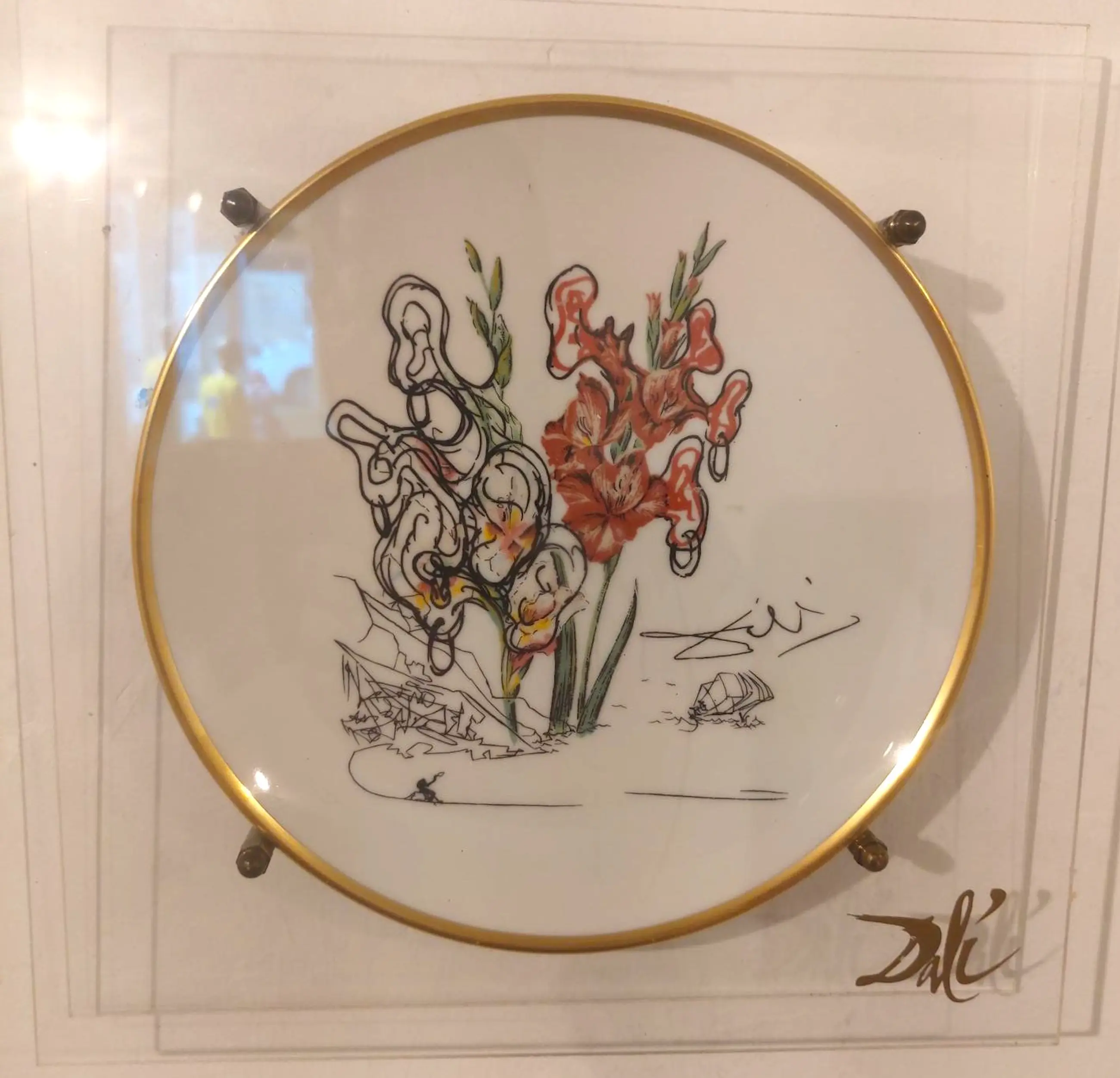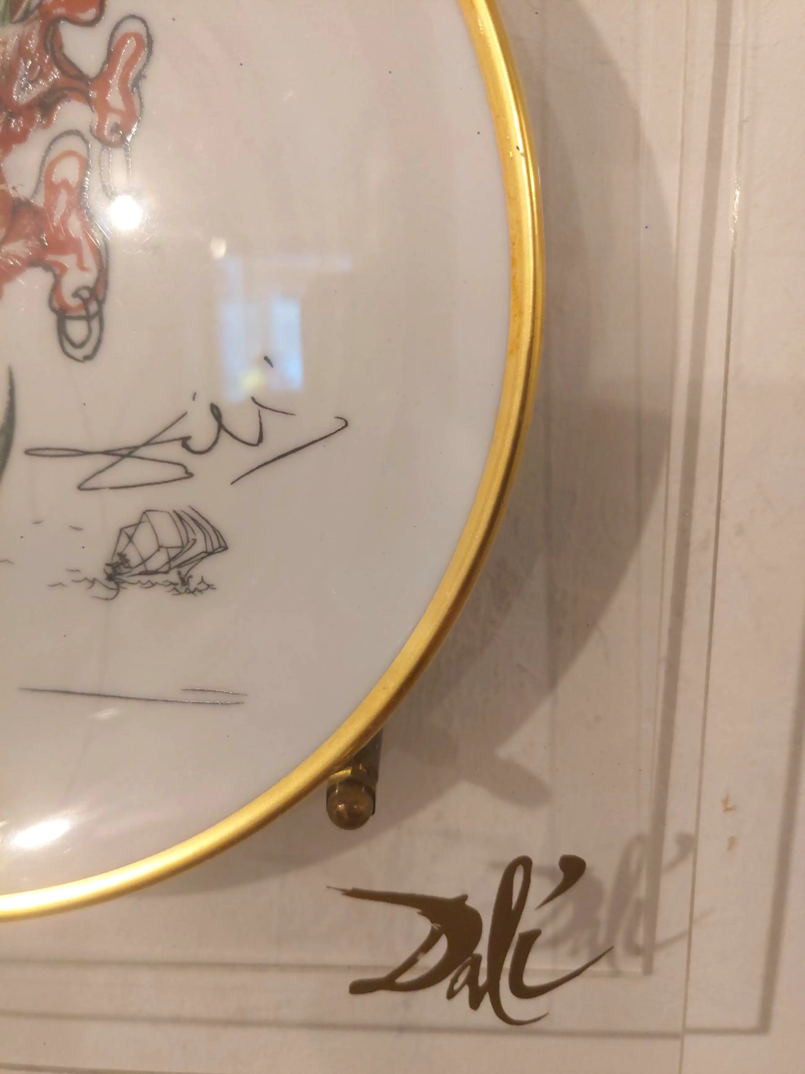 Prachtig keramisch bord van Dali, zowel in het werk drukgeigneerd als op de achterzijde van het bord. In de perplex lijst staat nogmaals een drukgesigneerde handtekening van Dali.
