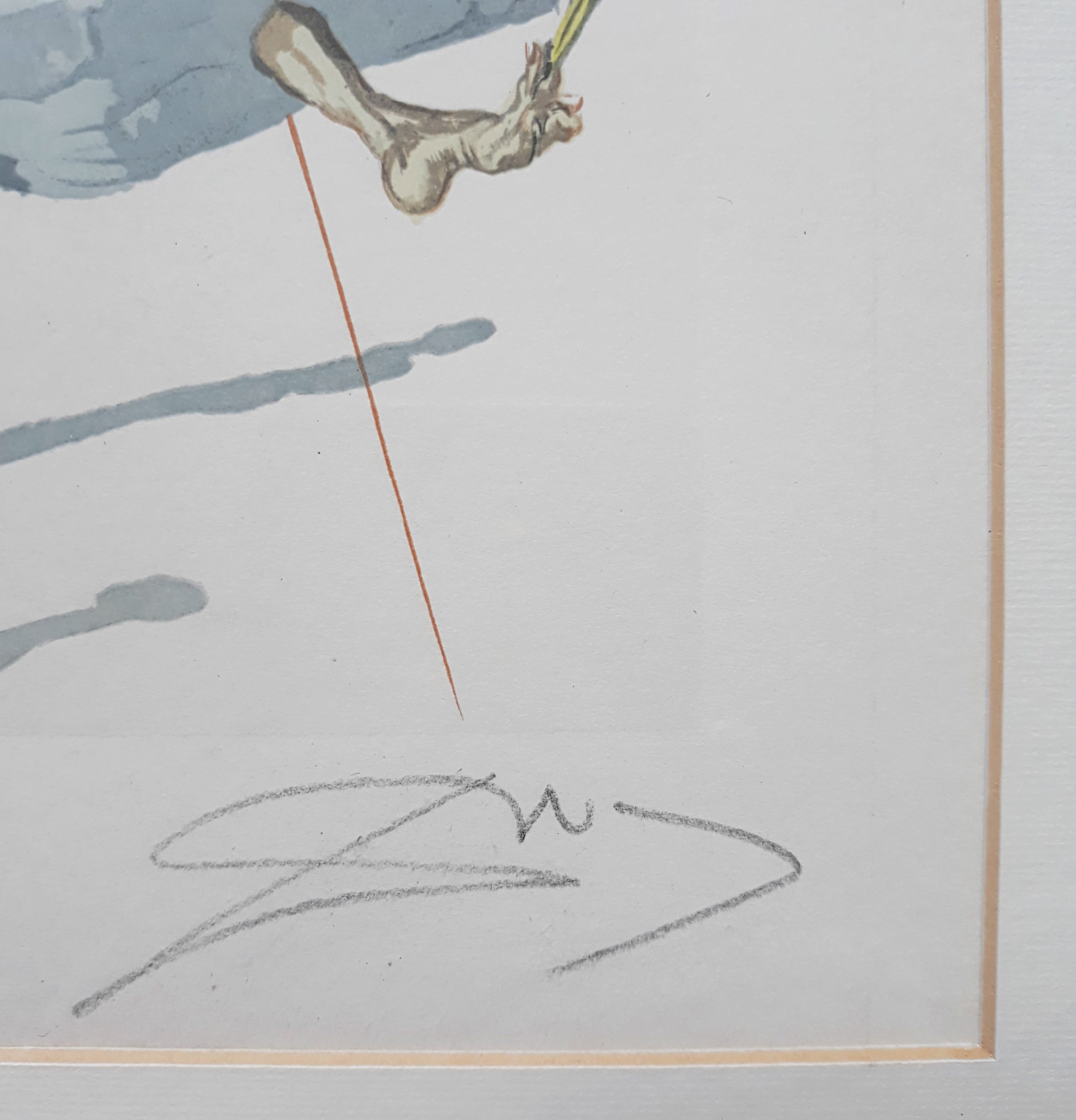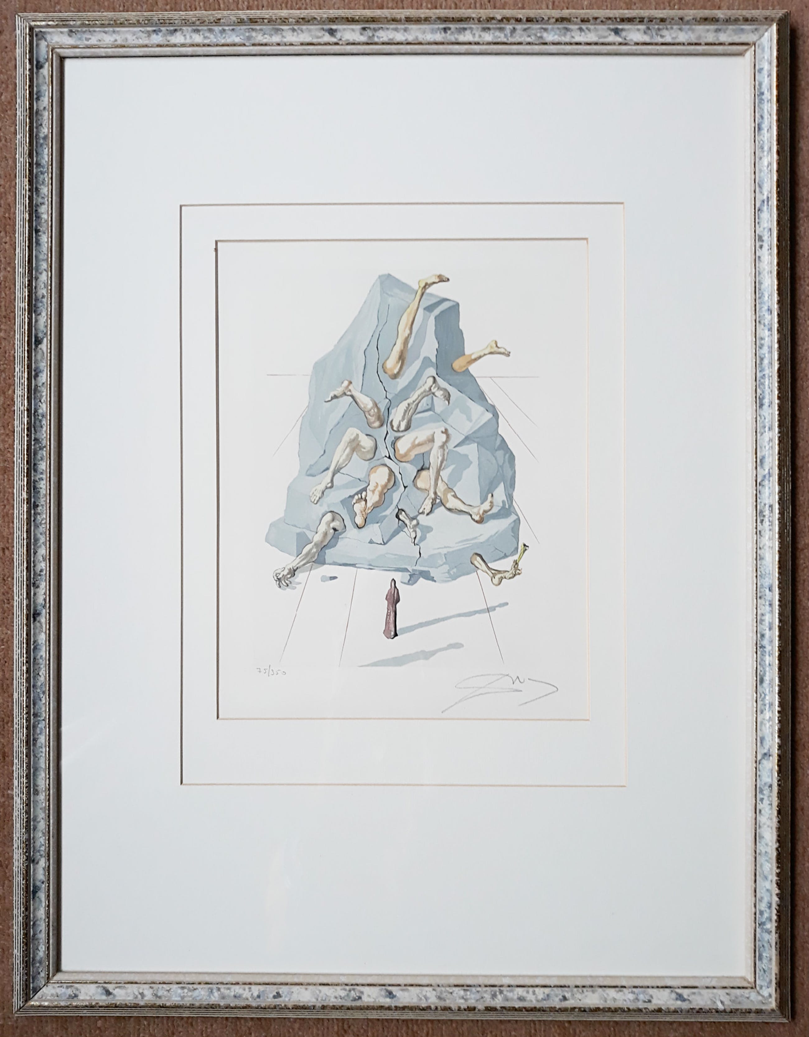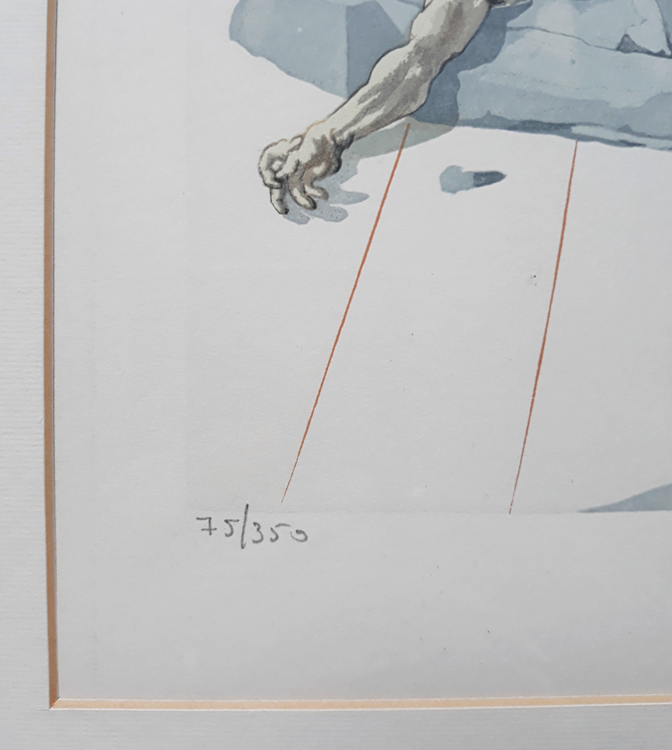 Bekende voorstelling van Salvador Dali uit de Divine Comedie. Litho of houtdruk op papier, met potlood gesigneerd en genummerd (75/350). In mooie lijst, achter glas en met dubbel passe-partout. Alles in goede conditie, met betrekking tot de signatuur kan ik geen garantie afgeven (wie wel als het om Dali gaat?).