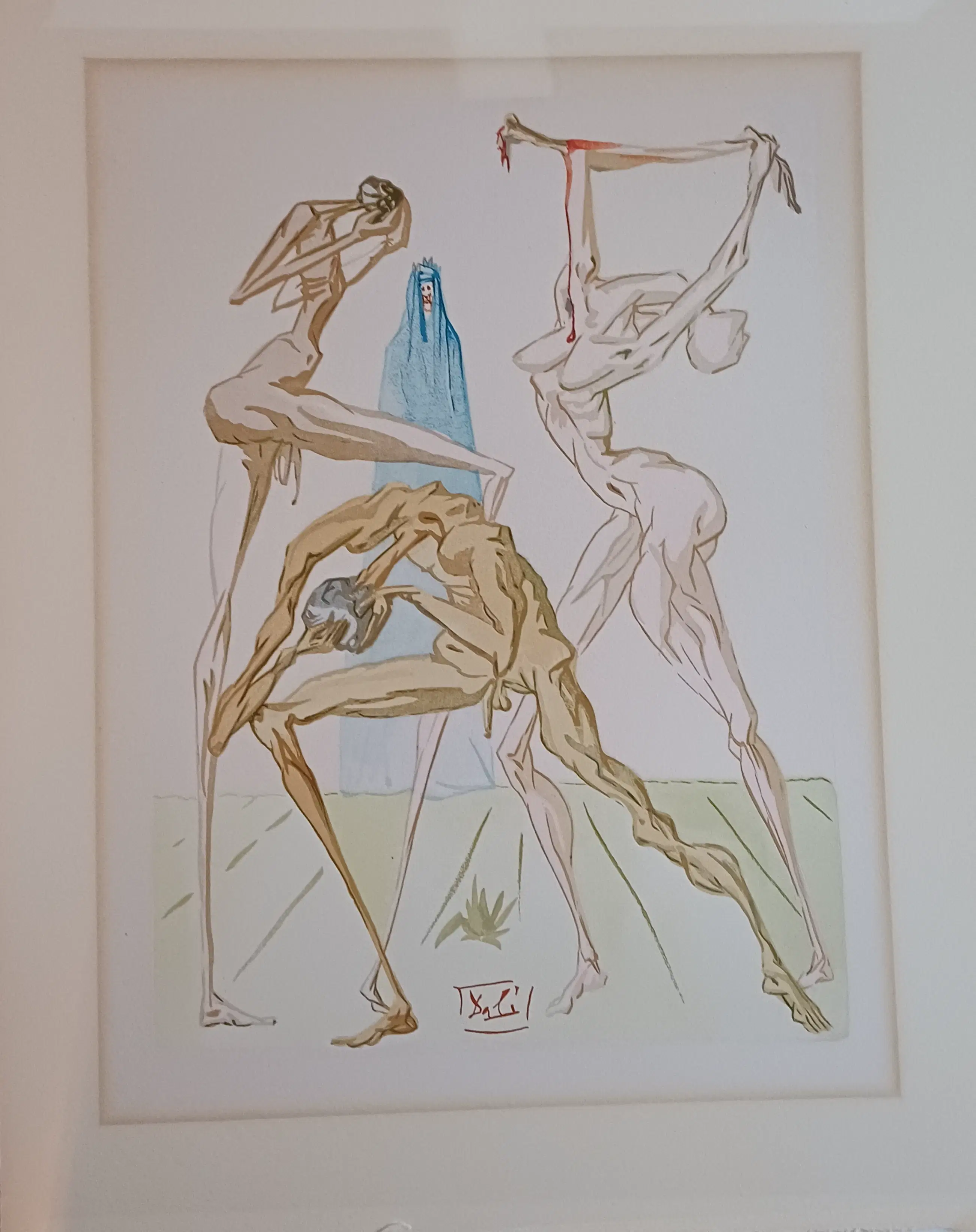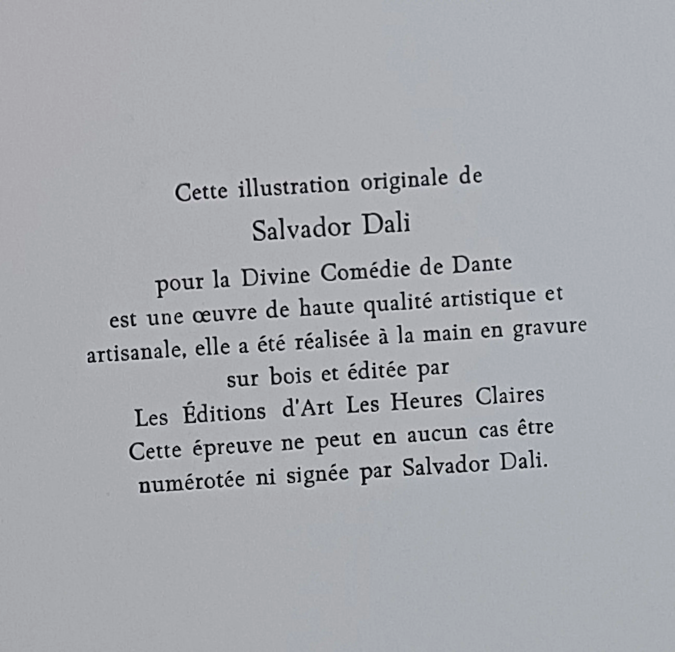 Deze originele illustratie van Salvador Dali voor La Divine Comedie de Dante is een werk van grote artistieke en anisanale kwaliteit, het werd met de hand geproduceerd in houtgravure en uitgegeven door Les Editions d`Art Les Heures Claires. Dit bewijs kan in geen geval door SD worden genummerd of ondertekend (vertaling van de Franse tekst aan de achterzijde)