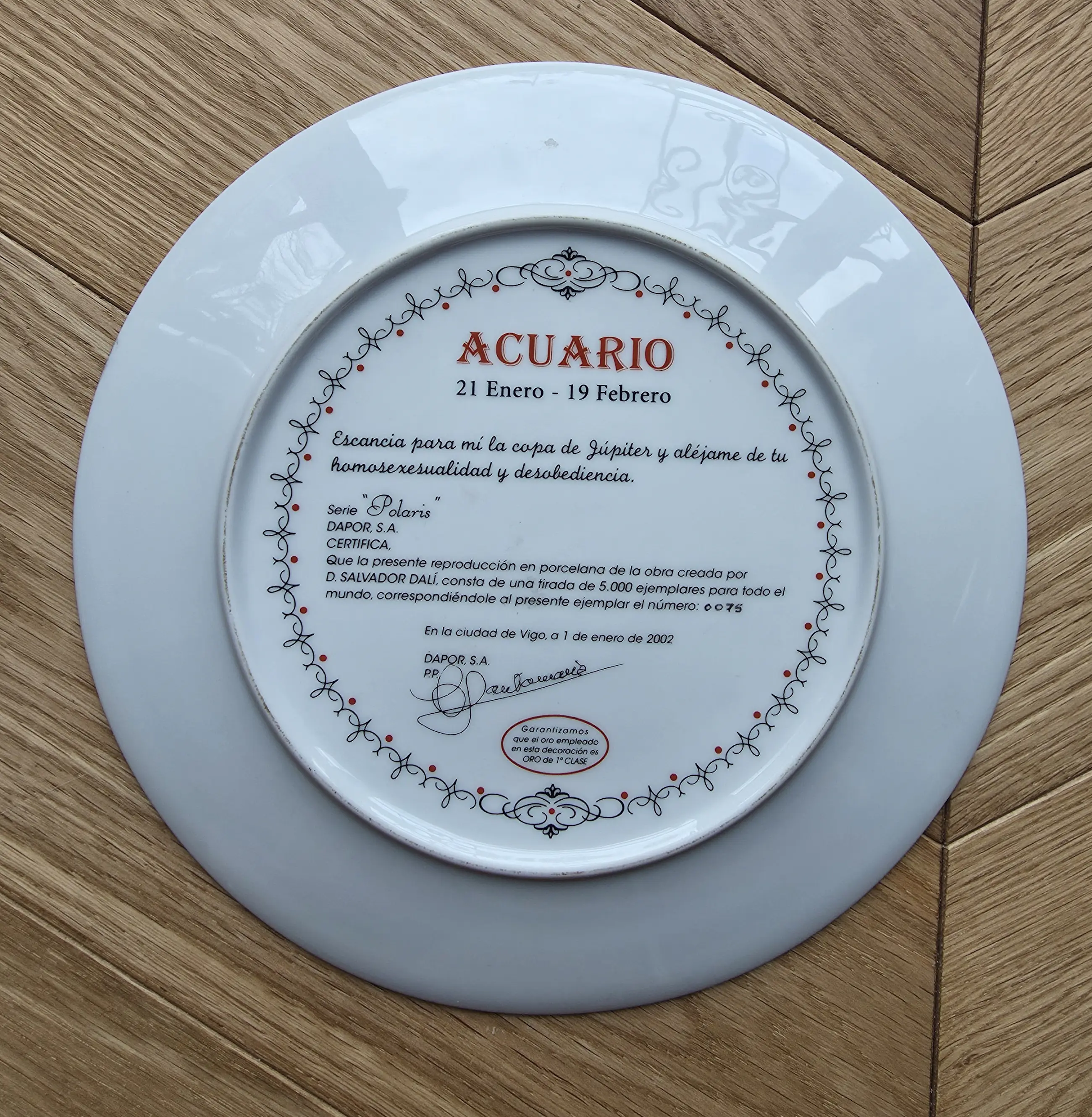 Porseleinen bord van Salvador Dali voor "Dapor" . Op het bord met een diameter van 21 cm staat sterrenbeeld "Acuario (Waterman) " uit 2002 afgebeeld. Nummer 75/5000 Het bordje is in de originele verpakking. Wordt aangetekend verstuurd of kan opgehaald worden.