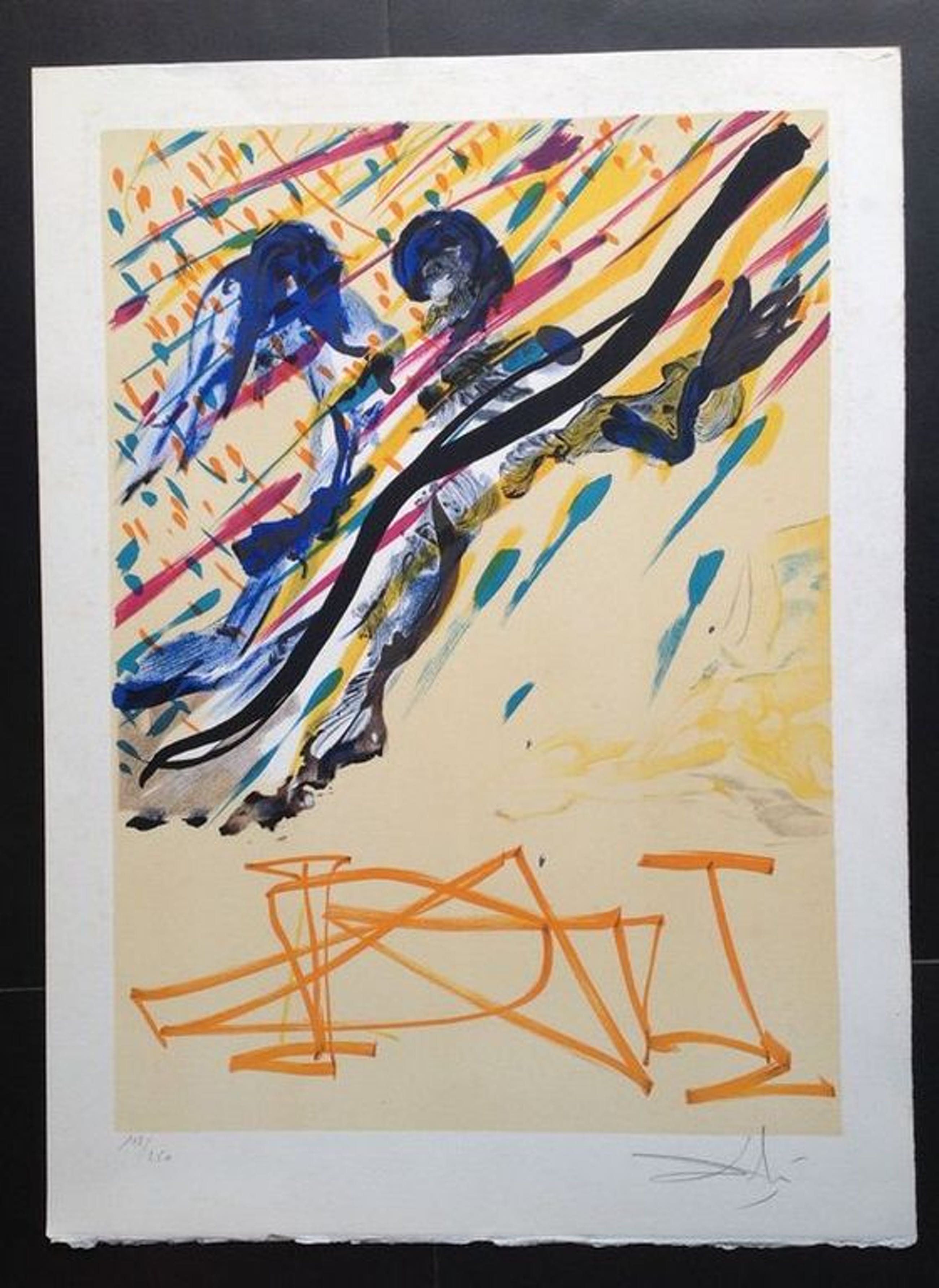 Uit de serie Les Vitraux, originele litho L’arcangelo. De reeks is ook gekend als 'the divine word' of 'La jungle humaine". Dali maakte deze reeks voor de glasramen in zijn museum te Figueras, deze zijn nog altijd een mooie 'eye-catcher' in het museum.