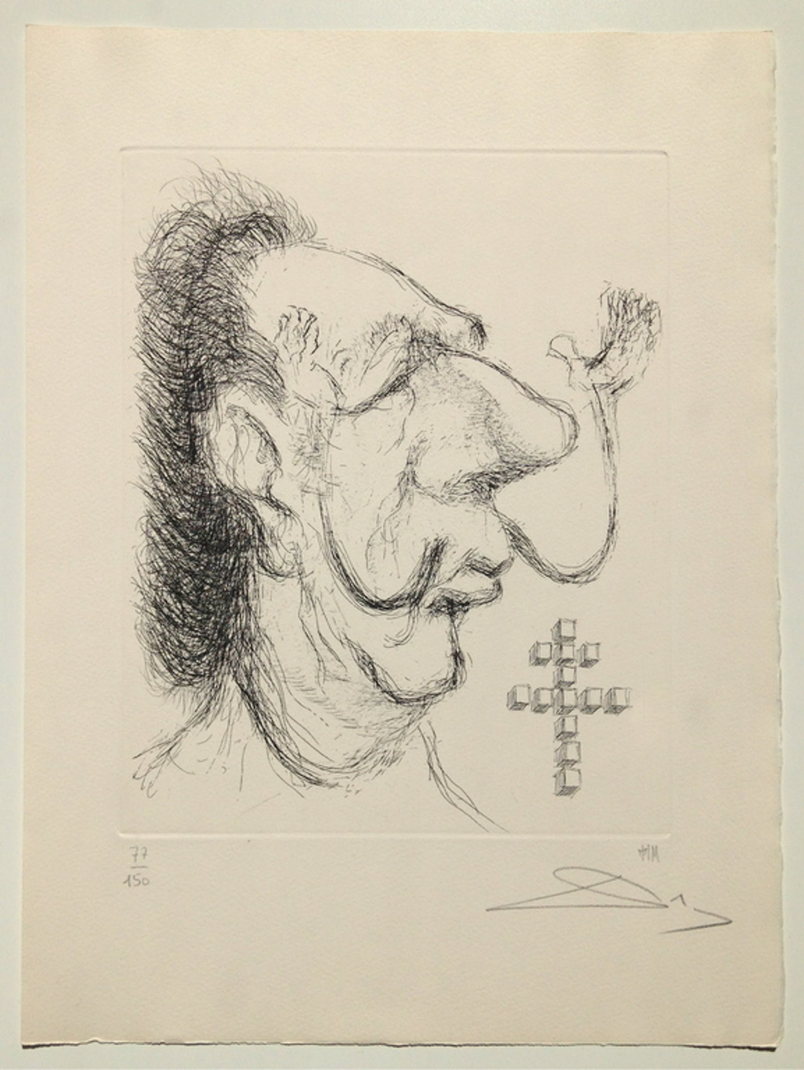 Originele ets van Salvador Dali & Tim Mittelberg voor Proces en Diffamation uit 1971. Op Velin d'Arches. Rechtsonder handgesigneerd (potlood) door Dali en Mittelberg.
