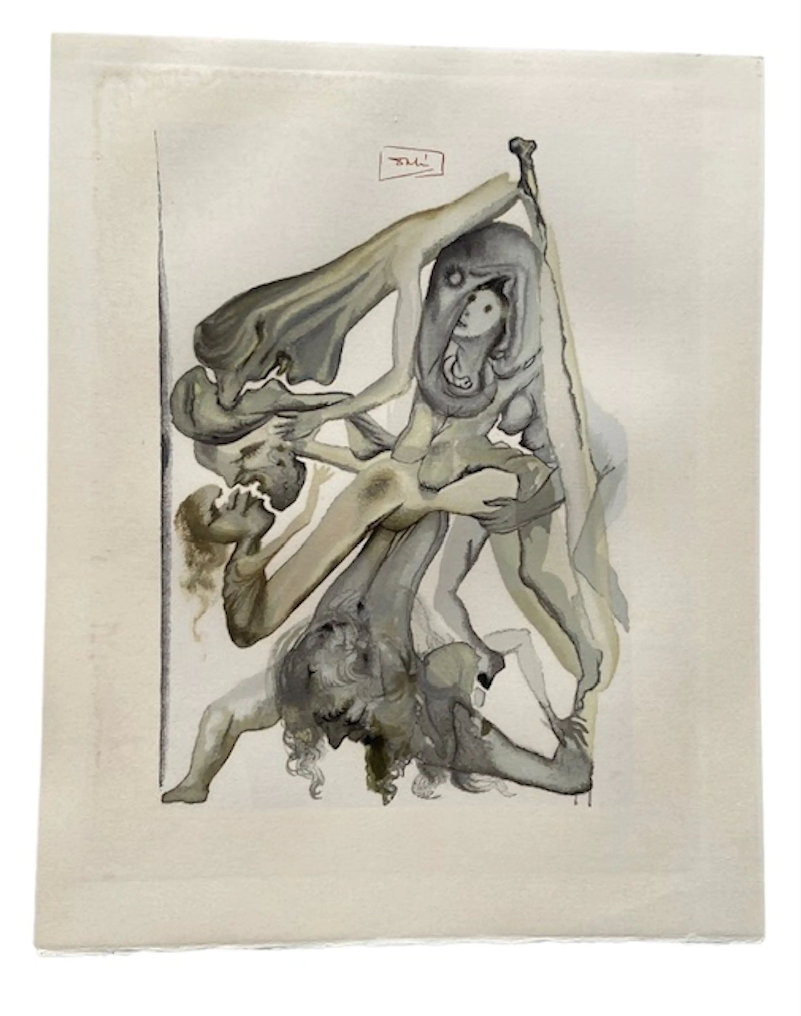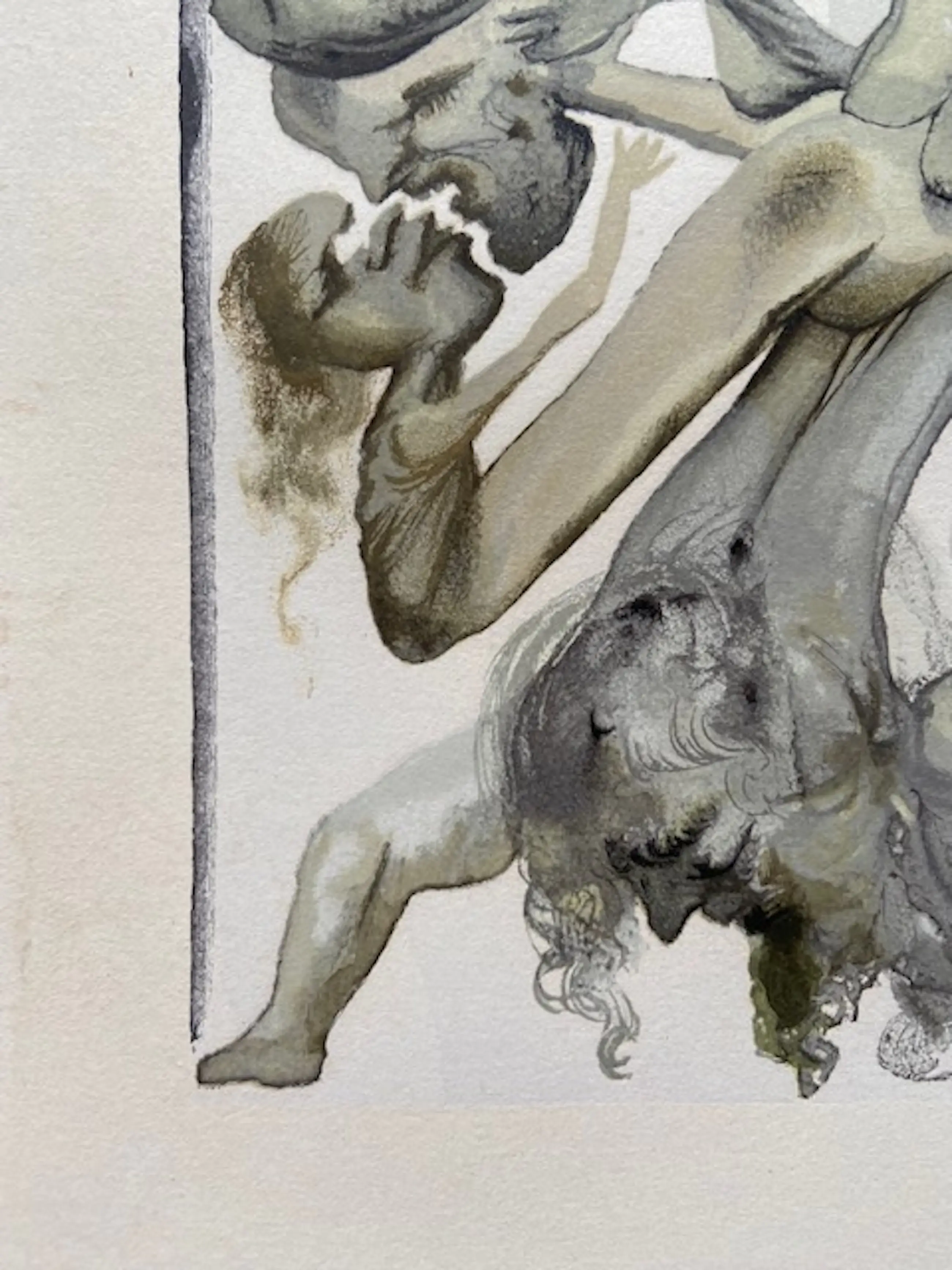 Orgineel houtsnede op papier. Er zijn er destijds 100 van gemaakt echter niet genummerd. 'The Divine Comedy' is van Dante Alighieri. Dit exemplaar is gesigneerd in de druk (zie de signatuur in het rood). In goede staat echter heeft het in een passe partout gezeten en heeft daarom dat kleurverschil in de rand, zie foto.