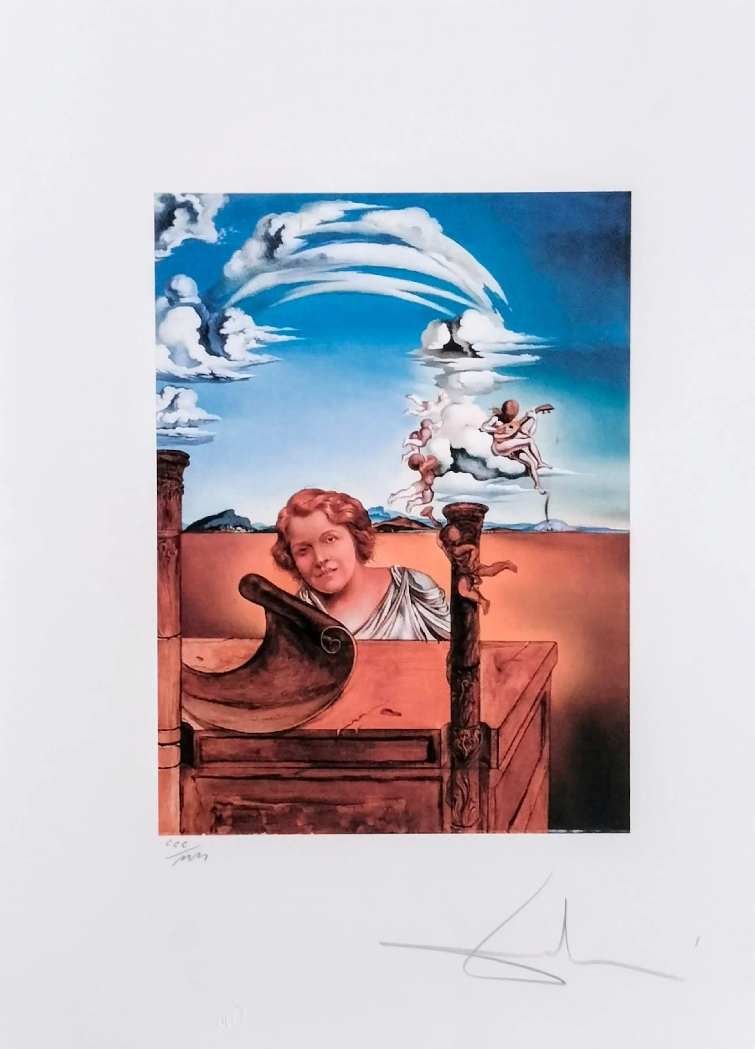Salvador Dali (1904-1989) - "Landschap met dame aan piano en musicerende engelen" - Een zeefdruk van een origineel werk van Salvador Dali. Dit is nummer CCC/MM, oftewel 300/2000. Het werk is op geschept papier gedrukt en met potlood gesigneerd. Tevens is er een blinddruk van Dali/Gala in het papier. In het verleden heeft Dali tegen betaling duizenden lege vellen voorzien van een handtekening. Ik heb het werk van een kunsthandelaar uit Figueras. Het werk meet 66 x 50 cm. Wordt aangetekend in koker verstuurd.