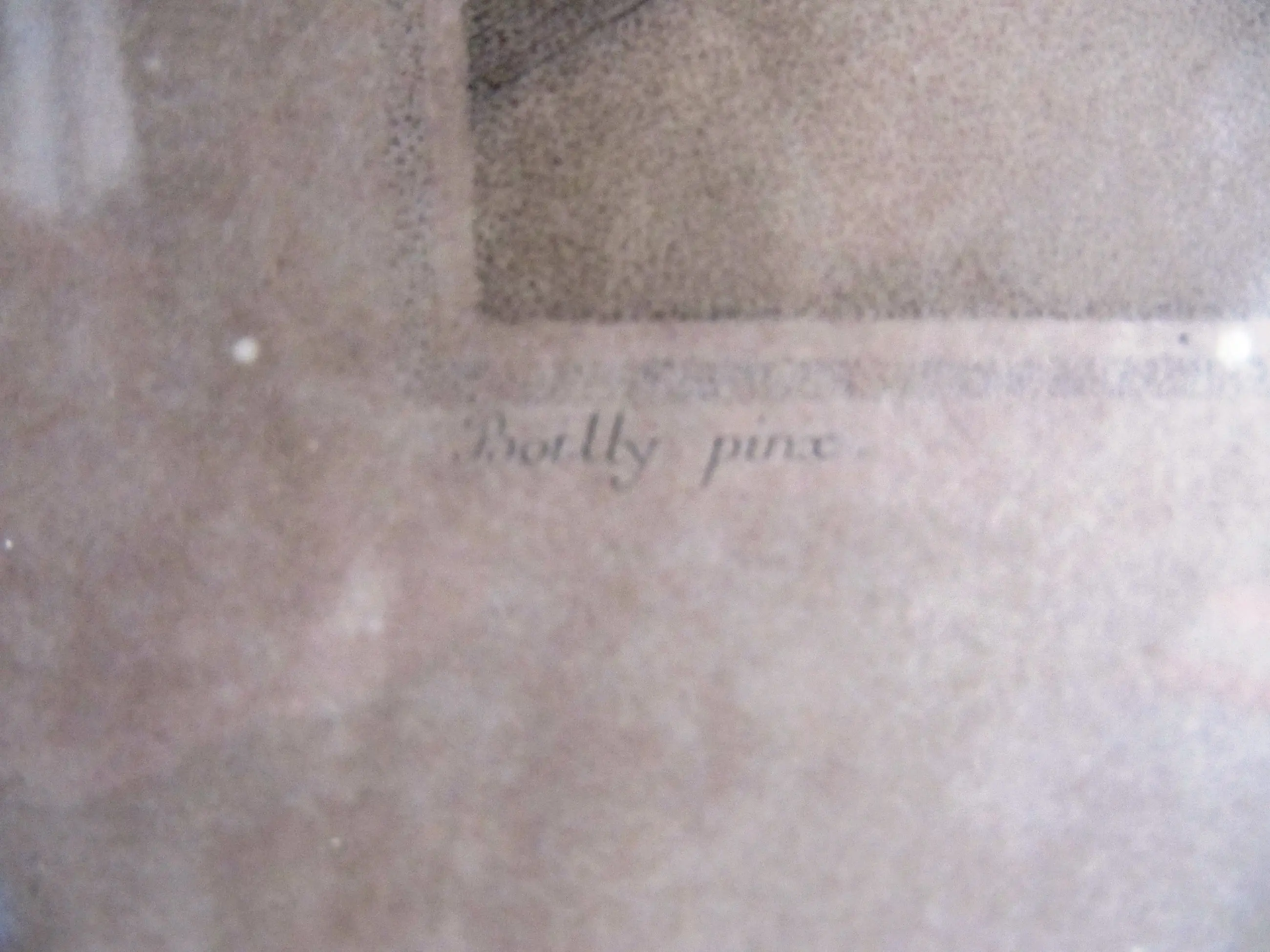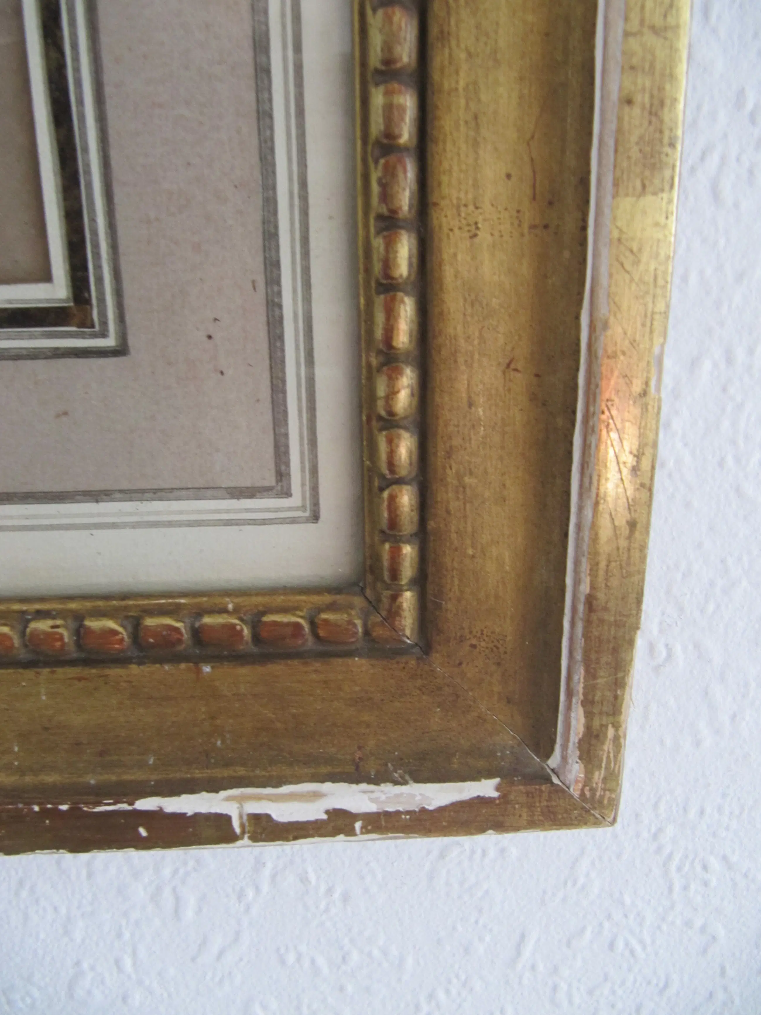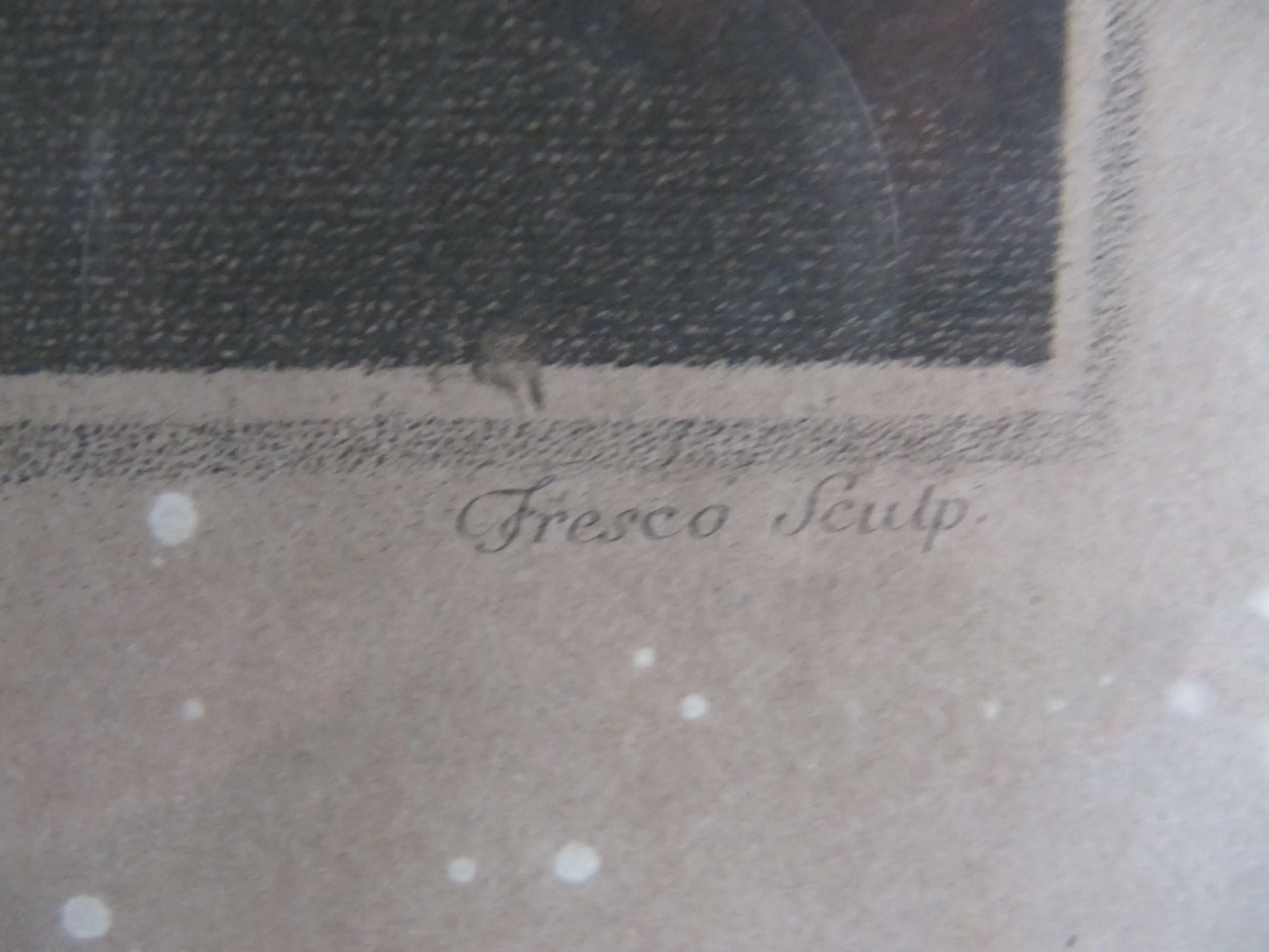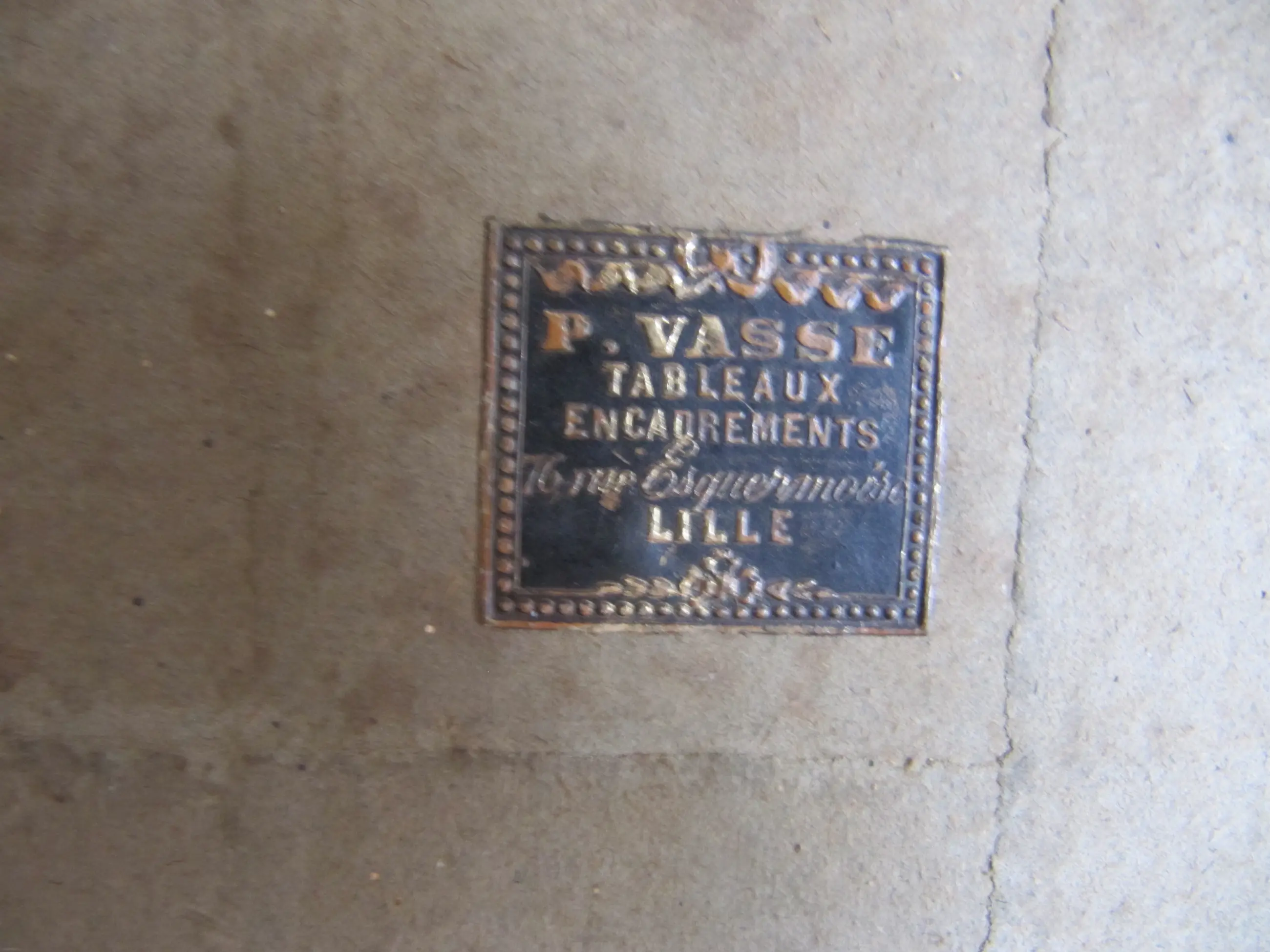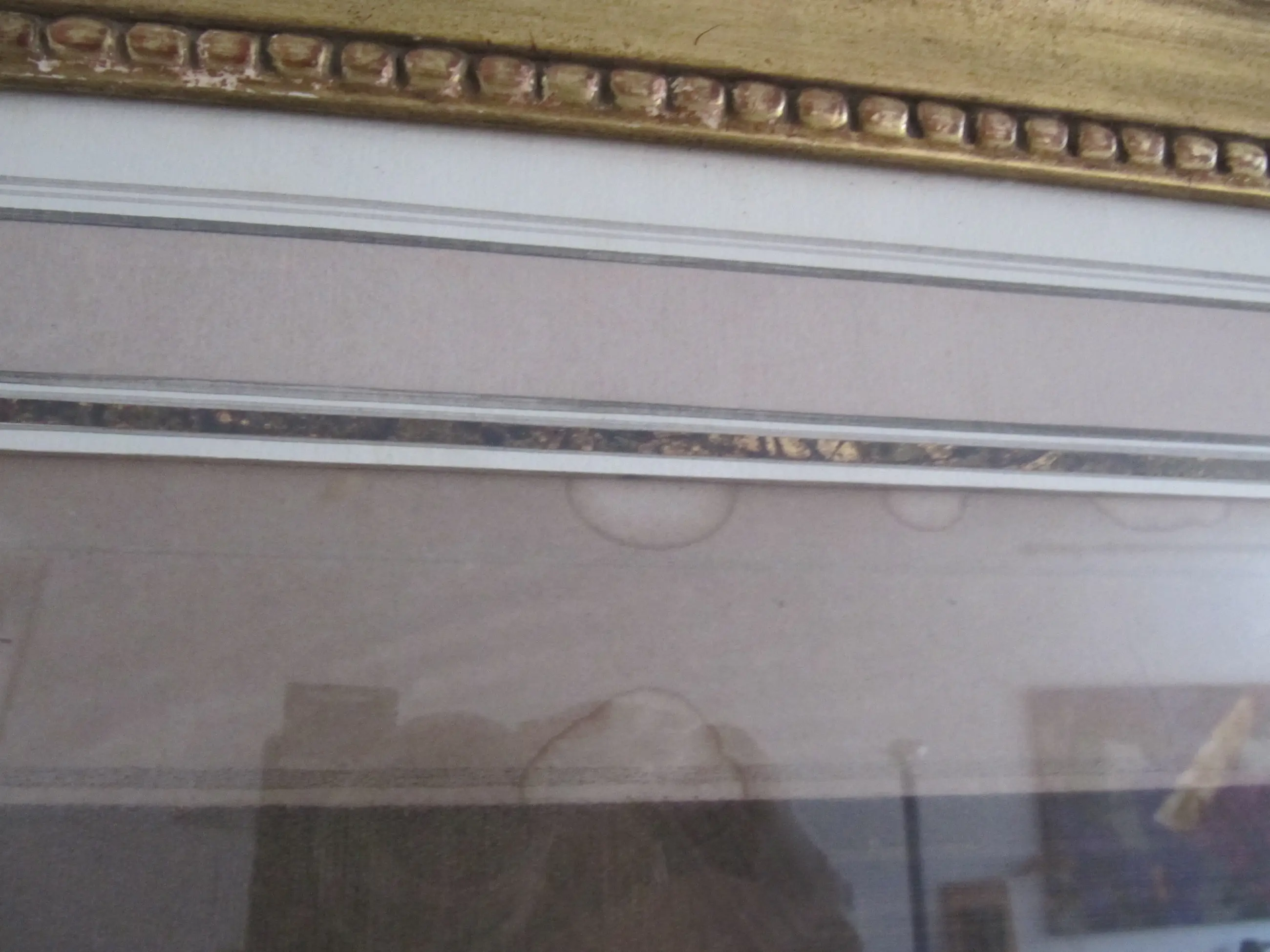 De lithografie is ingelijst in een rechthoekige vergulde houten lijst, omringd door een klein 'parelsnoer'-motief.Hoogte /breedte74/61,5