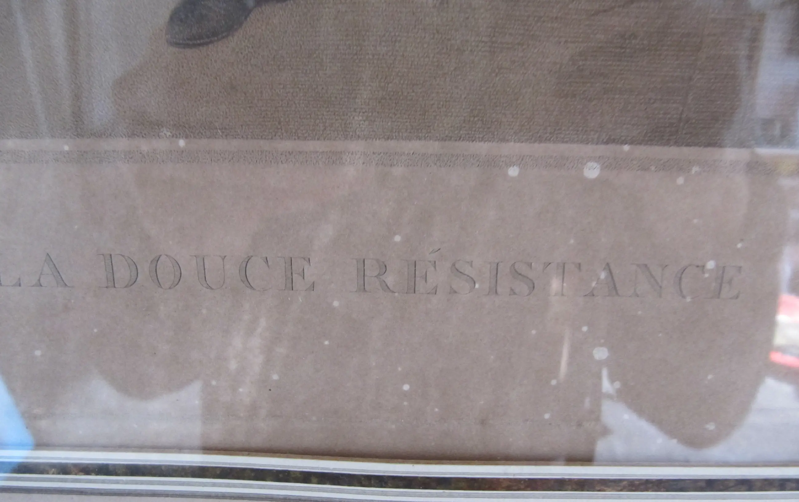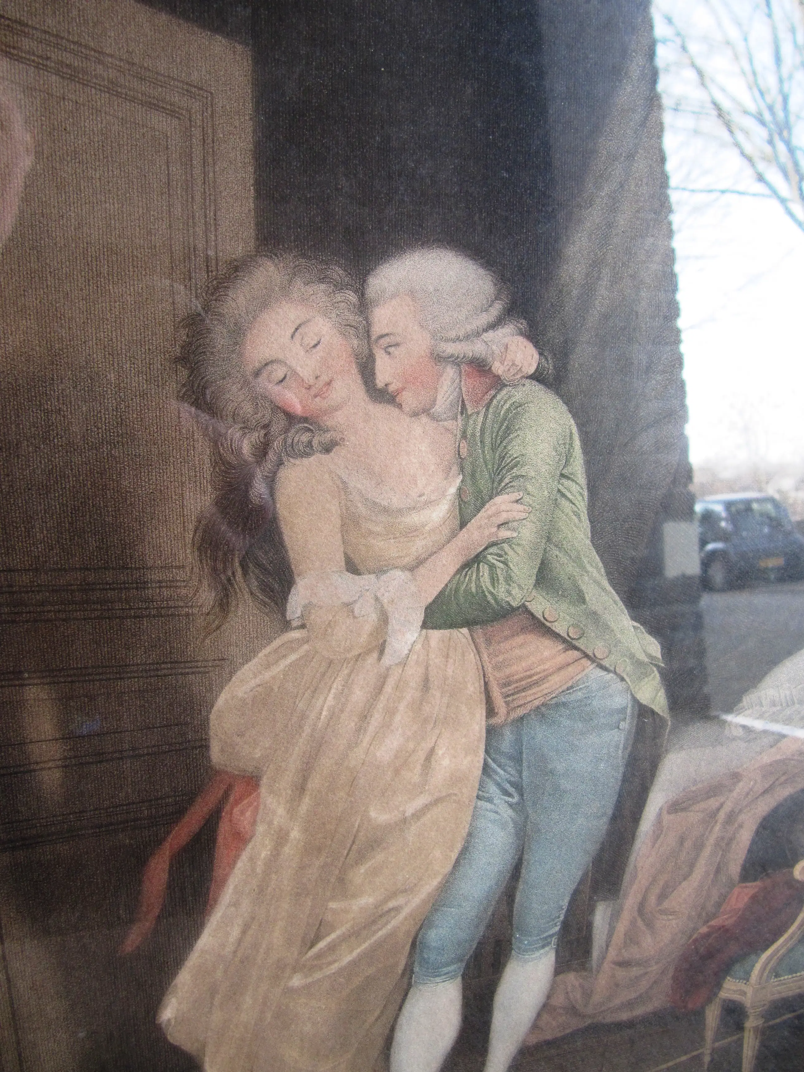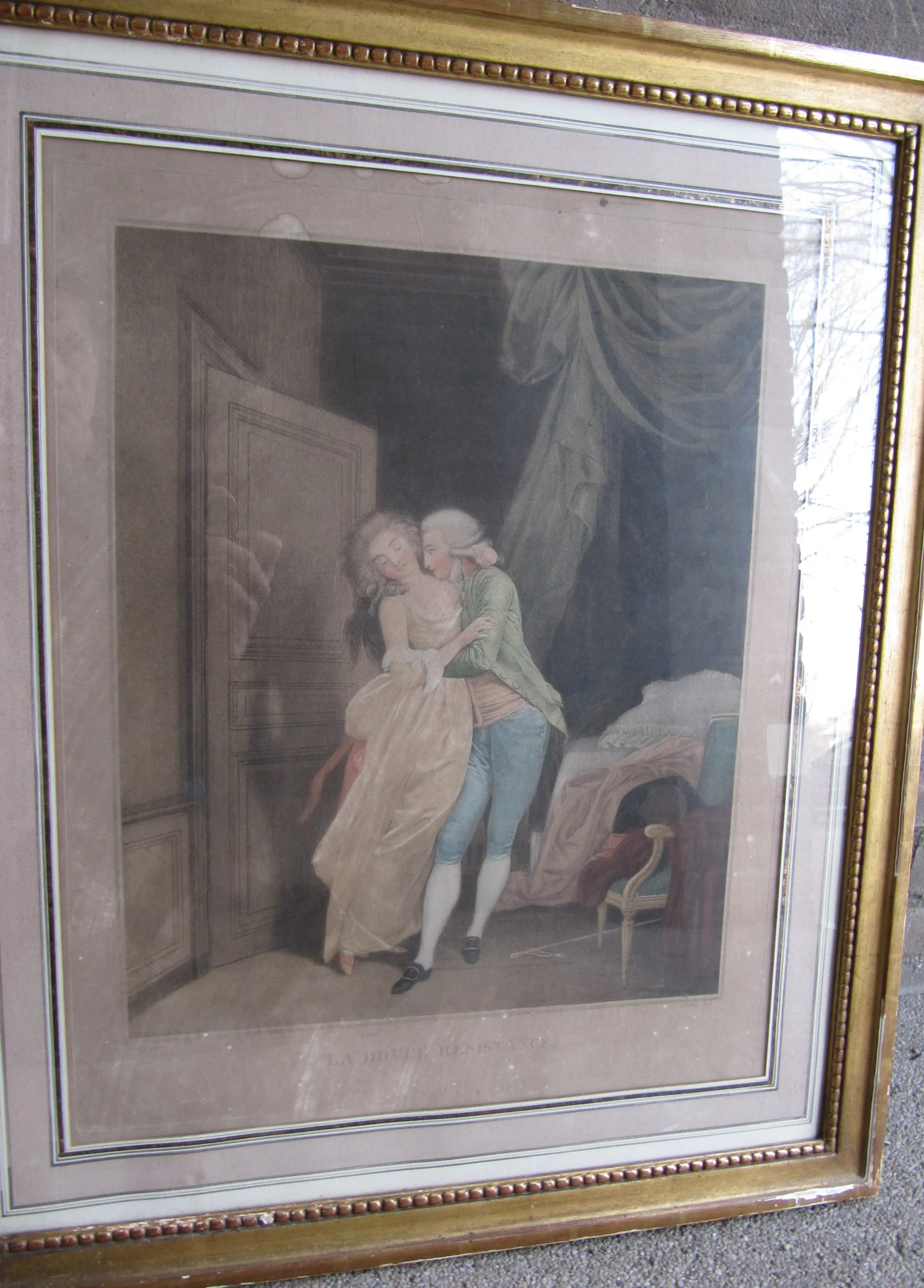 Litho gravure/Lithografie van de Italiaanse kunstenaar/graveur Salvatore Tresca (1750-1815) naar een origineel schilderij van de Franse kunstenaar Louis-Léopold Boilly (1761-1845) getiteld 'La Douce Résistance' (De Zoete Weerstand).