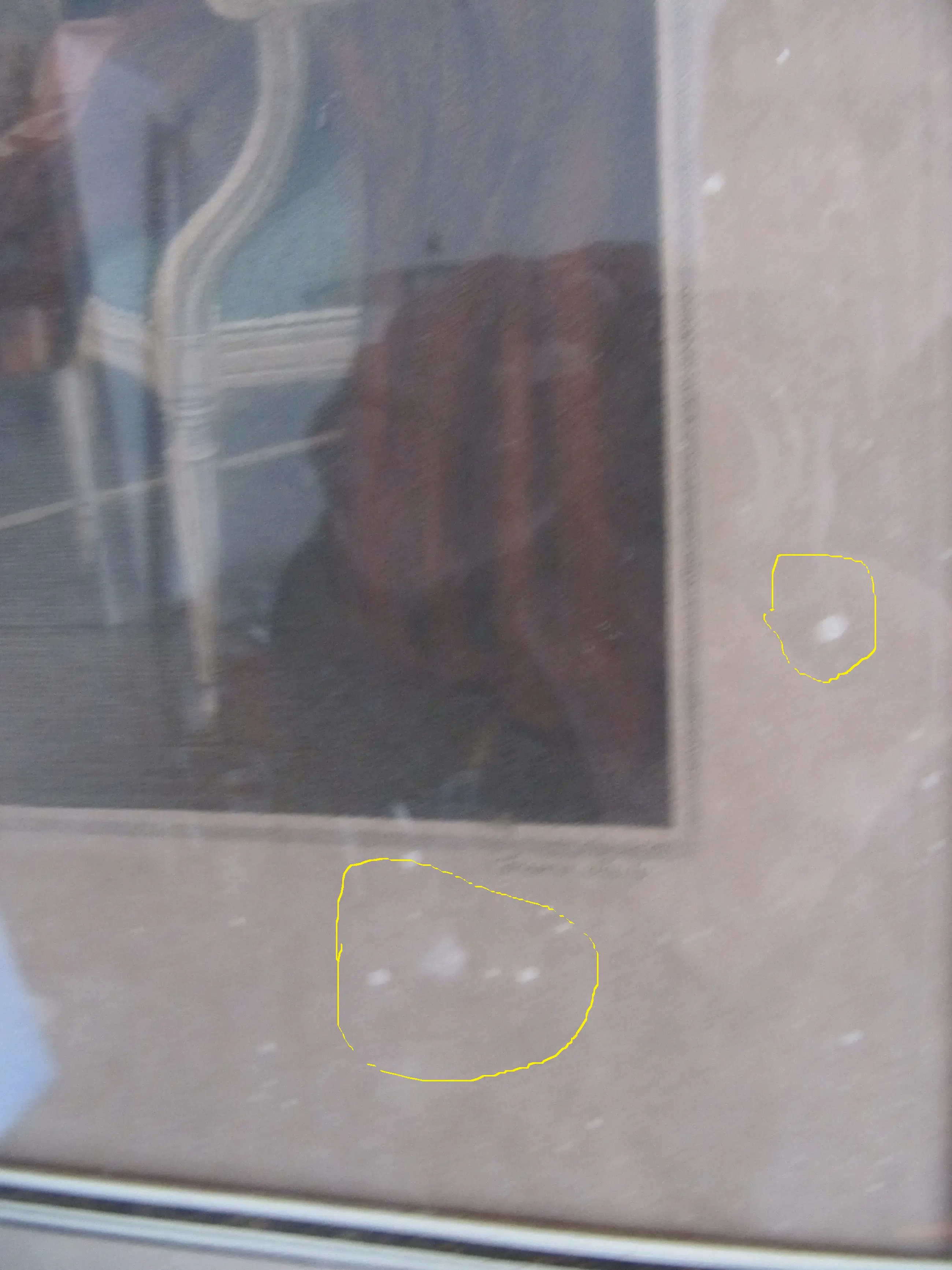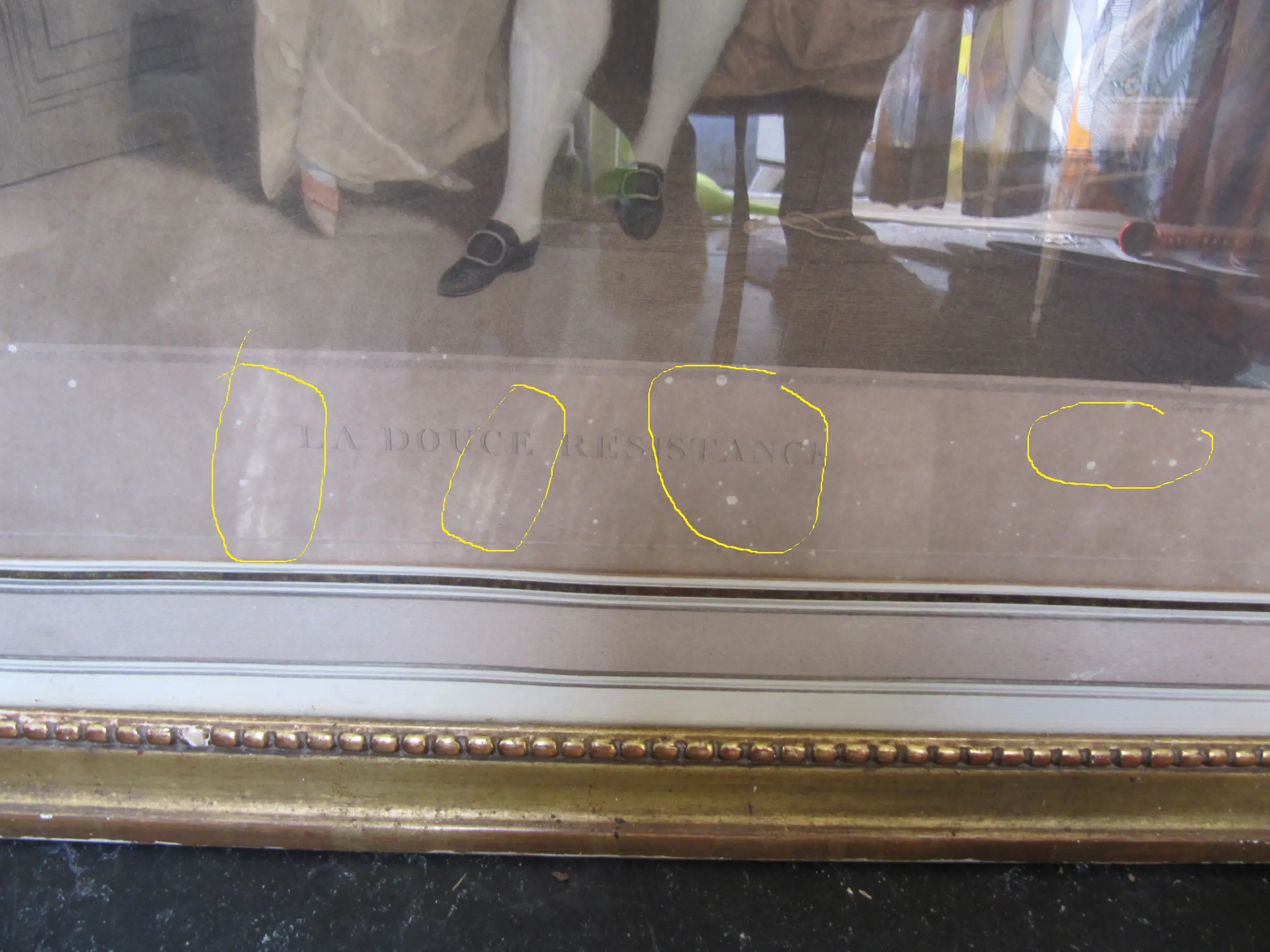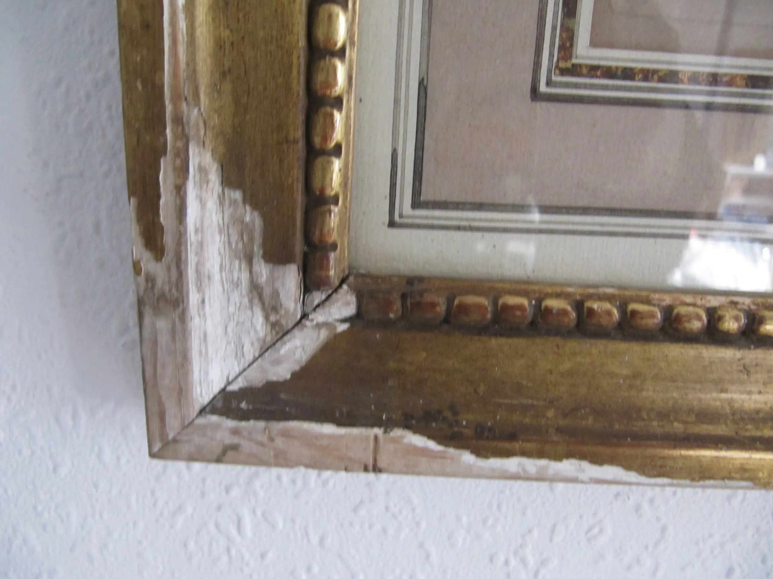 afbeelding zelf 40/45 cmLichte beschadiging buitenrand lijst(afb10,11), vochtplekjes linksboven ( afb 12) en wat witte stipjes/vlekken in het kader(afb 13,14),afbeelding zelf netjes