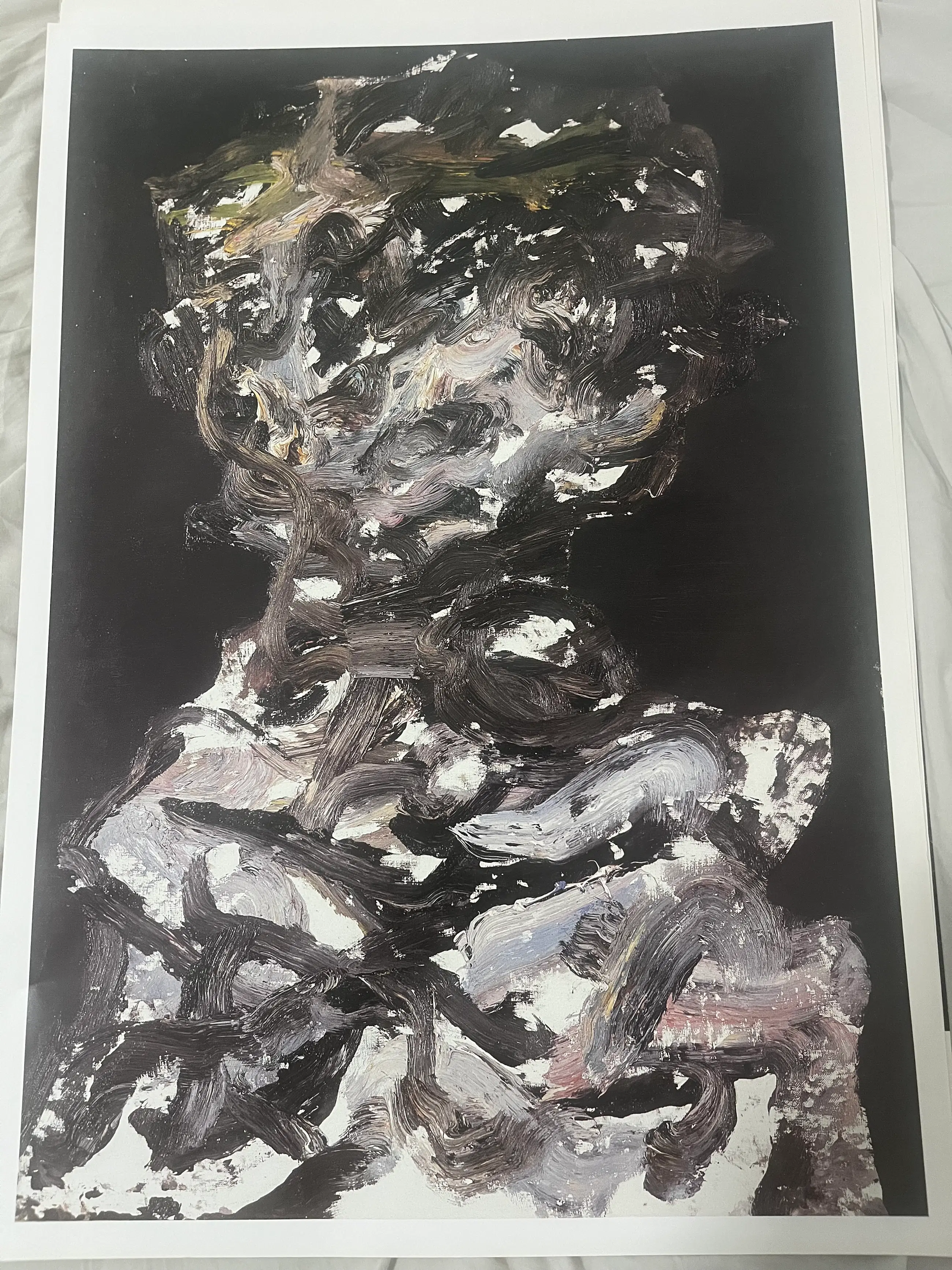 Het schilderij toont een menselijke figuur die onmiddellijk de aandacht naar zich toe trekt door haar sterke aanwezigheid. Het gezicht vormt het hart van het werk en draagt een stille maar voelbare emotie. Brede, levendige penseelstreken geven het beeld een gevoel van beweging en energie. Dikke lagen verf zorgen voor een tastbare, bijna lichamelijke kwaliteit. De kleuren zijn expressief gekozen en versterken de sfeer meer dan de werkelijkheid. De sobere achtergrond laat de figuur krachtig naar voren treden. Subtiele vervormingen brengen spanning en karakter in het portret. Het geheel voelt spontaan, alsof het in één intense beweging is geschilderd. De figuur straalt tegelijk kwetsbaarheid en innerlijke kracht uit. Samen vormen deze elementen een indringend portret waarin aanwezigheid en emotie centraal staan.