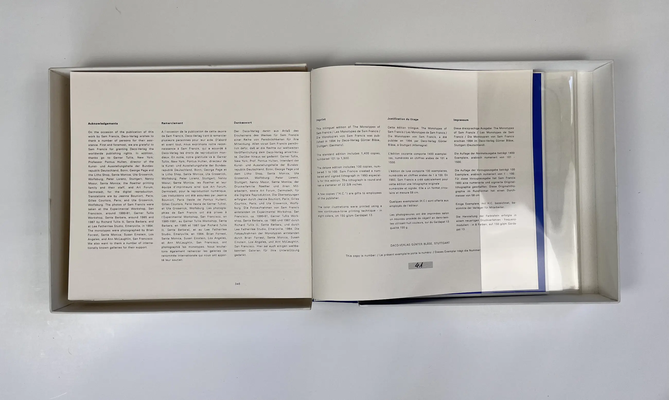 Mooi werk van de internationale kunstenaar Sam Francis met lijst. Een werk dat zo aan de muur kan worden gehangen! De lijst is niet nieuw maar prima toonbaar. Bij het werk hoort ook een cassette met een boek Die monotypien von Sam Francis. Het boek en de litho zijn genummerd 41/100. De litho is rond! Met een doorsnede van 58 cm. Het boek is uitbegrbacht in 1994 door Daco-Verslag Gunter Blase, Stuttgart (Duitsland). U kunt het werk vooraf komen bekijken in de Schatkamer van galerie Rotor in Gorcum, na aankoop afhalen of verzenden per koerier met lijst toegestuurd krijgen in Nederland en België. De foto is door het glas van de lijst heen genomen. Er zit een extra foto bij van de signatuur.